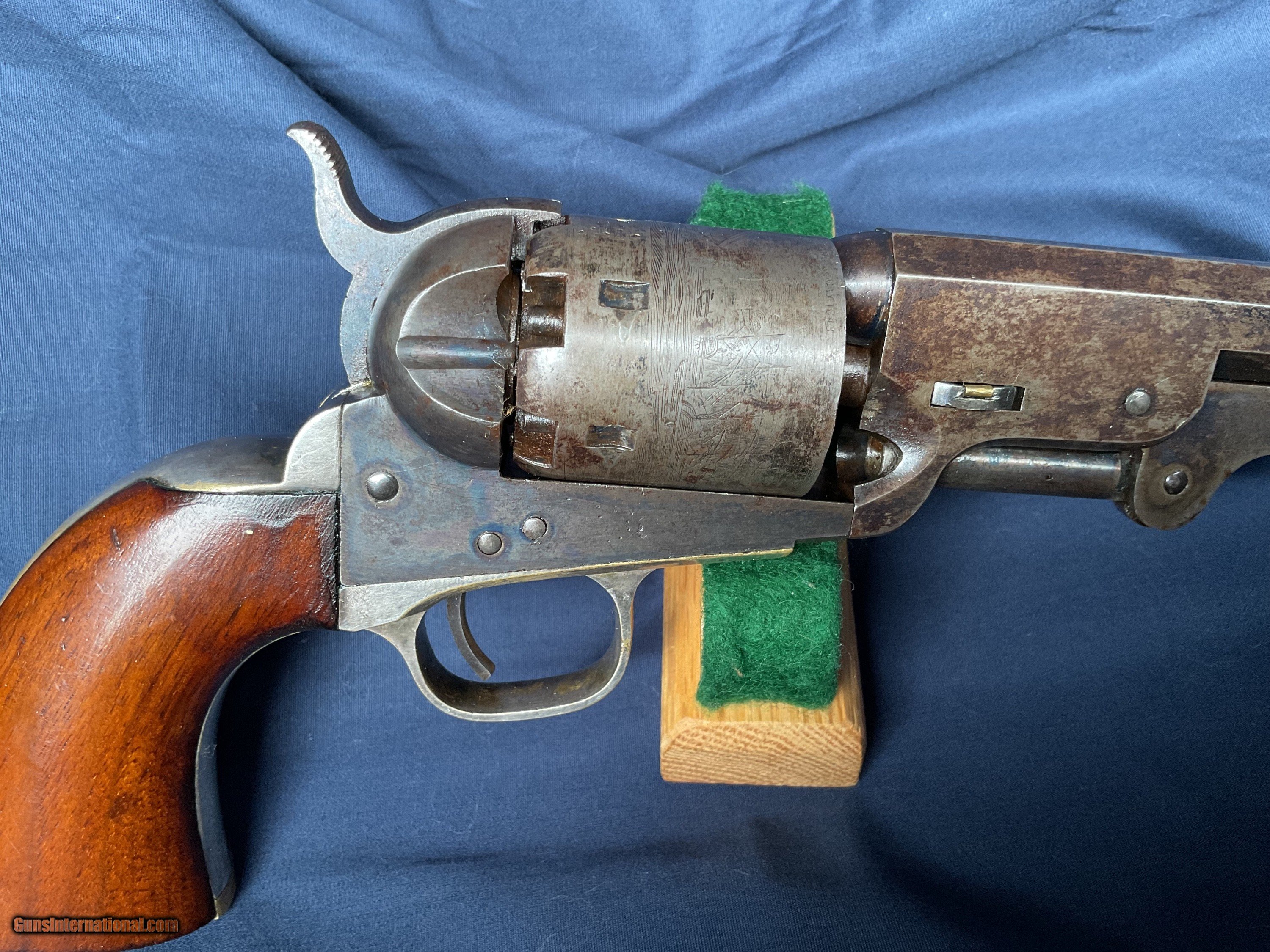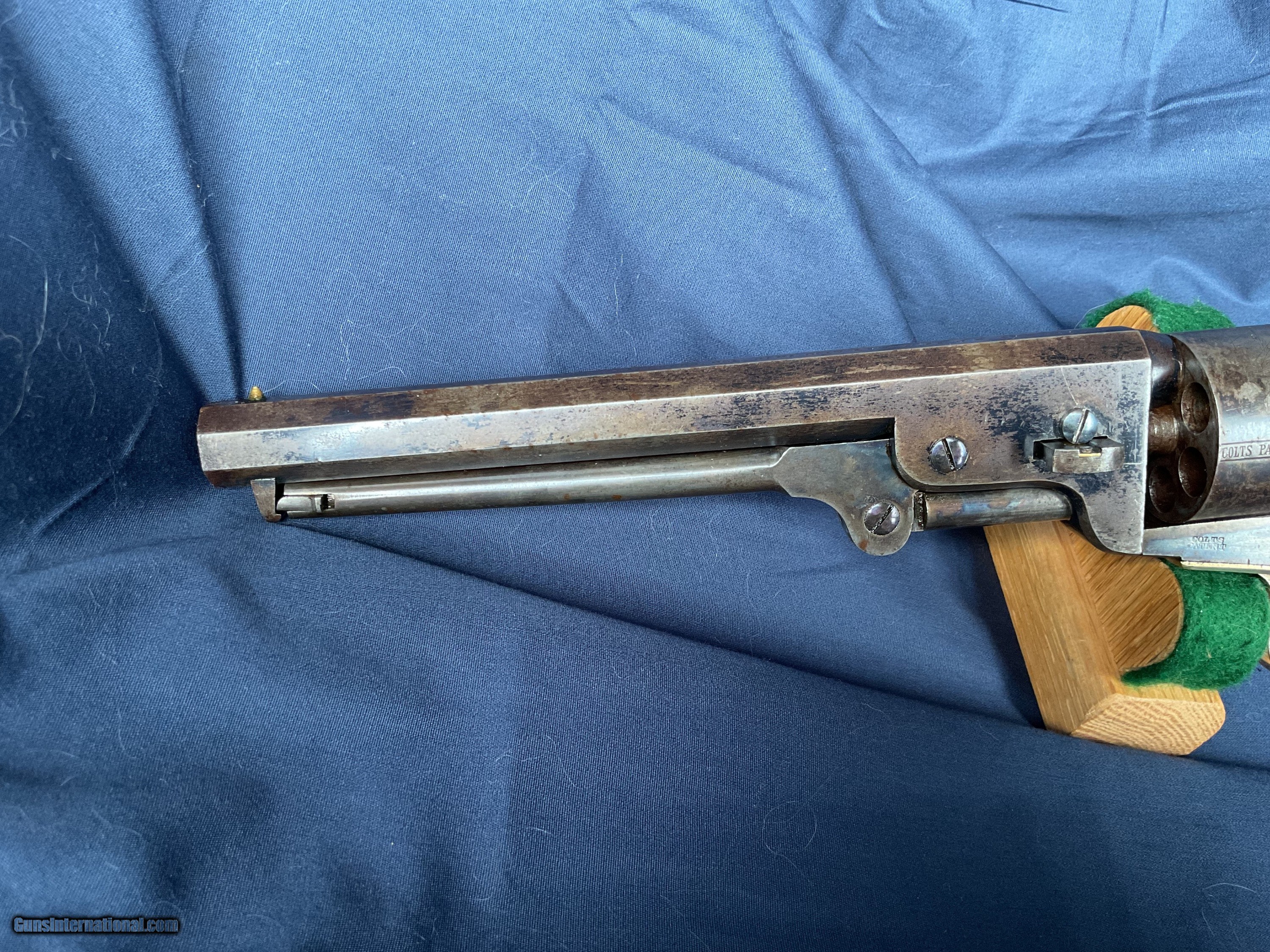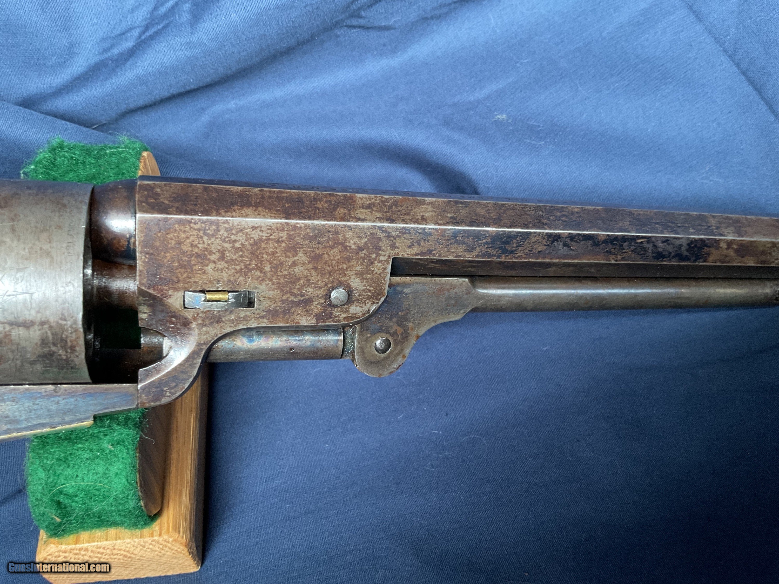 Description: Very nice condition 1851 Colt Navy .36 caliber manufactured in 1863. 7 1/2" barrel retains some nice blue with the remainder a pleasing brown / gray patina. Very nice bore, I will rate it a 8.5 on a scale from 1 to 10. Excellent cylinder scene remains intact. Partial cylinder safety pins still exist. Action functions smoothly. All markings are sharp and crisp. 70 -75% original case colors are present on frame. All numbers match: barrel, loading lever, cylinder, cylinder pin, wedge, frame, trigger guard, and backstrap. Grips are in very good condition. This a well above average condition 1851 Colt Navy with an abundance of case colors still remaining. Don't miss your chance to own a sought after 1851 Colt that was made in the middle of the Civil War. I do offer a layaway (please contact me for the full details). I will also consider trades and offers. Please feel free to ask questions. SOLD Antique: Yes |