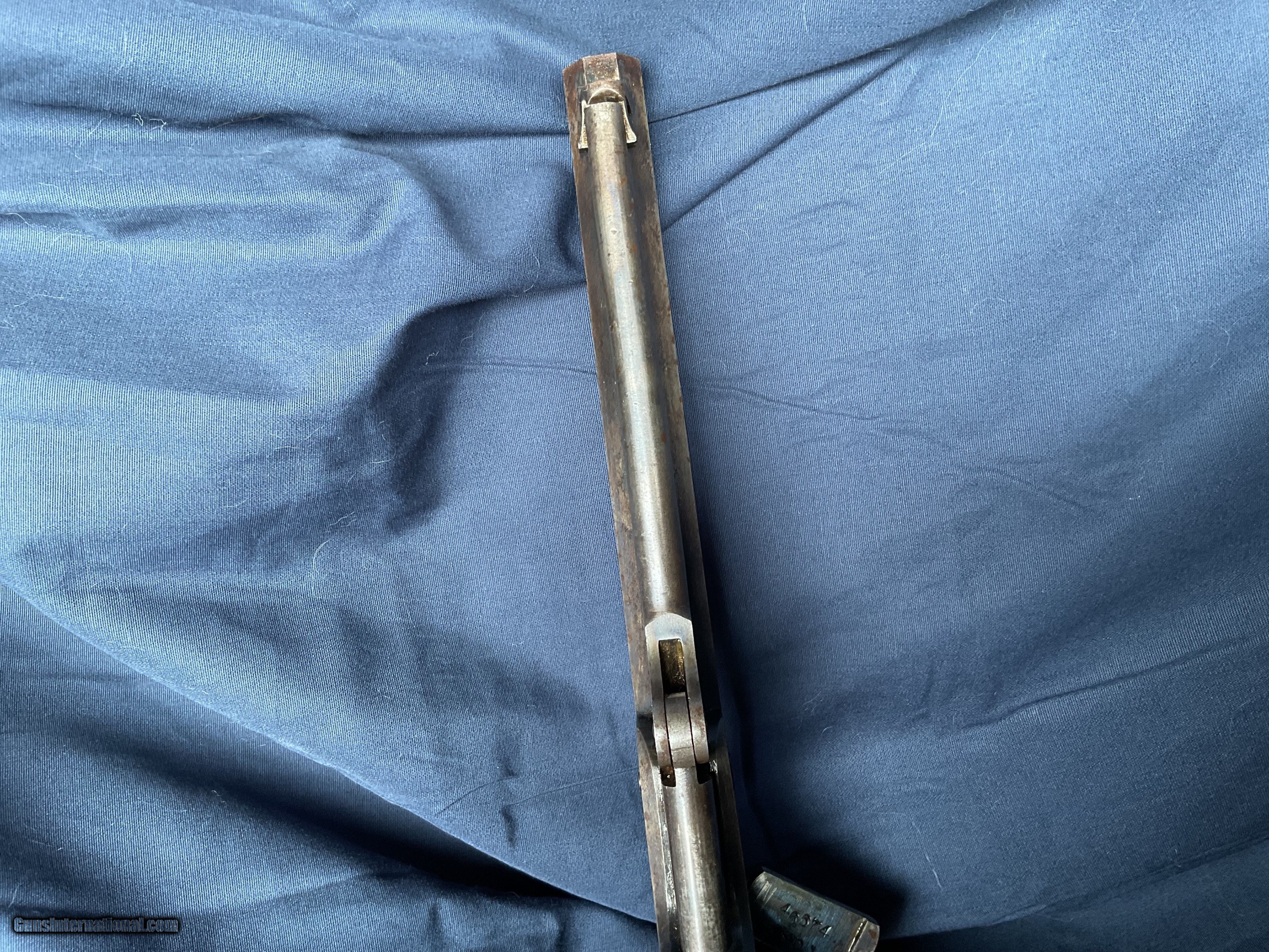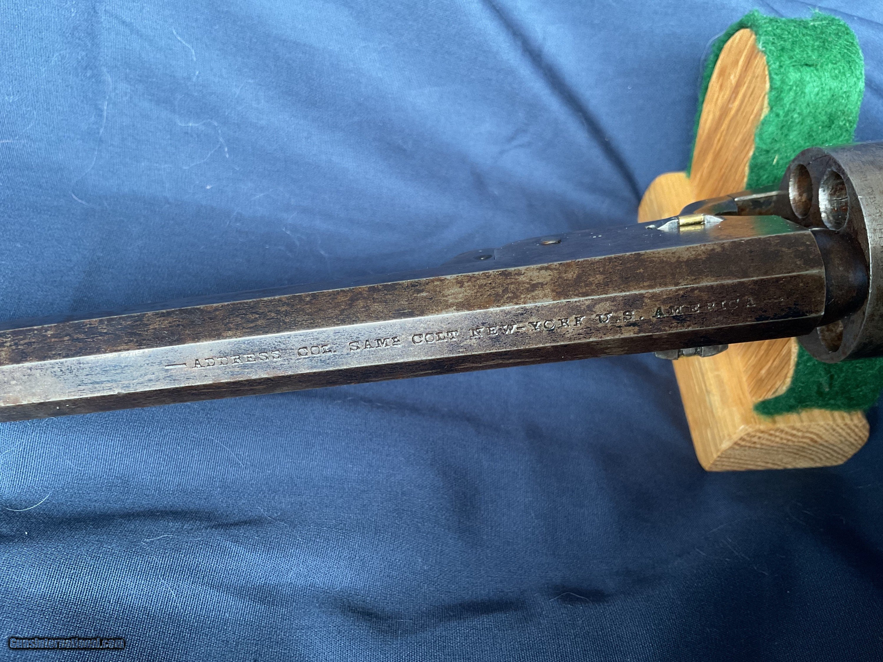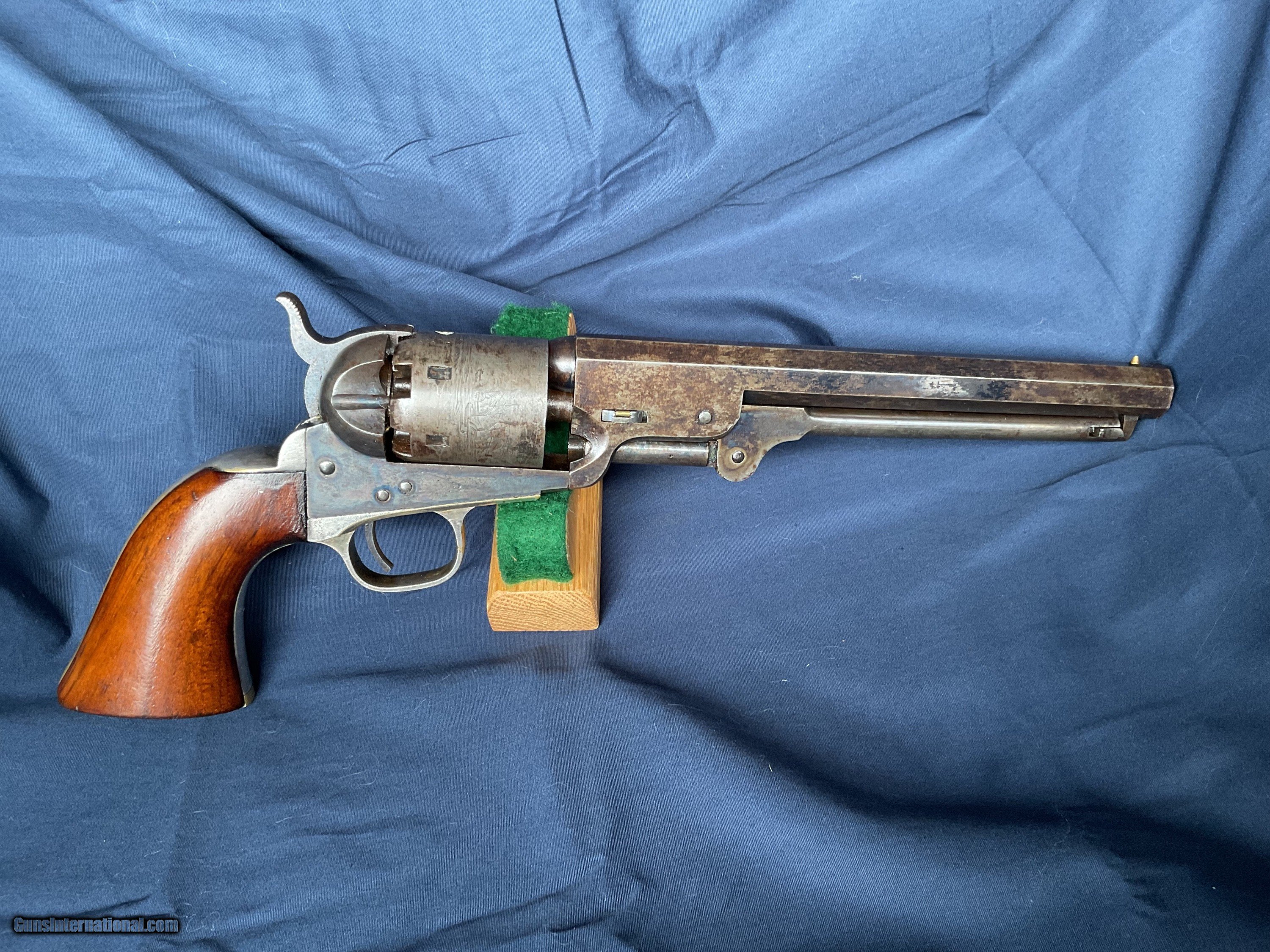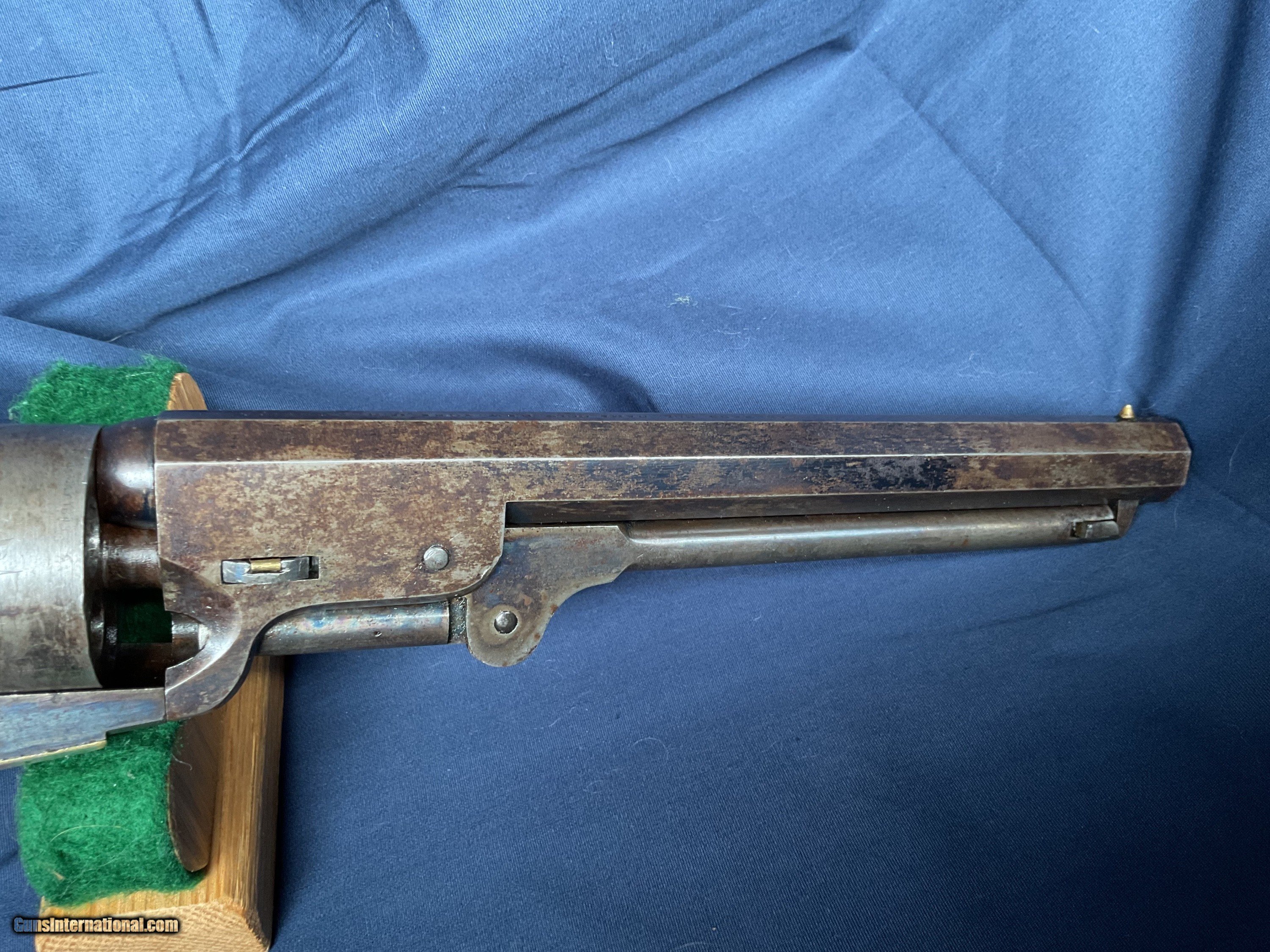 Description: Very nice condition 1851 Colt Navy .36 caliber manufactured in 1863. 7 1/2" barrel retains some nice blue with the remainder a pleasing brown / gray patina. Very nice bore, I will rate it a 8.5 on a scale from 1 to 10. Excellent cylinder scene remains intact. Partial cylinder safety pins still exist. Action functions smoothly. All markings are sharp and crisp. 70 -75% original case colors are present on frame. All numbers match: barrel, loading lever, cylinder, cylinder pin, wedge, frame, trigger guard, and backstrap. Grips are in very good condition. This a well above average condition 1851 Colt Navy with an abundance of case colors still remaining. Don't miss your chance to own a sought after 1851 Colt that was made in the middle of the Civil War. I do offer a layaway (please contact me for the full details). I will also consider trades and offers. Please feel free to ask questions. SOLD Antique: Yes |