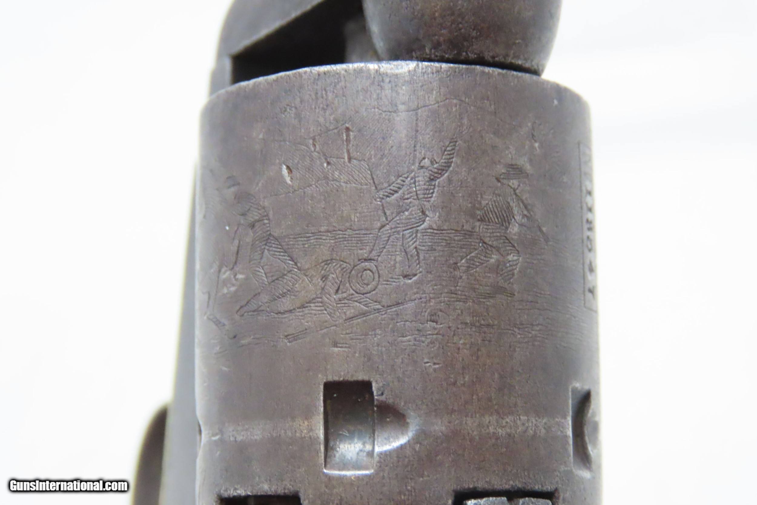 Description: VERY SCARCE Antique “WELLS FARGO” Model COLT 1849 .31 Cal. POCKET Revolver DESIRABLE Antebellum Pocket Revolver Made in 1856 Here we present an antique Colt 1849 Pocket Revolver “Wells Fargo Model”, made in 1856 in Hartford, Connecticut. Though over 340,000 1849 Pocket Revolvers were produced by Colt’s factory at Hartford, only a mere 4,000 of them were produced in this configuration with a 3-inch barrel and no loading lever. These would have been even handier for the pocket than their longer-barreled brethren and have been colloquially called the “Wells Fargo Model”. One of the most aesthetically pleasing aspects of the 1849 Pocket is its cylinder scene. Cylinder scenes during this period were common, especially for Colt, not only for their visual appeal, but because it made a revolver more difficult to forge. The scene on the 1849 Pocket is that of a stagecoach robbery. The focal point is the stagecoach drawn by four horses. A woman in a dress is seen framed in the doorway of the side of the coach. The driver is standing alongside wielding his pistol against multiple assailants as the horses rear and struggle against their harnesses. Several of the bandits lay dying on the ground, one tries to control the horses, two are running away and one is in the process of falling dead after being shot. Not a bad way to show interested buyers what a pistol like this would be good for. It did a fine job as a self-defense handgun for the average citizen in 19th Century America. The overall condition is very good. Robust action. The bore is in good shape for its age. Fine grip with minimal handling wear. Numbers match. The wagon robbery cylinder scene is quite clear. Legible markings. Own the original! This is a legitimate antique and not a reproduction. Barrel is 3 inches. Caliber: .31 Percussion Overall condition as seen in photos. Very Fast. Very Safe. FREE SHIPPING WORLDWIDE. Delivered directly to your door by express mail! Guaranteed AUTHENTIC & Includes CERTIFICATE OF AUTHENTICITY. ancestryguns $4225 #220525 SOLD Antique: Yes |