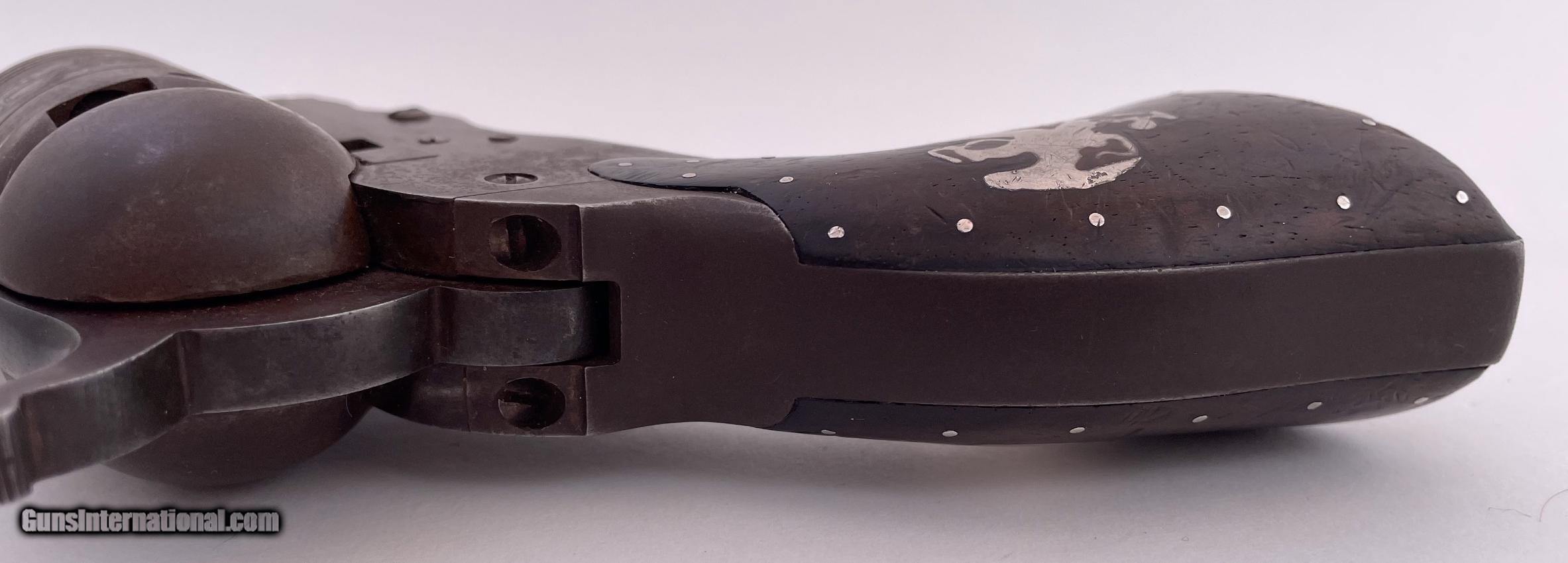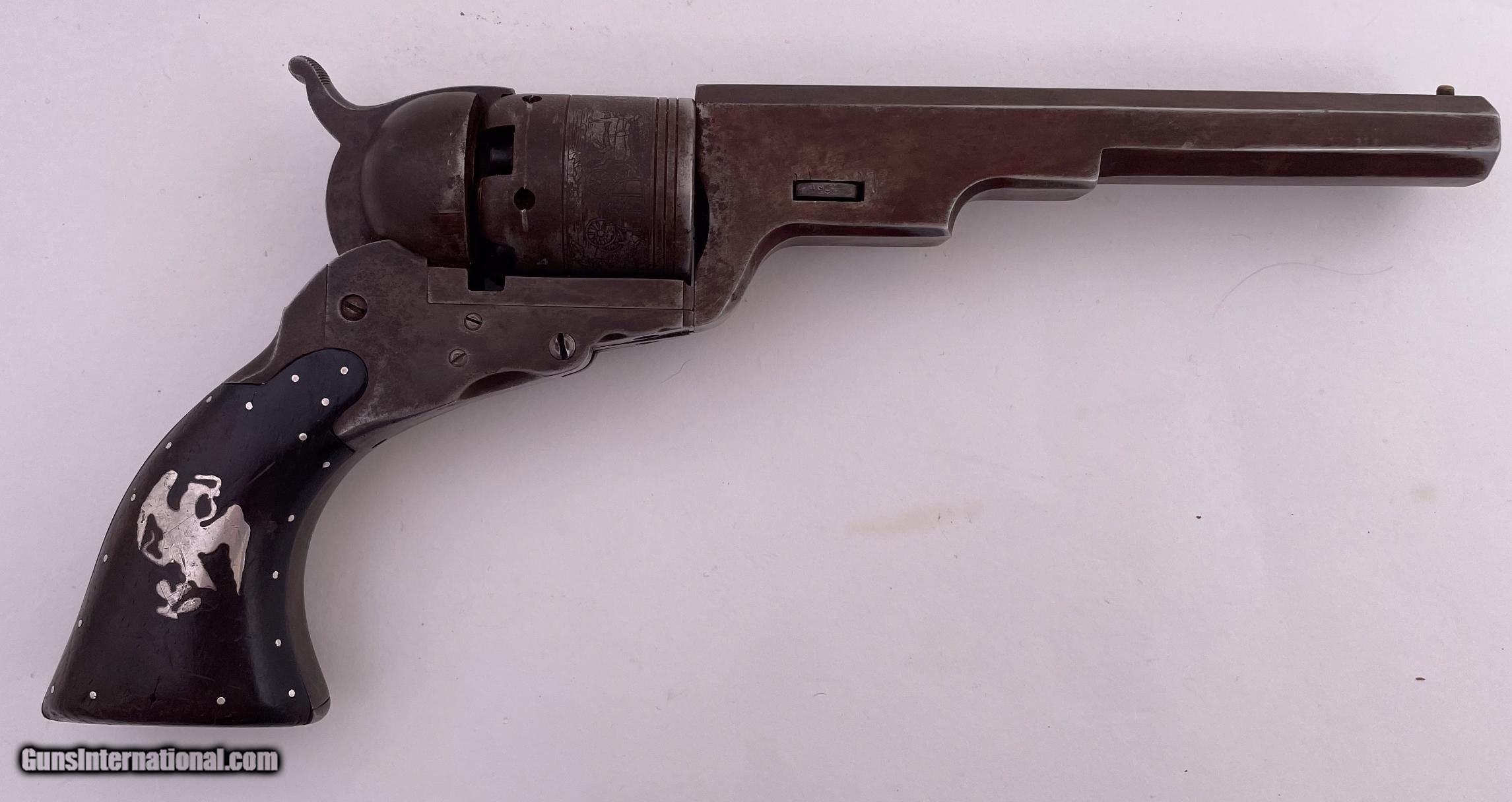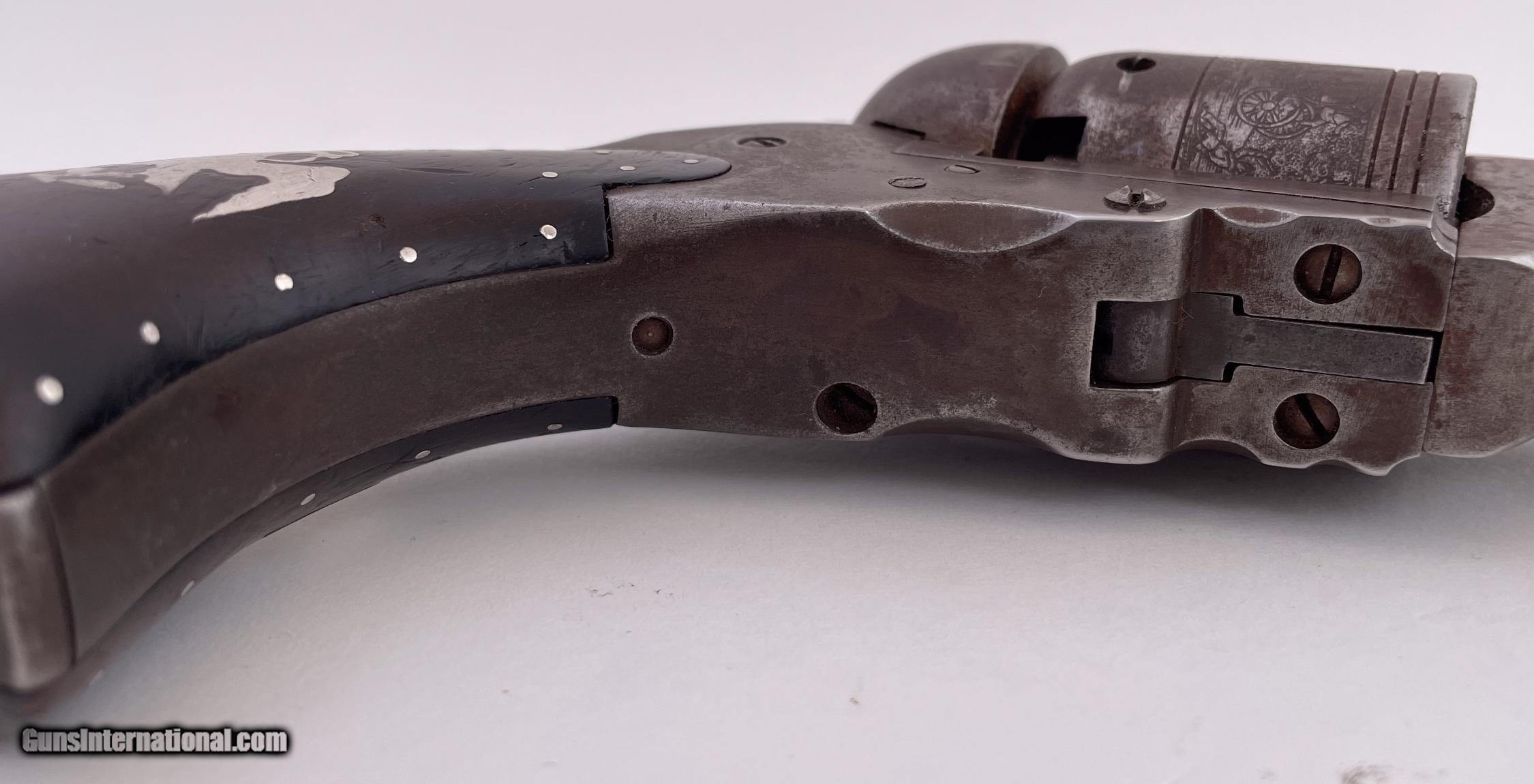 Description: The walnut grips have very nicely done silver inlays of eagle and snake on each side also silver tacks. The bore is rough and the action is good. See photos for condition. Age is unknown. SOLD Antique: Yes Model: Texas Paterson Serial Number: 2127 Barrel Length: 6.25 |