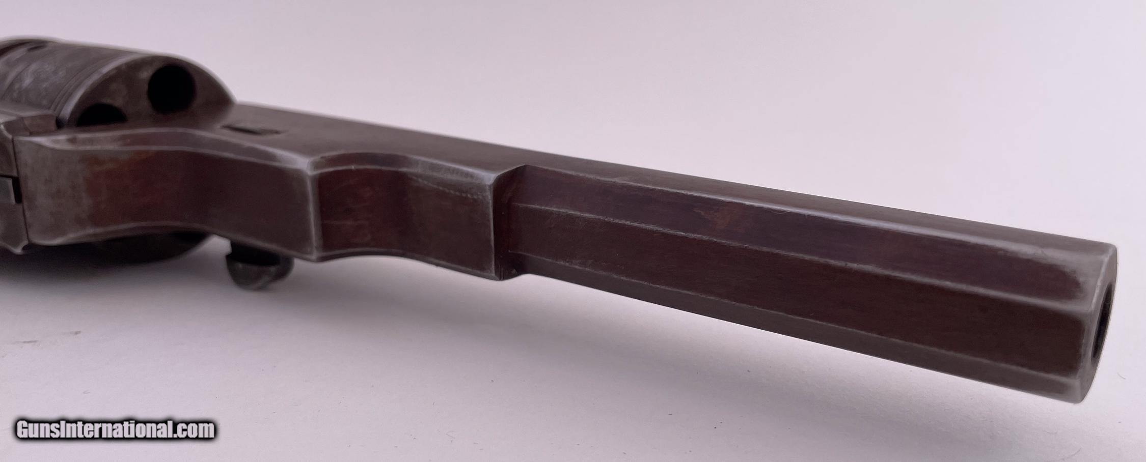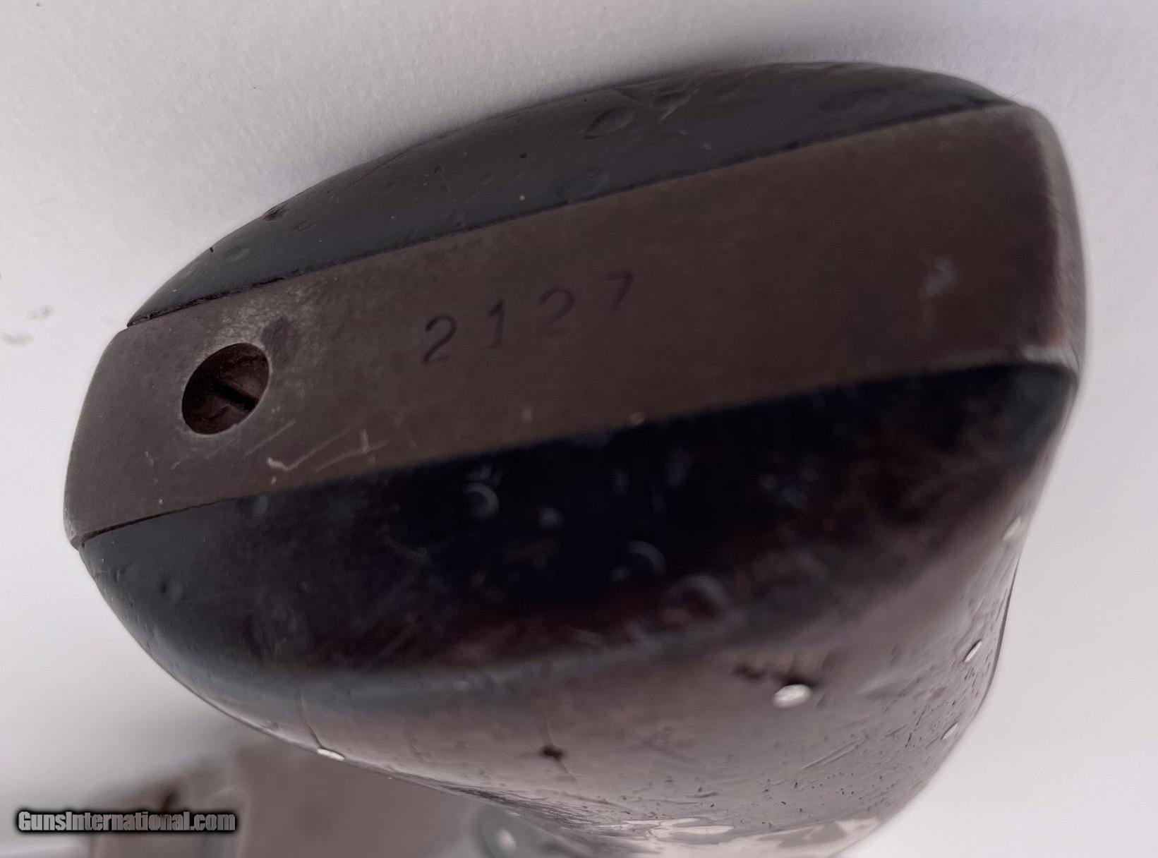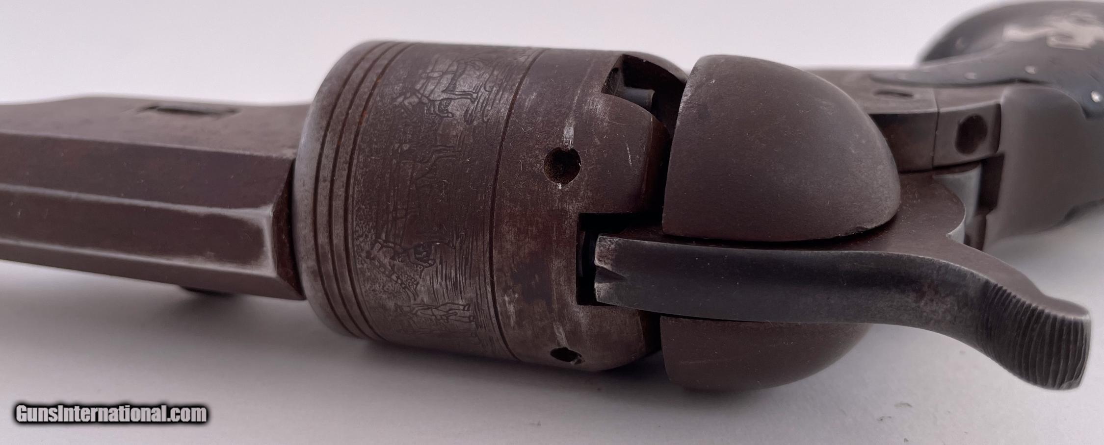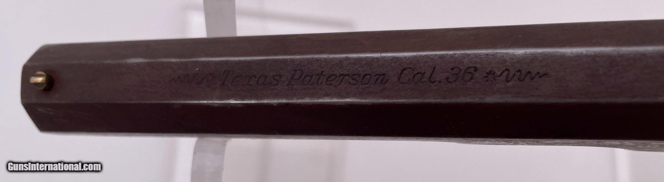 Description: The walnut grips have very nicely done silver inlays of eagle and snake on each side also silver tacks. The bore is rough and the action is good. See photos for condition. Age is unknown. SOLD Antique: Yes Model: Texas Paterson Serial Number: 2127 Barrel Length: 6.25 |