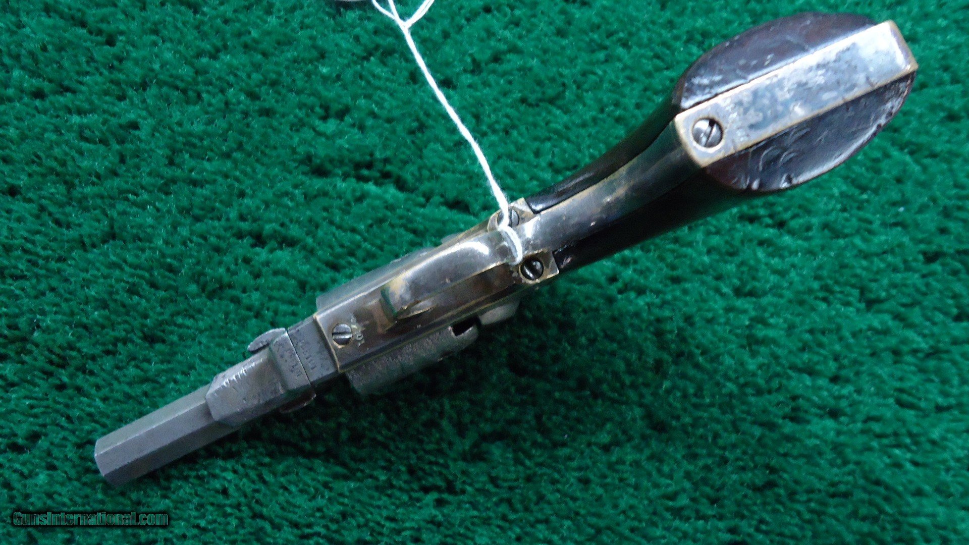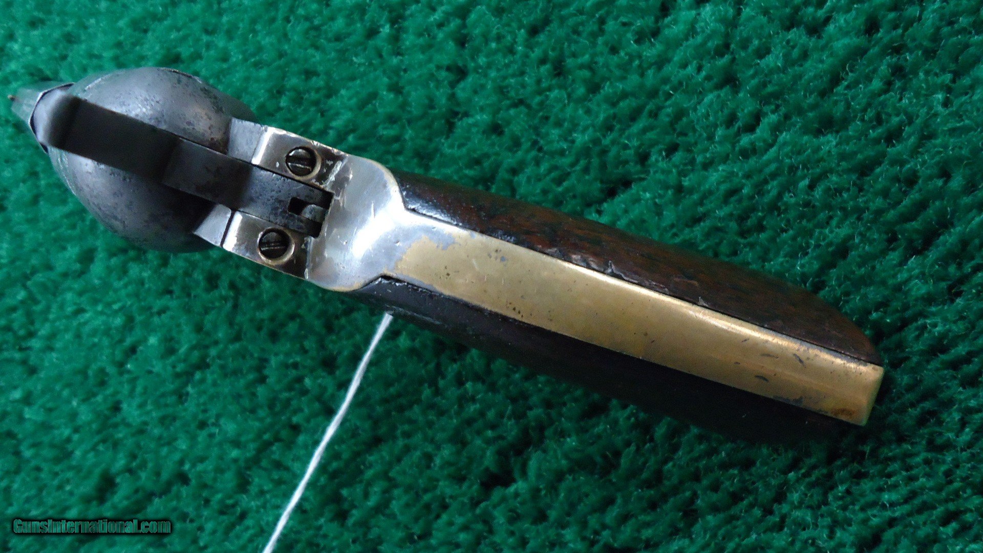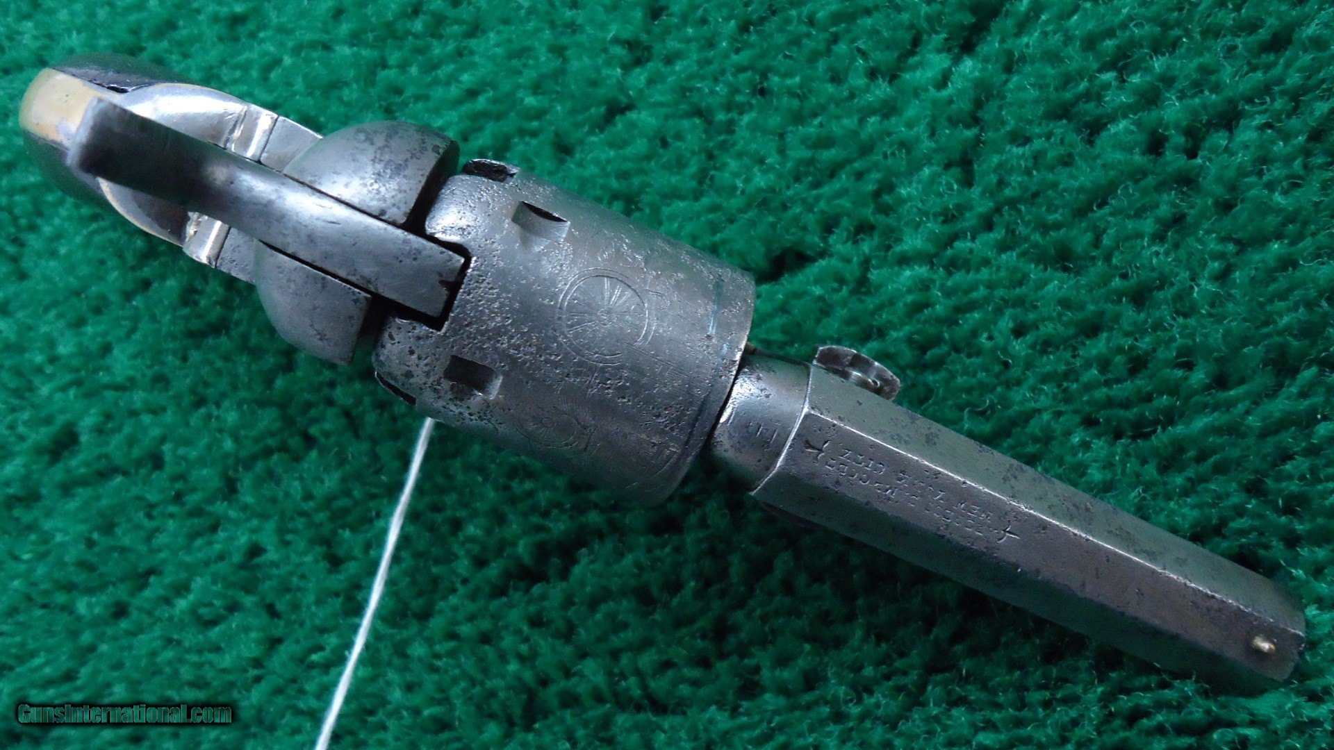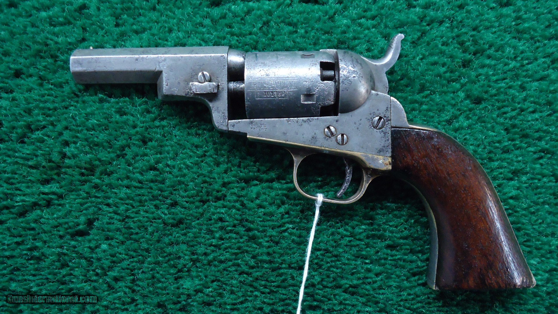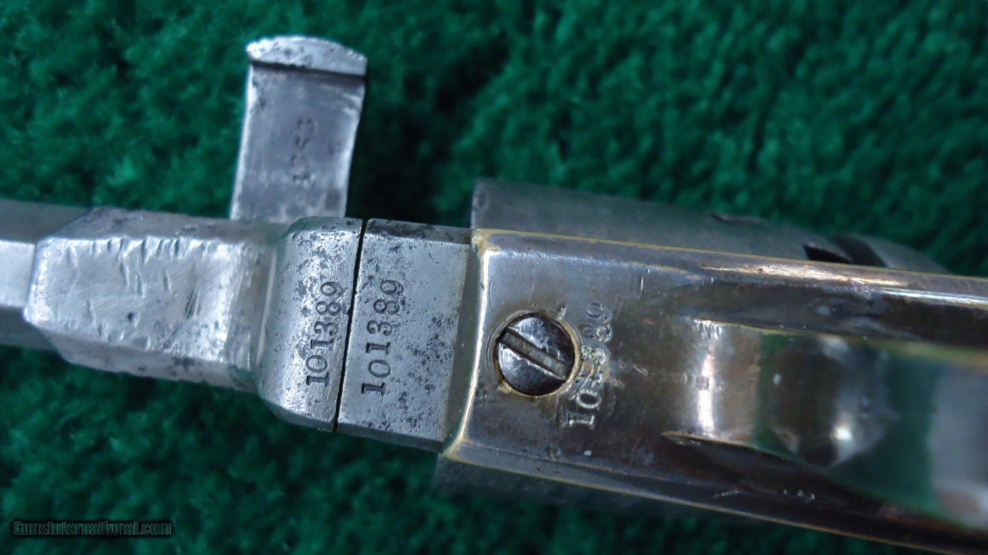 Description: Made without the ram rod. 3 inch barrel. All matching numbers. Nice mechanical condition. Wood grips show some use but generally VG with some handling marks and minor loss of wood. 50% remaining silver on the backstrap and trigger guard. Good traces of cylinder scene left. Metal is a light grey with scattered light pitting. Leroy Merz Antique Firearms specializes in antique and vintage Winchesters and other fine American firearms. Since 1965 Mr. Merz has taken part in the world of firearms and has been a contributor to many well known reference books. We have hundreds of additional guns in every price range at our home online. Search for Merz Antiques in google. SOLD Antique: Yes |