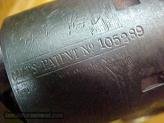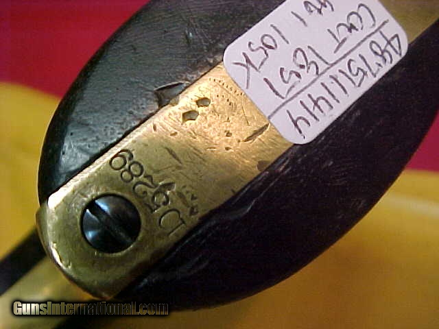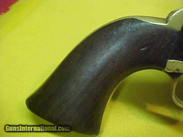 Description: #4875 Colt 1851 Navy, 4th Variation, 105XXX (matching except for the wedge is a replacement and so unnumbered). Mid to late 1861manufacture, decent black powder bore with no serious craters or blems; just the usual leading and light pitting. The action has had a new trigger replaced at some recent time and needs some minor gunsmithing to tune and fit it correctly because it is sticking at this time. VG smooth grayish brown metal with just light bumps and bruises, VG markings, fine scene about 85% intact, decent grips with just light to moderate wear. Made right at the time when the Civil War was really heating up, this revolver was almost CERTAIN to have been a brigade or state purchase and saw service throughout that terrible conflict. About VG as described. $1645 SOLD Antique: Yes |