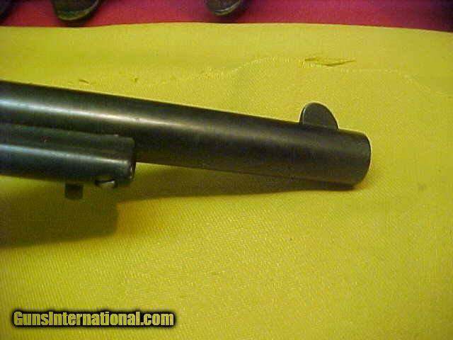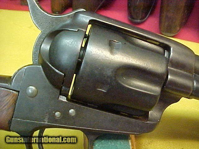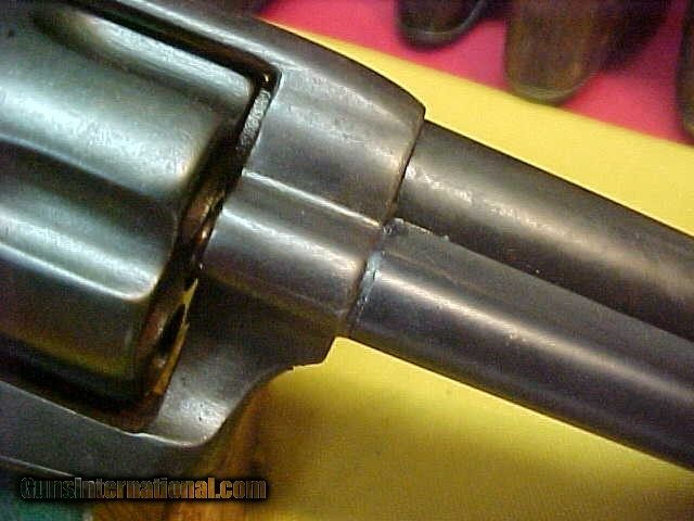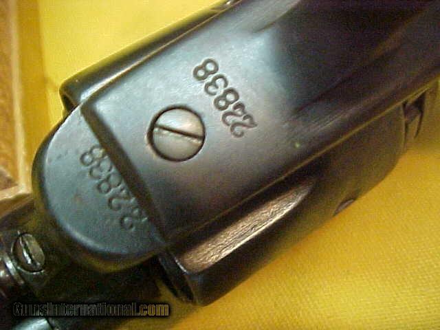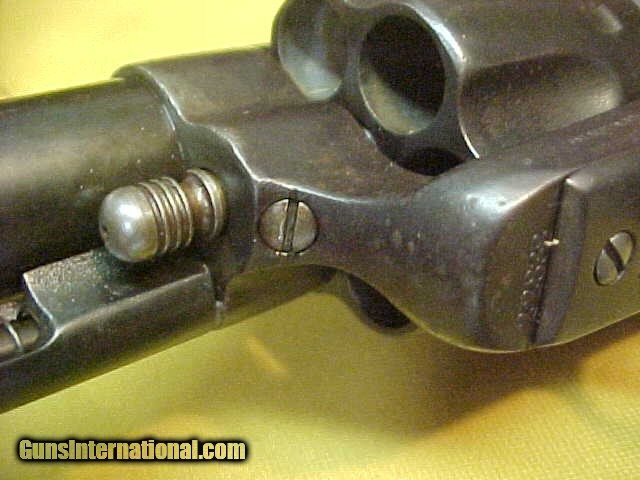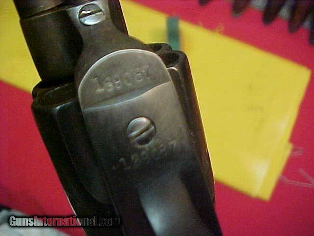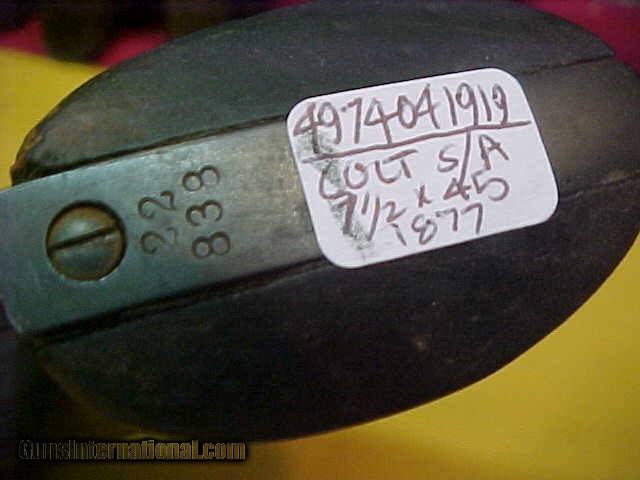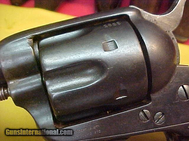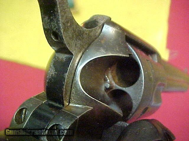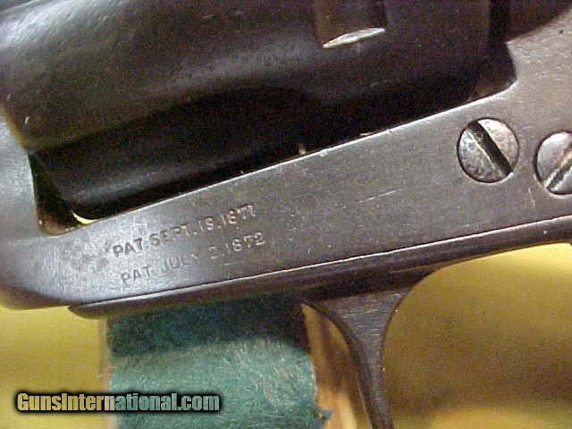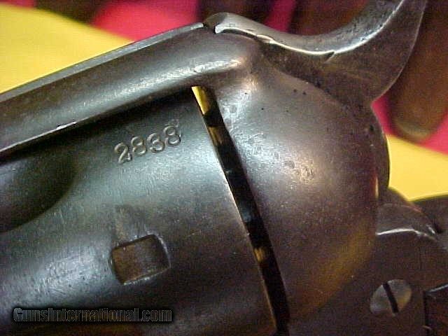Description: #4974 Colt S/A 7-1/2”x45COLT, 22XXX range (1876), VG+ to Fine bore ( about a 7+ to 8 on a scale of 10) and fine tight action. The metal is very nice for its age and certainly well above average for what is basically considered to be a no-finish dark brown patina gun. It has almost no mentionable pitting or serious wear anywhere and has the correct early “captive” Bulls-Eye headed rod and the early barrel with the italic address. The overall look is FAR above what one usually sees for an old cowboy Colt, especially one in the pre-1880 era, and it has an even deep brown patina overall. BUT.. suffice to say this (…and this is a VERY important fact)…that since many, if not most of the pre-1900 Single Actions have been restored, enhanced, and/or “juiced-up” to some degree, that one should always take the possibility that there as been some degree of restoration into consideration since these became so collectible. This gun has been valued and priced with that probability in mind, mainly because I have no history or provenance. There are a lot of photos to this VERY desirable early civilian S/A, so if they all don’t load (there are about 18 photos in all), just email me and I will forward them to you by return email. This old 143-year old Colt is a real opportunity to own a real piece of the Wild West in the form of what was probably the most iconic cartridge frontier handgun …and one of the fastest value appreciators in the antique gun field. VG+ $3695 SOLD Antique: Yes |