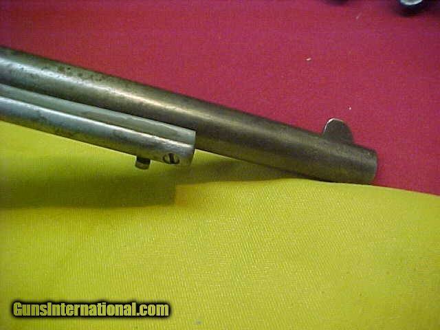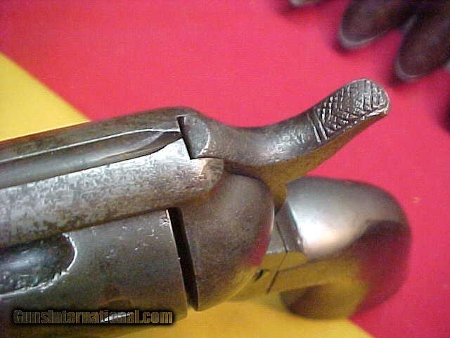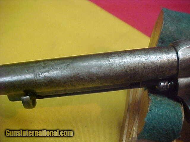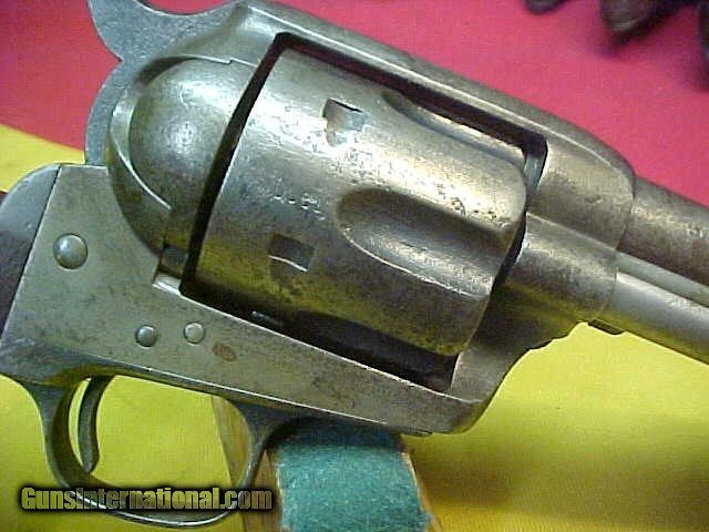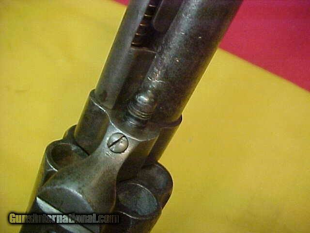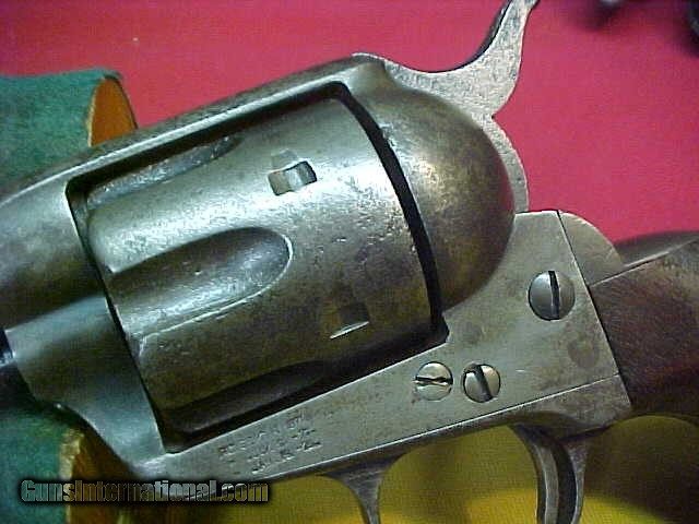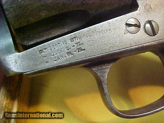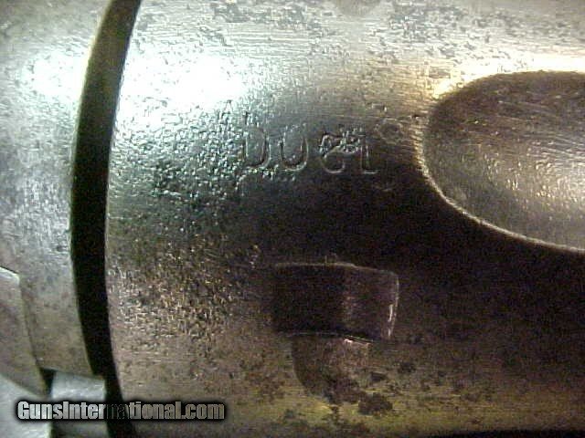 Description: #4974 Colt S/A 7-1/2”x45COLT serial numbered in the 51XXX range (1879), VG to fine bore and tight action. The metal is very decent for its age and above average for what is basically a grayish patina no-finish 140+ year old cowboy Colt. Aside of some light peppery pitting scattered mostly on the barrel and a little on the cylinder and hammer, it has almost no pitting or serious wear anywhere else. The one-piece walnut grips fit perfectly and have no losses. Generally speaking, the overall look is WELL above what one usually sees for an old cowboy Colt dated from the pre-1880s. The markings are all good, numbers match, and this is just a good solid example of what is probably the fastest appreciator in the antique gun collecting field. VG as described, $3295 SOLD Antique: Yes |