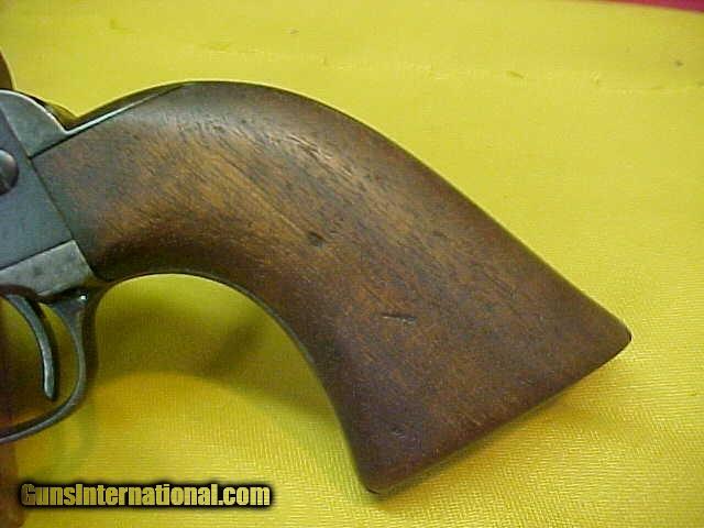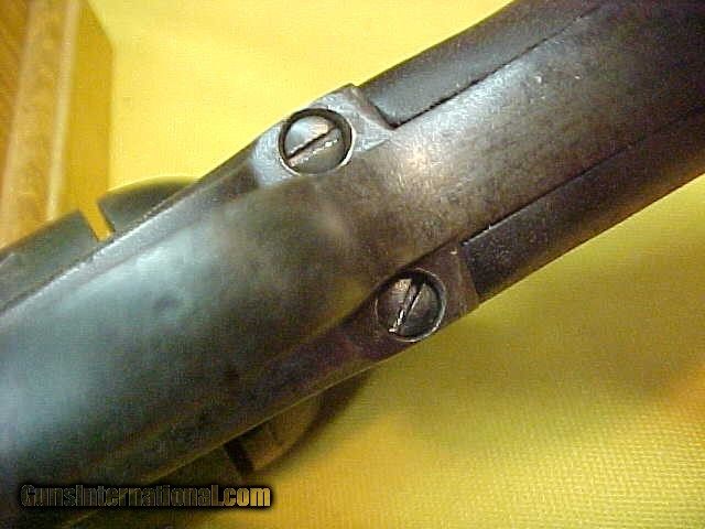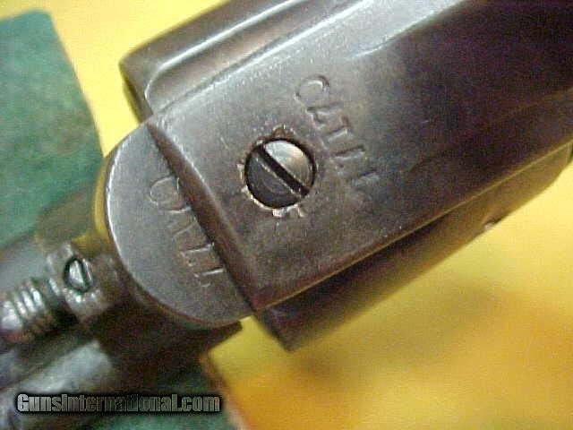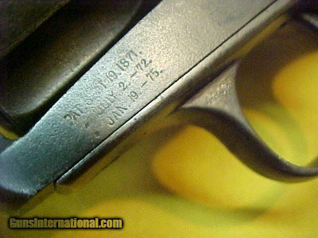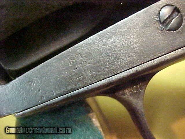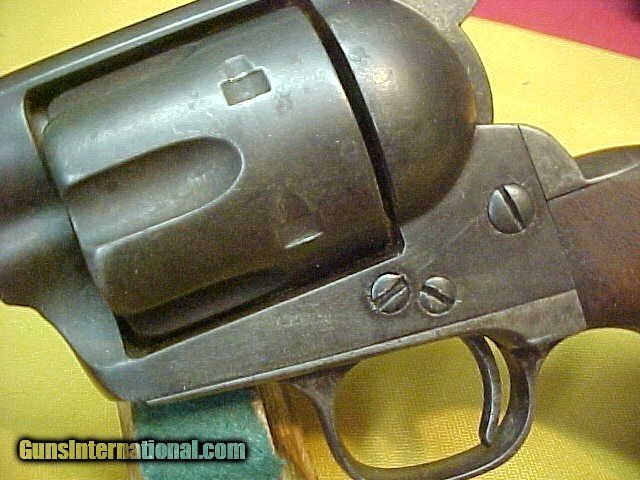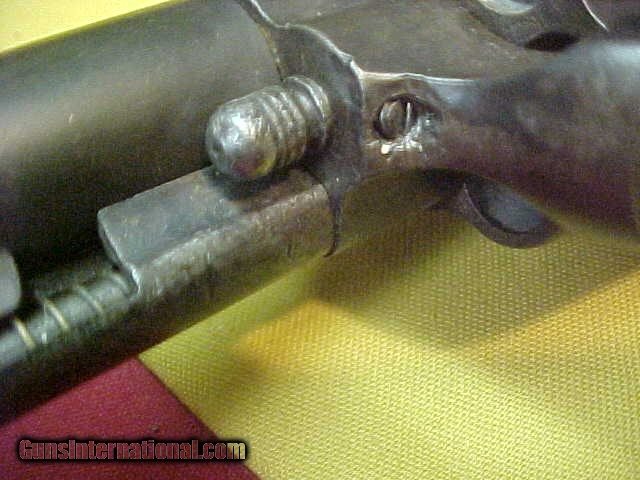Description: #4979 Colt SA 7-1/2”x44WCF (44/40), 77XXX range (1882). Fine bore, about a 8 on a scale of 10 and should clean to about a 9 ..maybe even a 9-/2 ..and it has a tight smooth action with all the clicks on the hammer. The exterior has fine smooth metal with an overall even color and even texture dark brownish patina overall, only having a slight grayish lighter crustiness on the barrel top just behind the front sight. VG markings with the exception of the etched “COLT FRONTIER SIX-SHOOTER” barrel logo which has been worn away many decades ago. Fine standard one-piece wood grips with very minor wear overall, fit well, and have a handsome appearance. WELL above the condition of most Single Actions that are usually found priced in this same age and price range, and a really handsome early cowboy era Colt. VG+ as described. $3495 SOLD Antique: Yes |
