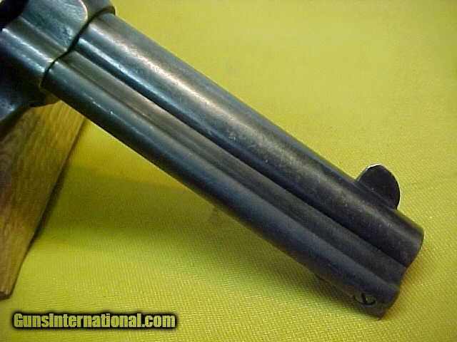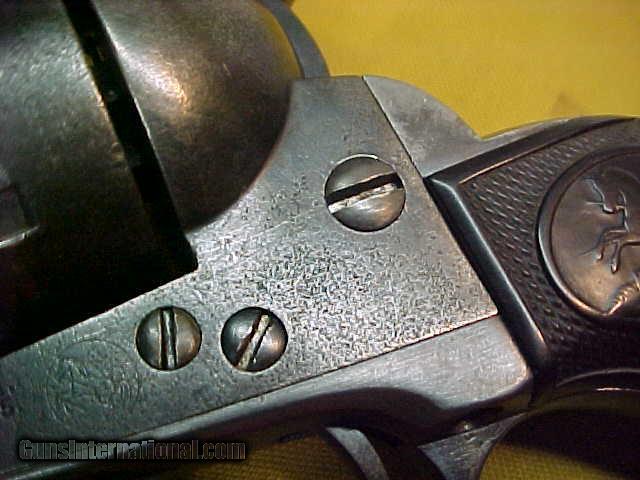 Description: #4981 Colt S/A 4-3/4”x38WCF, 157XXX(1893), G-VG bore (6 to 6-1/2 on a scale of 10) and having no pitting of mention but does have some average wear to the rifling. It indexes fine, and the action is very tight with all clicks on the hammer. The exterior has crisp metal, a smooth even dark greyish brown patina on VG metal. Good markings and all matching numbers. The barrel address is the correct two-line style with minor holster wear to the front portion. VG hard rubber grips are the standard style with 10-20% wear to the checking. Considerably better than the average S/A that one sees at most of the regional gun shows these days, and one of the more popular configurations for and caliber and length. VG-VG+. $3150 SOLD Antique: Yes |