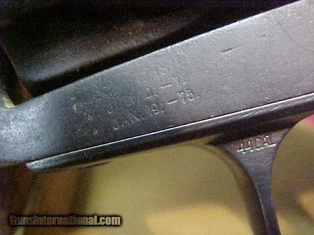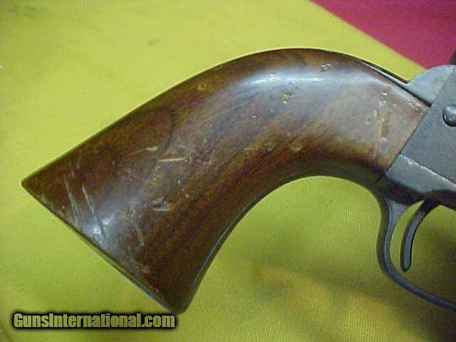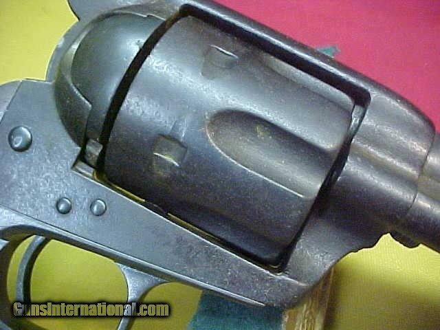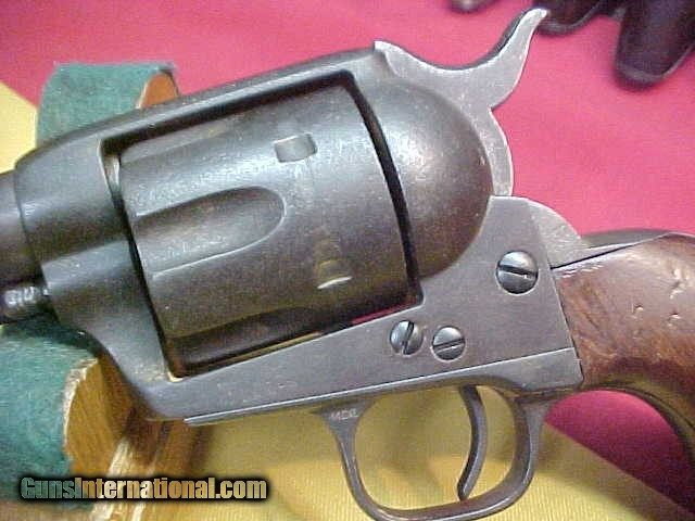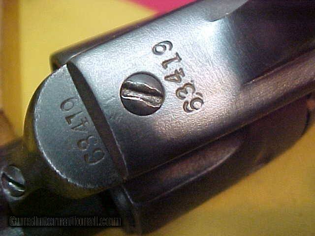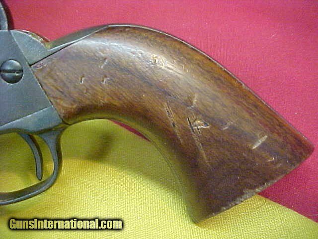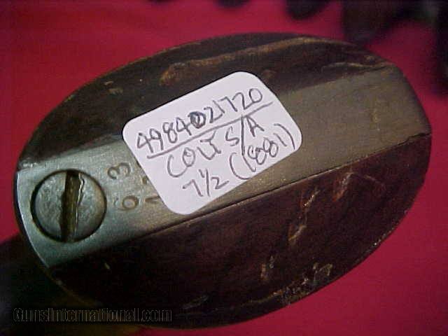 Description: #4984 Colt S/A 7-1/2”x44WCF, 63XXX range (1881) with a fine bore, about a 8+ on a scale of 10 and also having a tight smooth action with all the clicks on the hammer. The overall smooth deep dark chocolate brown metal has no pitting at all except for some very insignificant freckling and looks to have had good care all of its 139 year life. It does have VG markings with a strong and correct “block” barrel address …..and with the exception of the long gone CFSS etched barrel logo being worn off, the serial numbers and patent dates are all very decent. Standard one-piece wood grips with only light wear overall, and while they look really good, (..and this is the way I got this gun), in my opinion these are possibly replaced grips. However, suffice to say this (…and this is a VERY important fact!!)…that since many, if not most Single Actions have been restored, enhanced, and/or “juiced-up” to some degree, one should always take the possibility of some degree of restoration into consideration. This gun has been valued and priced with that possibility in mind. Overall, this Colt is MUCH above the condition of most of the Single Actions that are usually found priced in this same age and price range, and is a very handsome early 1880s revolver! VG+ $3695 SOLD Antique: Yes |