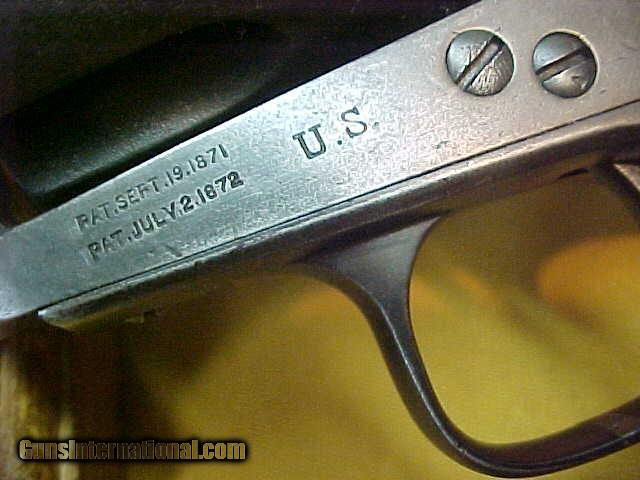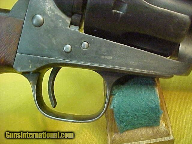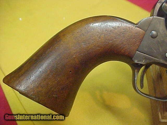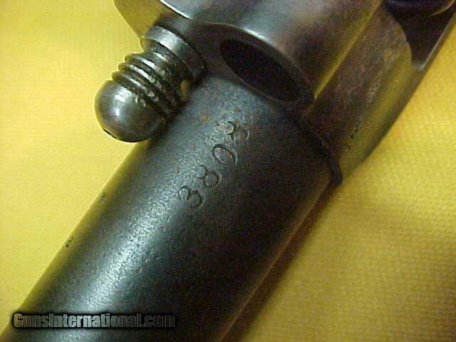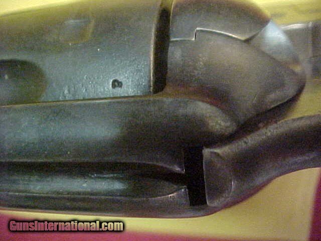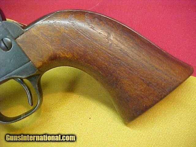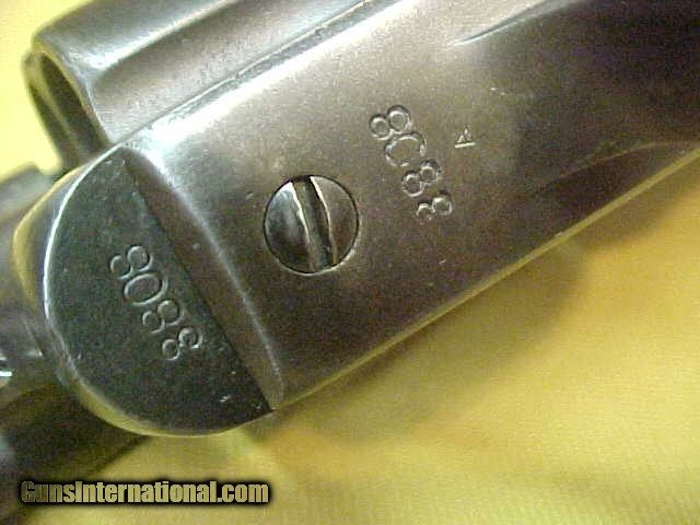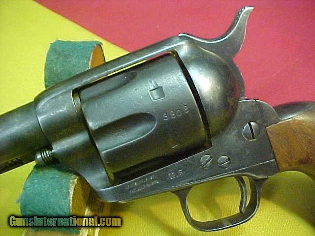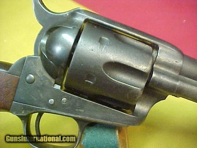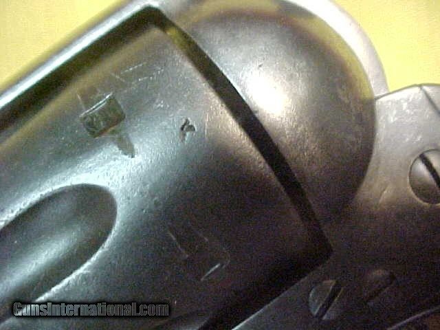 Description: #4987 Colt S/A, 7-1/2x45COLT, “U.S. Cavalry” model. This is a VERY desirable second year production (3XXX range-1874) Colt. It is inspected throughout by O.W. Ainsworth, the first S/A military inspector, and thus being a PRE-Custer range Colt and the possibility of having been a 7th Cavalry issue! However, in this case, it is just too good of a condition to have been in the Custer Battle and then having been captured by Indians who used them pretty hard. This old veteran of the 1870-1890s Indian Wars in the American West has very decent metal with just a thin dark brownish appearance and no pitting of any consequence. It is well marked with the A inspector martial markings in all the correct places, and all numbers, except the grip, match. The grips do look to probably be excellent fitting replacements at some point in its life, but are just too good to be 140+ years old, plus they do not have the side cartouches. The metal is very nice, the patina is very attractive, and overall it is certainly WELL above the average condition for a gun of this age. It does have some very minor thin rust in the tight areas, but there is no pitting as previously mentioned, and the overall look is just that of being a very handsome and VERY early military Indian War Era Colt. It has the correct 1st style captive rod ejector housing with the Bulls-Eye ejector head, the correct italic barrel address line, hammer knurling, etc. But suffice to say this, and this is a note to remember on virtually ALL of the extremely desireable Colt S/As. Since many, if not most all 1st Gen Colt Single Actions (…and especially these highly collectible militaries), have probably been enhanced, restored, and/or juiced-up to at least SOME degree during various ownerships, a new buyer should always take this possibility into consideration. Consequently this gun has been valued by me with that possibility in mind. However, this is still a really great and rarely encountered opportunity to own a really nice piece of the Wild West frontier history and one of the fastest value appreciators in the antique gun field. It is getting very, VERY difficult to find any pre-1876 production martial Colt S/A priced at anything much under $8000-$9000 …especially a military issued FOUR-digit one manufactured in the second year of production!!! VG/VG+ $6750 SOLD Antique: Yes |