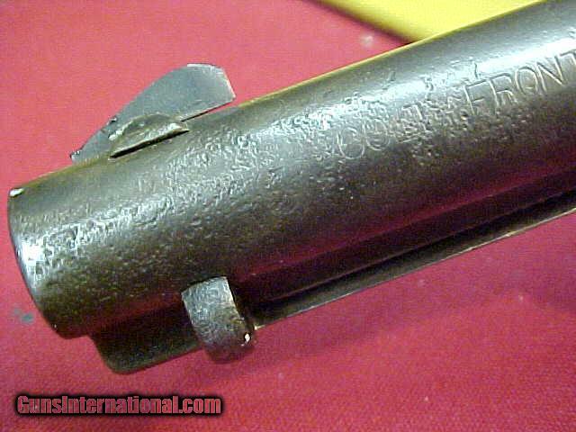 Description: #4989 Colt S/A, 4-3/4”x44WCF, 132XXX serial range (1890 mfgr), good tight action with all “clicks” on the hammer, and about a “7” bore as rated on a scale of 1 to 10, with 10 being the best; very desirable “Eagle” style hard rubber grips with just medium wear. This caliber and configuration is one of the most popular of all the Single Actions made after 1885 and being somewhat immortalized in the 1960s by the late Marty Robbins Country Western song, “Mister Shorty” ( youtube/watch?v=L0bcALLEgwI?) about a “short-barreled bad forty-four” and the small man packing it. This particular gun looks just like what is portrayed in that song since it has a period done frontier replaced front sight, probably from the original being worn down from many years of being carried and used, but yet the mechanics are very good and markings are still mostly decent. The famed roll-die “CFSS” barrel logo is worn toward the muzzle end from many, many holsterings, but the correct two-line address is still visable, as are the other markings. Overall just a grayish-brown thin patina with scattered light to medium pitting and the usual bumps and dings of its 126 year life. There are lots of pictures of this neat old gun, so if they all do not load up, be sure to e-mail me and I’ll forward them along to you. VG overall, as described. $3195 SOLD Antique: Yes |