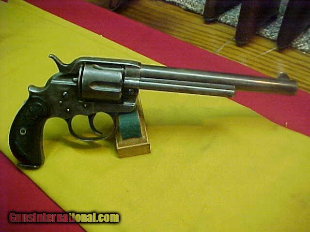 Description: #4992 Colt 1878 D/A, 7-1/2”x45COLT, 12xxx range (1884), fine action and bore, about an 8 on a scale of 10. Mechanically working fine on both S/A and D/A modes. The exterior has about 40-50% coverage of a very thin 20% density plum blue-brown patina, mostly just dulling from handling , and may have been “helped” a little by fogging with Cold Blue, but it does look to have good trace amounts of original blue, as well. Grips are fine, markings are fine, the often missing lanyard ring is intact, and overall this is a VERY decent and desirable early double action that should clean even better with just some light cleaning. Strange how these big Colt D/As are still lagging in price behind the S/As when both are in the same age range and overall condition, because if this revolver was a Single Action, it would be double this price. About VG++ as described. $1650 SOLD Antique: Yes |