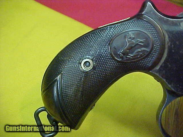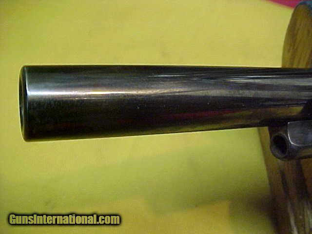 Description: #4994 Colt 1878 D/A 7-1/2”x44WCF with Ex.Fine++ bore (about a 9 on a scale of 10) and Excellent smooth action both on S/A and D/A modes, 33XXX serial range and thus being made in 1895. Original factory blue is about 80-90% coverage overall with the density varying from 40% on the cylinder to 95% on the frame and 99% on the barrel; the remainder being smooth plumming blue-grey metal with no pitting whatsoever. What blue is missing is mainly flaked off; the only real wear being on the back strap and the cylinder due to the old practice of cleaning by boiling the cylinder to remove the powder residue build-up and which likely caused the blue to flake off prematurely. The “CFSS” roll-die barrel panel is crisp and sharp, as is the addess and serial number. The original hard rubber grips are near excellent with almost no wear. (see photos). The very often missing lanyard ring is also intact. A very, VERY decent, showy, big frame double action Colt in Antique Excellent condition and becoming almost non-existant for sale at any but the largest gun shows. $2895 SOLD Antique: Yes |