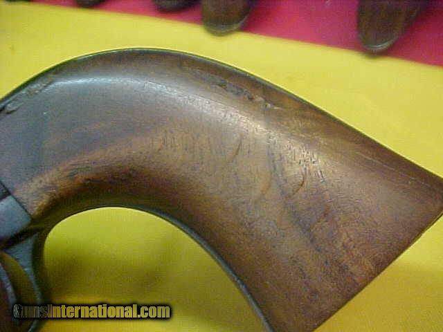 Description: #5002 Colt S/A 4-3/4”x45COLT, 101XXX (made in late 1884) and having a VG bore (about a 7 on a scale of 10). Tight lock-up and in fine tune with all the “clicks” on the hammer, VG mostly smooth metal with a dark plum brown patina and just scattered light to moderate pitting, VG screw heads, correct two-line barrel address, and VG markings with normal wear in the usual places. The wood grips are near fine, but do appear to be newer replacements and have some forestrap showing due to a poor fitting. Overall it is still a very handsome little short-barreled .45 in above average condition for a 135 year old Colt. $2395 SOLD Antique: Yes |
