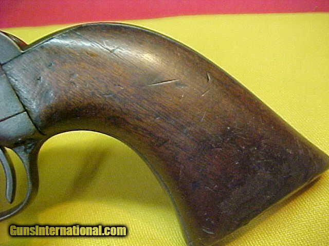 Description: #5002 Colt S/A 4-3/4”x45COLT, 110XXX(1884), G-VG bore (6+ to 7 on a scale of 10) and having no pitting of mention but does have medium wear to the rifling and lead scale build-up. It indexes good, and the action is tight with all clicks on the hammer. The exterior has VG metal, a smooth even dark greyish brown patina with medium scattered pitting, good markings and all matching numbers. The barrel address is the correct two-line style with meium holster wear and the hammer checking is worn from use. Looks like this cowboy USED his gun! VG original wood grips with average wear but no serious damage. A bit better than the average S/A that one sees at most of the regional gun shows these days, and one of the most popular configurations for and caliber and length. Made at the height of the famed Lincoln County Cattle Wars in the early-mid 1880s, and typical of the average cowboys sidearm of the time. VG-VG+. $2650 SOLD Antique: Yes |