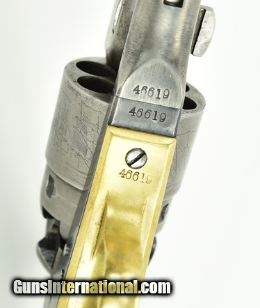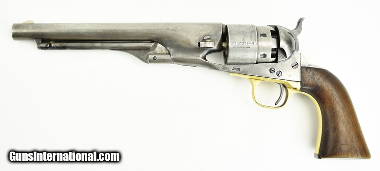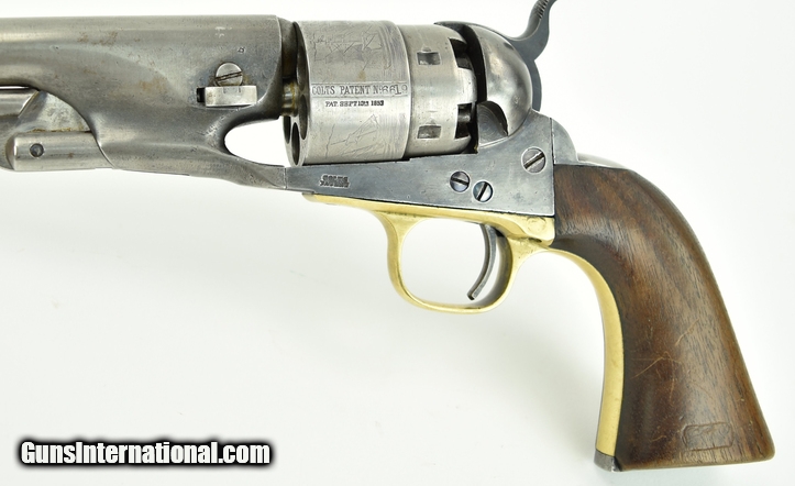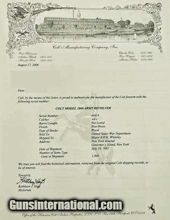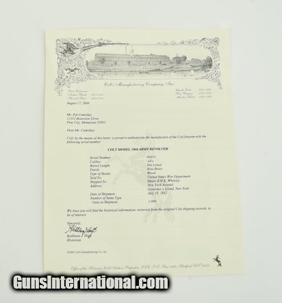 Colt 1860 Army. Made in 1862. Nice sharp gun that has been cleaned. All markings are present and clear. Excellent cylinder scene. Gun is all matching. Very good grips with visible cartouche. It appears as if someone traced around the border of the cartouche to make it appear sharper. Gun comes with a letter as being shipped to Major R.H.K. Whiteley at the New York Arsenal in a shipment of 1000 guns. Very attractive sharp gun!