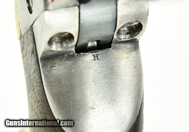 Description: Colt 1860 Army. Made in 1862. Nice sharp gun that has been cleaned. All markings are present and clear. Excellent cylinder scene. Gun is all matching. Very good grips with visible cartouche. It appears as if someone traced around the border of the cartouche to make it appear sharper. Gun comes with a letter as being shipped to Major R.H.K. Whiteley at the New York Arsenal in a shipment of 1000 guns. Very attractive sharp gun! SOLD |