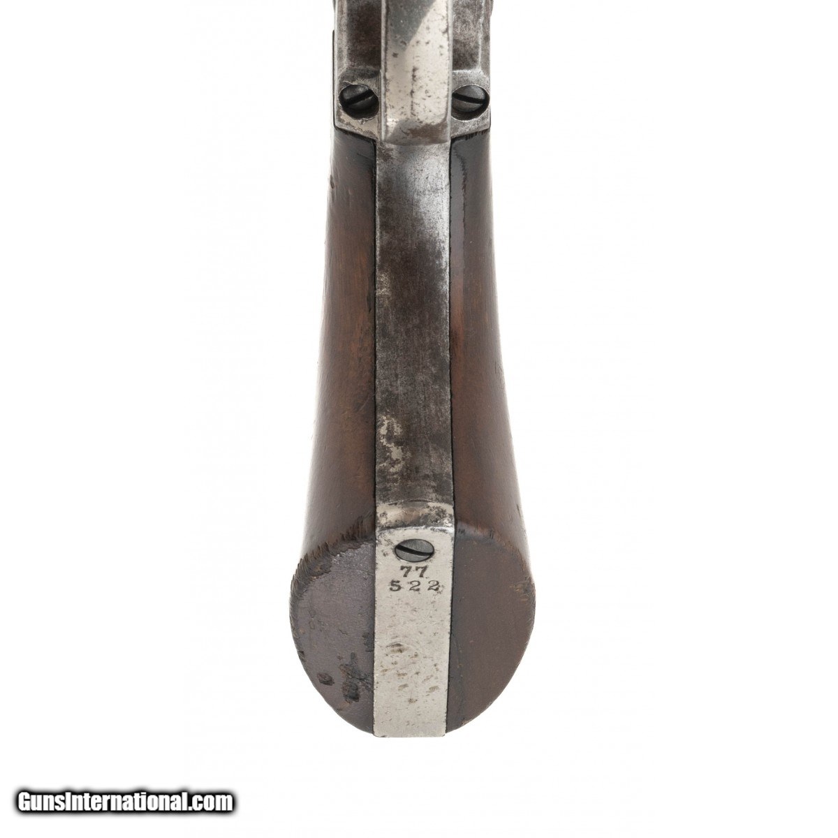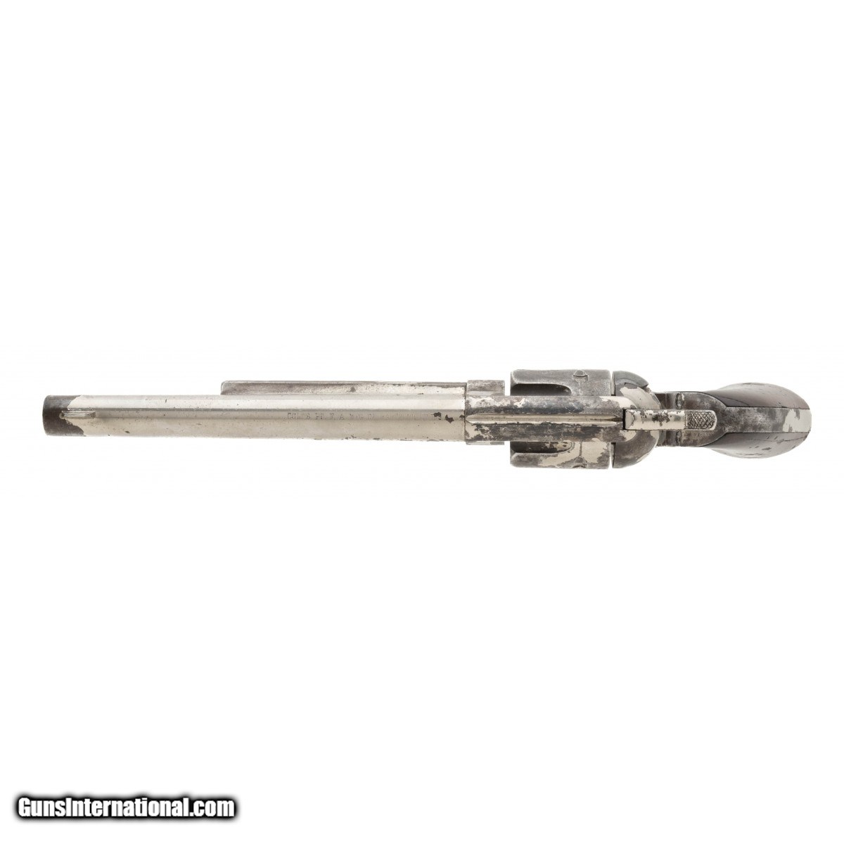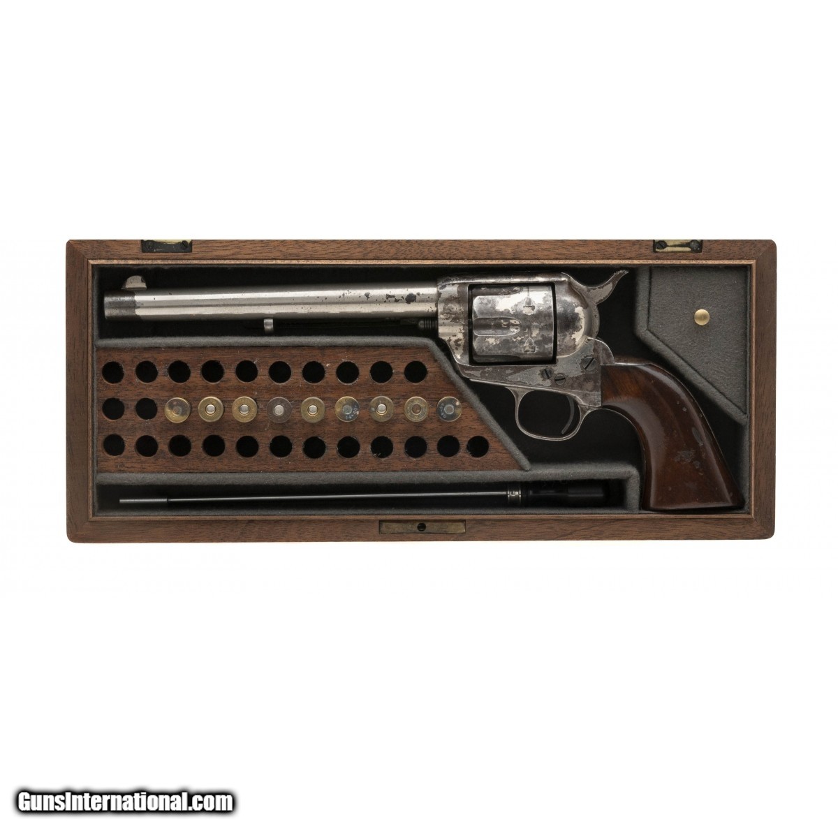 Description: "Serial number 77522. Made in 1882. 45 LC with a 7 ½" barrel. Very fine black powder gun with 60% of the period finish. This gun most likely shipped to New York and finished in Nickel by one of the main distributors. This gun has vert fine wood grips that has a extra coat of varnish. This gun has a later case that is very attractive! SOLD Antique: Yes |