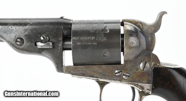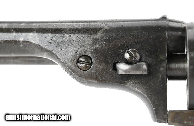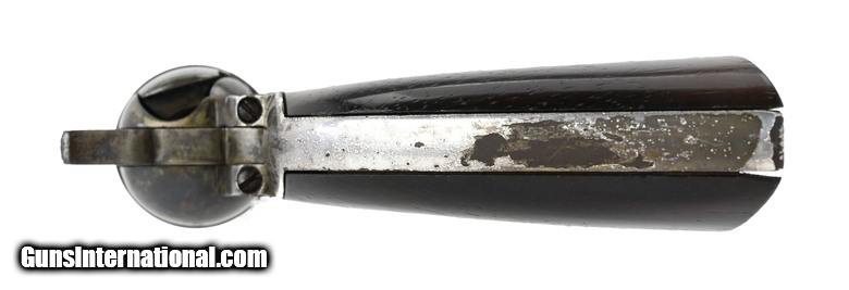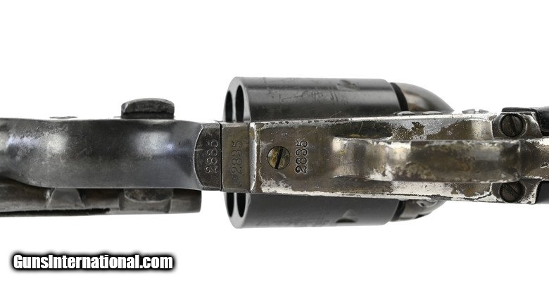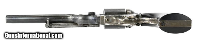 Description: " Colt 1872 Open Top Single Action Revolver. Bore is very good with strong rifling. Action works perfectly. One-piece rosewood grips are excellent. Numbers all match except wedge which is unnumbered. The barrel has somehow had some of its “skin" (if that is a good word to describe it) peeled away for about ¾" at the muzzle and front sight. Same peeling continues at breech and continues forward 2 ½" leaving much of the barrel address missing except for “Address Col." “Rica" (would have been America). Absolutely no idea how this peeling occurred. The barrel has a mostly even blue except for the peeled areas which are blue but a different lighter color. In our opinion, the frame and hammer have been re-case colored and have approximately 95% of those colors. Trigger guard and backstrap are silver plated and have approximately 70% of silver finish. The cylinder scene is perfect with 100% blue finish. In our opinion, the cylinder is a really good repro complete with the Colts Patent and serial number bar. This revolver is lacking in originality as noted above, but for an Open Top it has a nice appearance. Instead of costing you $8,000 t $10,000 or more, this one can fill a hole in your collection for a reasonable price of $3500.00 SOLD Antique: Yes |