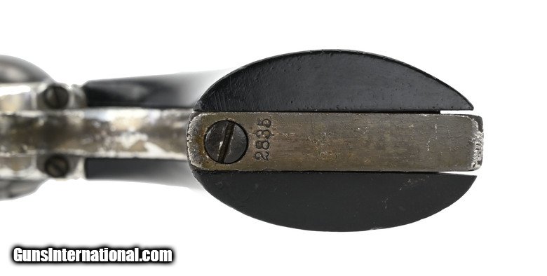 Colt 1872 Open Top Single Action Revolver. Bore is very good with strong rifling. Action works perfectly. One-piece rosewood grips are excellent. Numbers all match except wedge which is unnumbered. The barrel has somehow had some of its “skin" (if that is a good word to describe it) peeled away for about ¾" at the muzzle and front sight. Same peeling continues at breech and continues forward 2 ½" leaving much of the barrel address missing except for “Address Col." “Rica" (would have been America). Absolutely no idea how this peeling occurred. The barrel has a mostly even blue except for the peeled areas which are blue but a different lighter color. In our opinion, the frame and hammer have been re-case colored and have approximately 95% of those colors. Trigger guard and backstrap are silver plated and have approximately 70% of silver finish. The cylinder scene is perfect with 100% blue finish. In our opinion, the cylinder is a really good repro complete with the Colts Patent and serial number bar. This revolver is lacking in originality as noted above, but for an Open Top it has a nice appearance. Instead of costing you $8,000 t $10,000 or more, this one can fill a hole in your collection for a reasonable price of $3500.00
