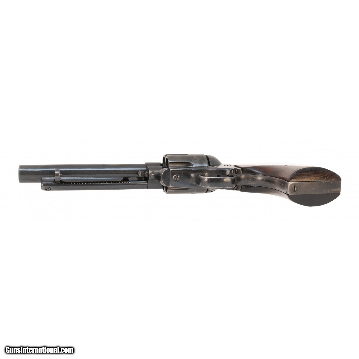Description: " Colt black powder single action revolver caliber .45Long Colt with a five and half inch barrel. Manufactured in 1880 per serial number. This revolver was an Artillery Model some time long ago . The left-side off the frame has the letter ""U"" which is legible and a very faint letter “S". The bore is excellent. The action works perfectly and locks up and indexes perfectly. The grips are one piece walnut and fit well with the bottom of the grips a bit short of a flush fit. The entire revolver has been refinished long ago and the barrel address ,patent dates, and barrel markings were removed in the refinish. The serial numbers are easily legible. Note that this is a BLACK POWDER revolver and NOT for modern smokeless high pressure loads. SOLD Antique: Yes |
