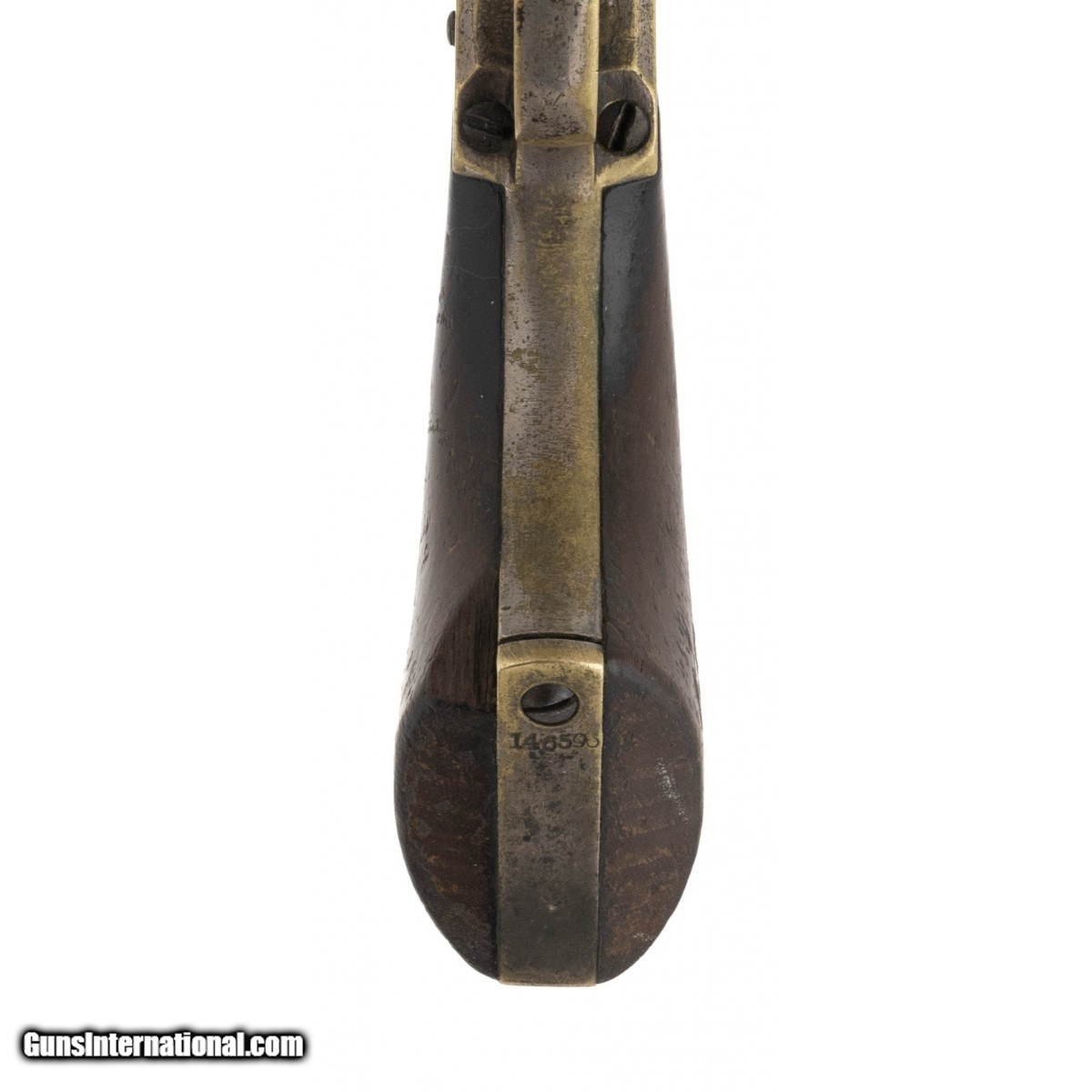 Description: "Serial No. 146596, made in 1858, .31 caliber, 6"" octagonal barrel. Serial numbers are matching, finish is a dark grey patina with surface oxidation and pitting visible. Original varnish is flaking, mostly on the right side with a chip at the toe. Action does not function hammer will go to full cock, cylinder will not rotate. Bore has pitting in the grooves, rifling remains strong. consignment SOLD Antique: Yes |