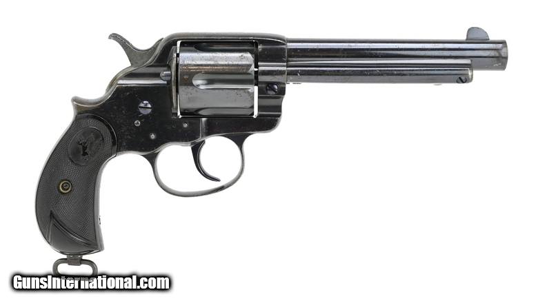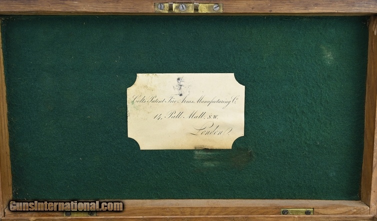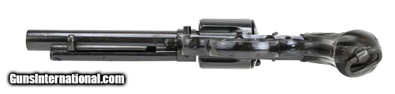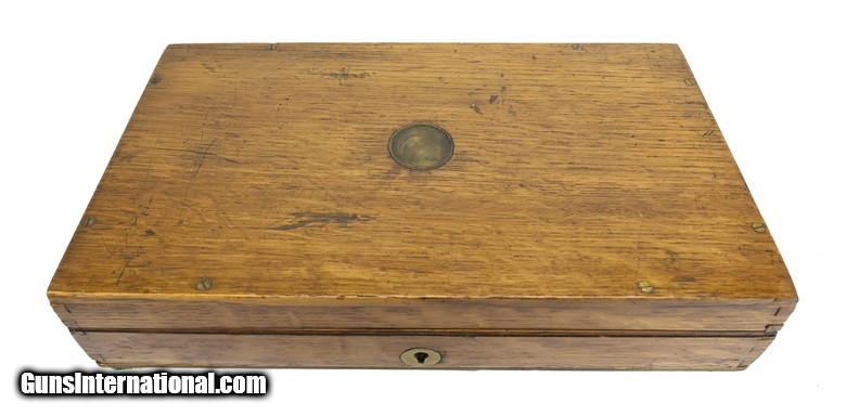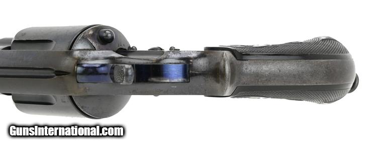 Description: " Colt Model 1878 Double Action “Frontier”. This is a London Colt with both Hartford and London barrel addresses. The oak case is the correct English case for this revolver. Caliber is .455 as are the cartridges in the wood block. Case has the Colt Pall Mall label in the lid. The bore is perfect. Barrel length 5 ½”. Trigger guard is marked .455 Cal E. Barrel and cylinder are English proofed. This very fine revolver has approximately 95% bright original blue. The face of the cylinder appears perfect. No burn marks. Grips are perfect. No chips or cracks. All the screws are perfect. Action works, indexes and locks up perfectly. The case is very good plus with light handling marks on the lid. This is a very fine London 1878. SOLD |