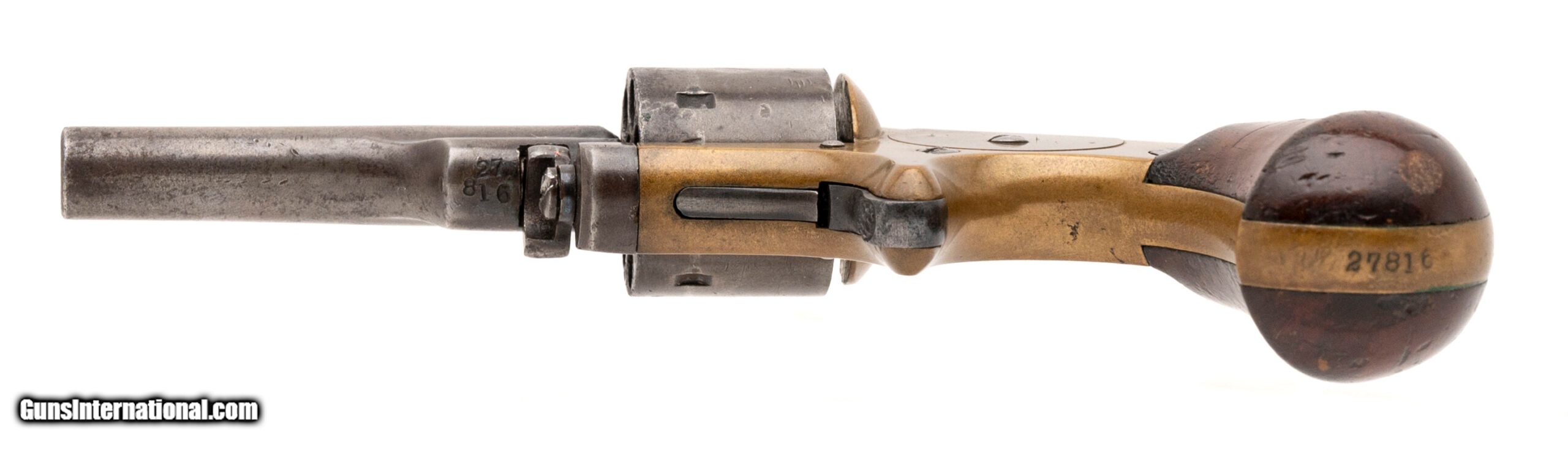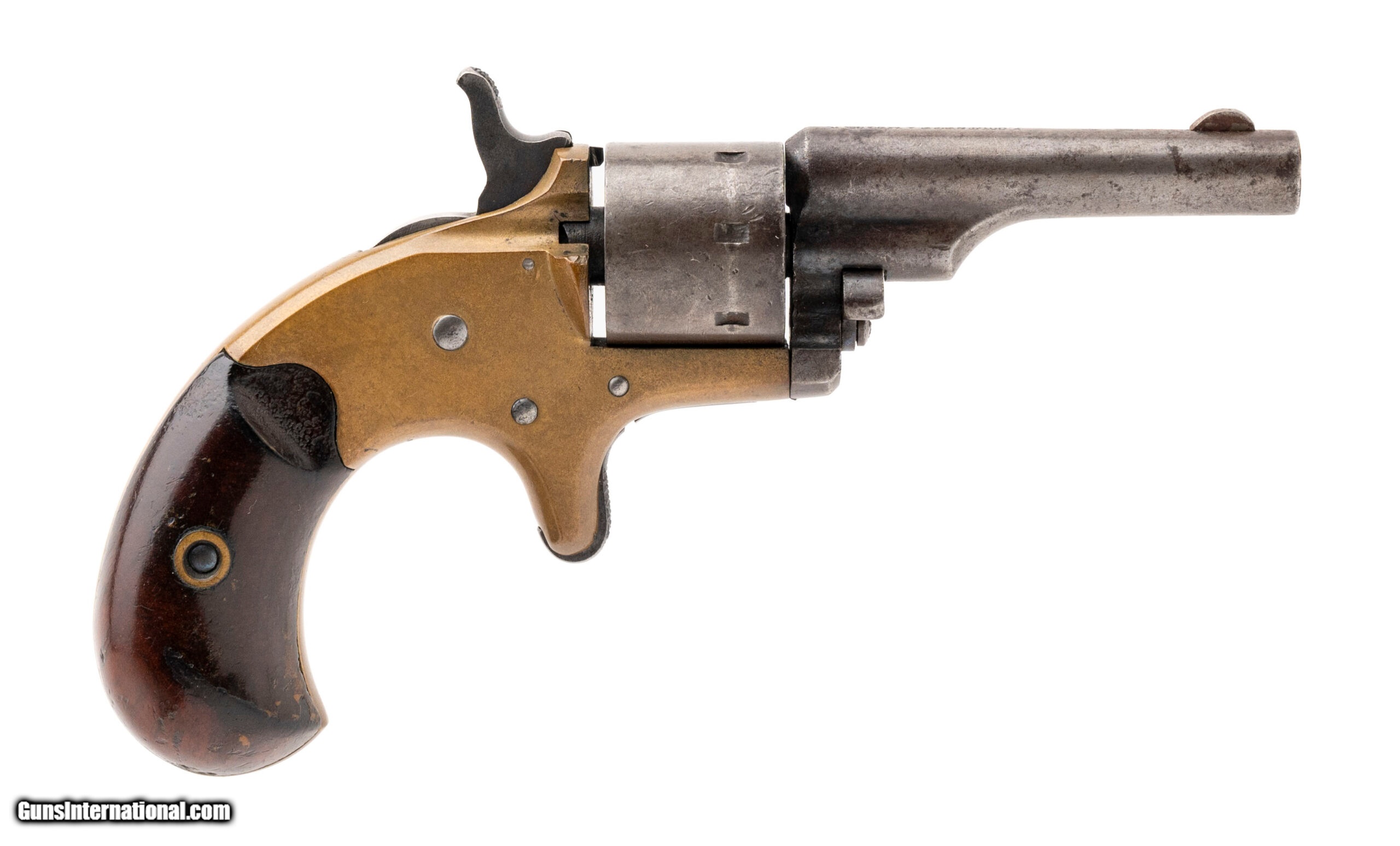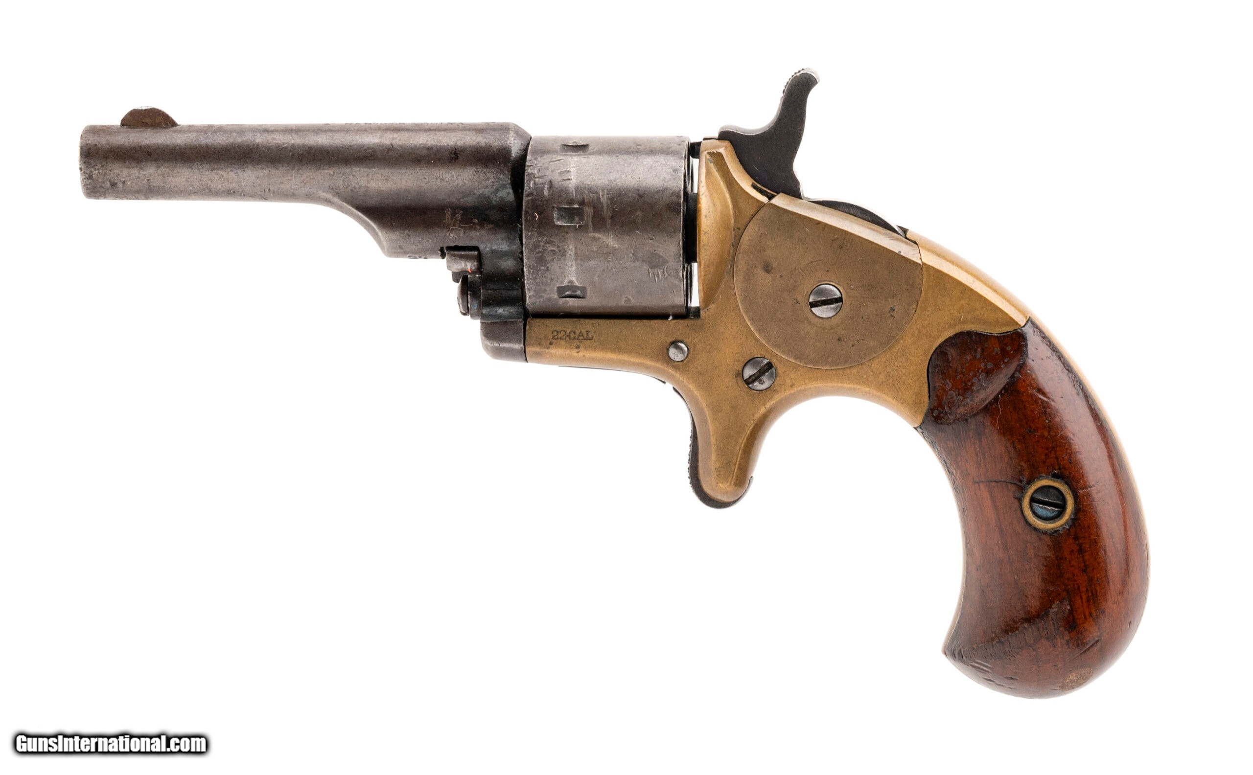Description: "Serial No. 27816, circa 1871-1877, .22 caliber, 2 3/8" round barrel. Bore is fair with oxidation visible in the grooves, rifling remains strong. Barrel and receiver have turned to a smooth grey patina. Frame has a nice antique brass patina, Factory markings on barrel and frame remain sharp. Grips are very good with light handling marks noted. Action indexes correctly with a tight lock up. SOLD Antique: Yes |