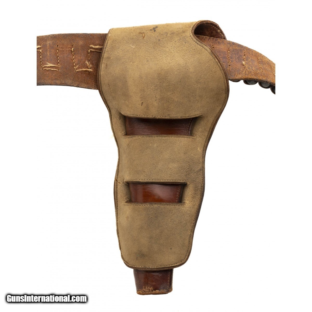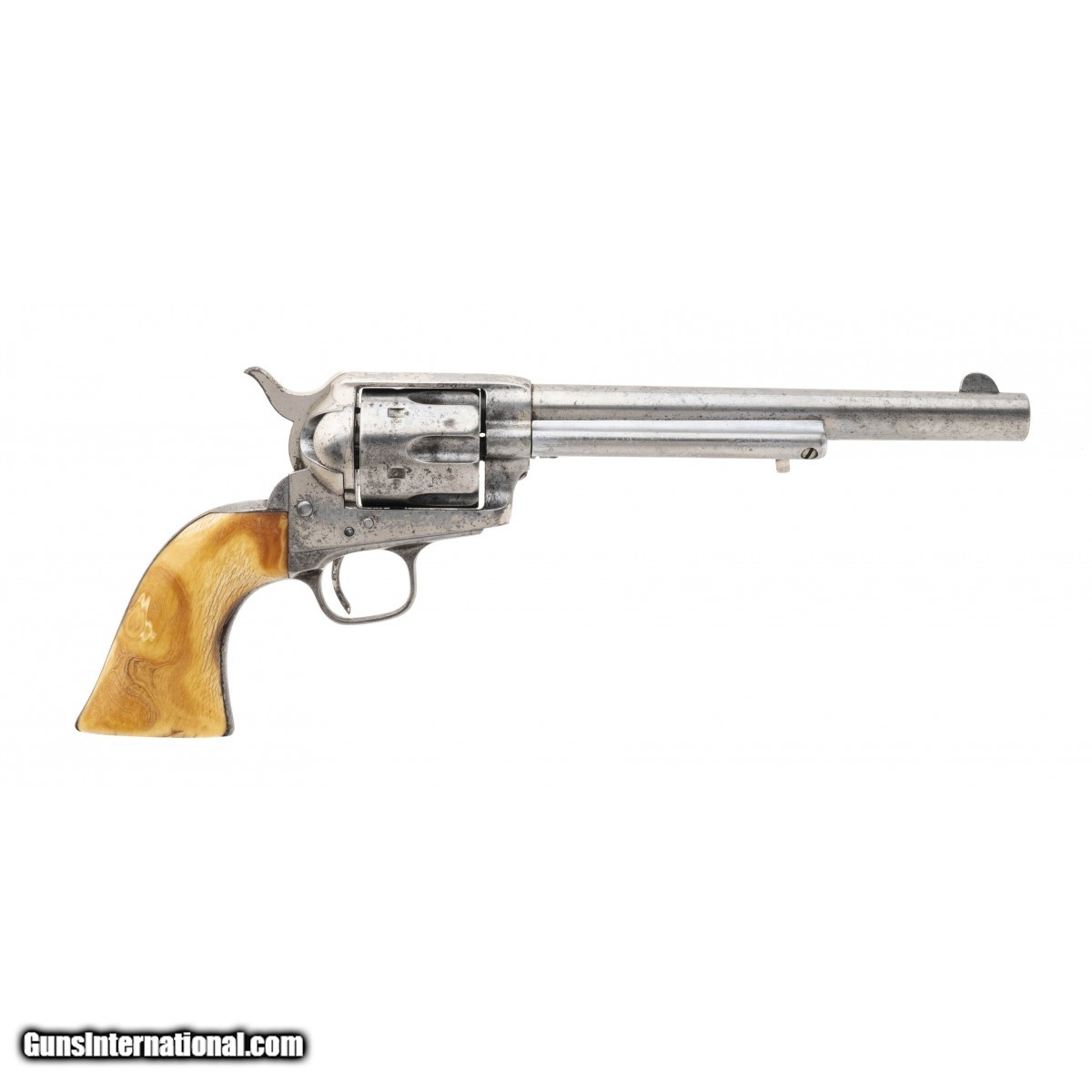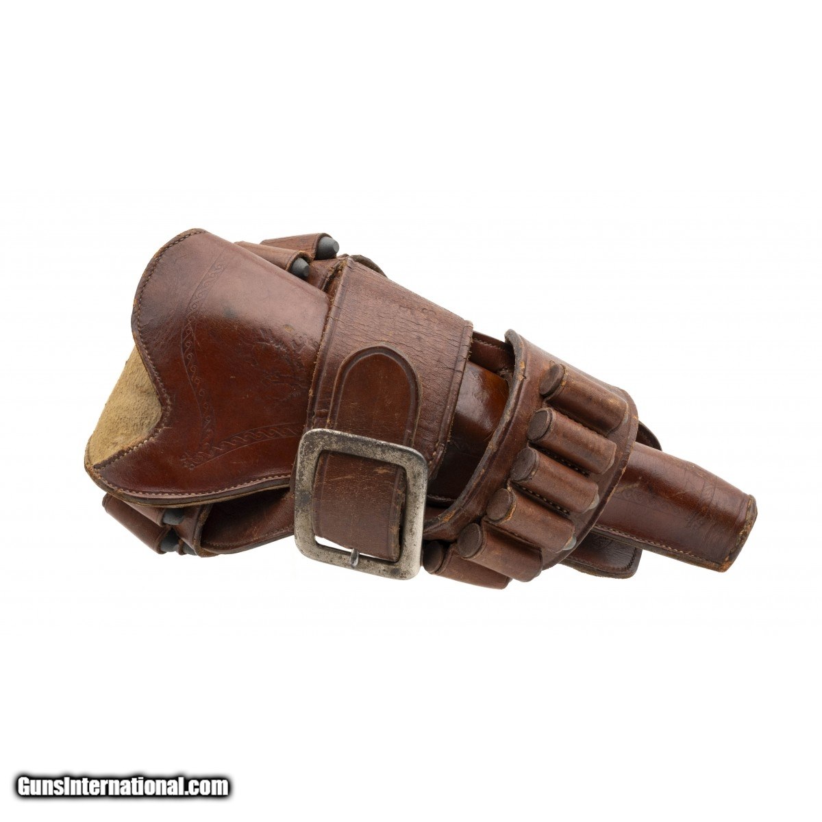Description: "Serial number 22730.Made in 1876. 44-40 LC caliber with a 7 ½" barrel. Nice sharp gun with traces of nickel finish. Metal has been cleaned. Grips are very good old one piece Ivory. This gun comes with a double loop holster that has some decorations along the border. The cartridge belt is very good. (Consignment) SOLD Antique: Yes |
