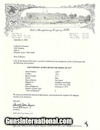 Description: " New York Engraved Colt 1877 “Thunderer” Sheriff’s Model .41 caliber revolver. Made in 1879. Has a 3½” barrel in .41 Colt caliber. This beautiful gun has been New York engraved. Many New York retailers would have Colts engraved by independent engravers instead of paying the premium for an ordered factory engraved gun. This gun has almost full coverage engraving. The quality of the engraving is way above average for the normal New York engraved gun. Gun is in excellent condition with 90% of the bright nickel finish with traces of blue on small parts. Grips are checkered deluxe wood. Gun is also a Sheriff’s model without an ejector housing. Comes with a factory letter and shipped to Hodgkins and Haigh in New York city in a shipment of two. Very fine New York engraved Colt Thunderer. SOLD Antique: Yes Handgun Caliber: .41 Long Colt (.41 Colt, .41 LC) |