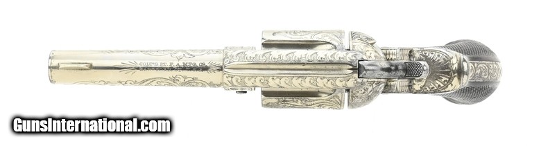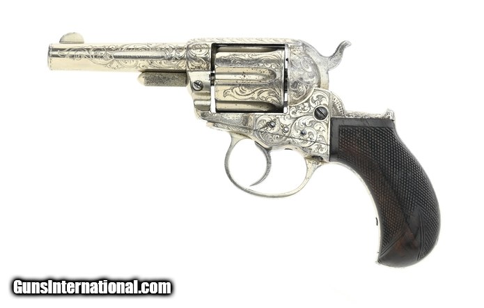 New York Engraved Colt 1877 “Thunderer” Sheriff’s Model .41 caliber revolver. Made in 1879. Has a 3½” barrel in .41 Colt caliber. This beautiful gun has been New York engraved. Many New York retailers would have Colts engraved by independent engravers instead of paying the premium for an ordered factory engraved gun. This gun has almost full coverage engraving. The quality of the engraving is way above average for the normal New York engraved gun. Gun is in excellent condition with 90% of the bright nickel finish with traces of blue on small parts. Grips are checkered deluxe wood. Gun is also a Sheriff’s model without an ejector housing. Comes with a factory letter and shipped to Hodgkins and Haigh in New York city in a shipment of two. Very fine New York engraved Colt Thunderer.