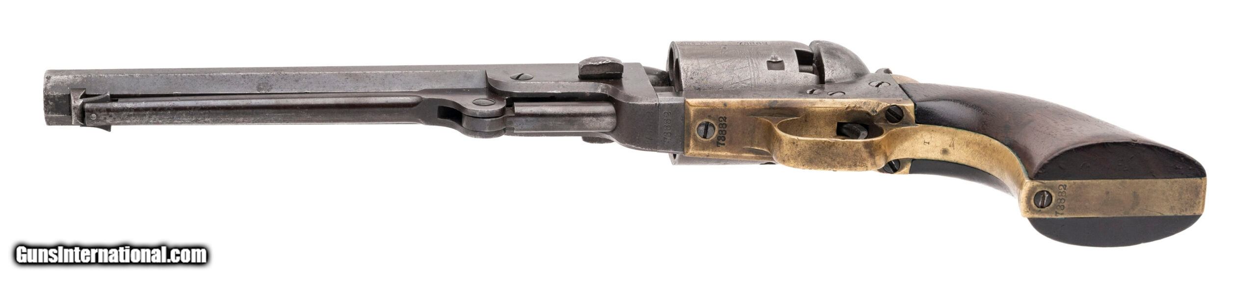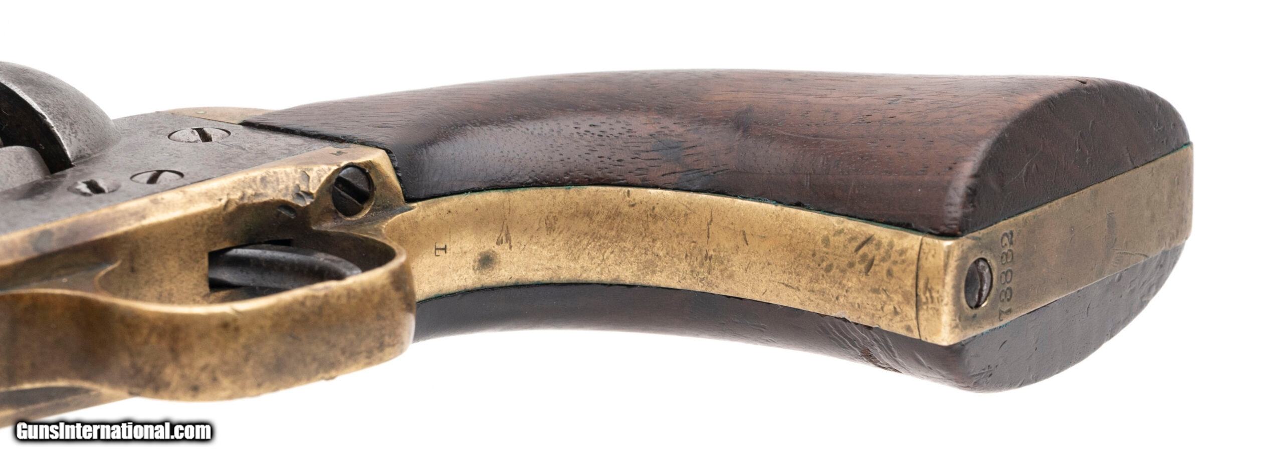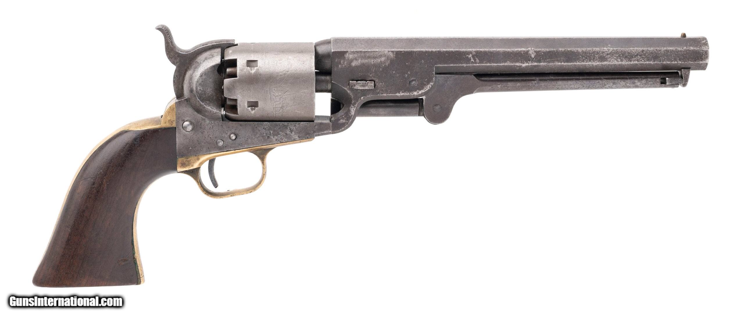 Description: "SN: 73882. Made in 1857. 36 caliber with a 7.5" barrel. This gun has the “U.S." marking on the left hand side of the frame and various small inspectors marks throughout. This is a very sharp gun with an even dark gray patina. All of the edges to the barrel are nice and sharp. Excellent cylinder scene remains, although it appears to have been chemically cleaned. The grips are very fine. No cartouche is observed although the grips are matching as is the rest of the gun. These guns are often referred to as “Army Navies" by collector as Naval issued guns have US Navy markings. Antique: Yes Price: $3,995.00 Contact Seller |