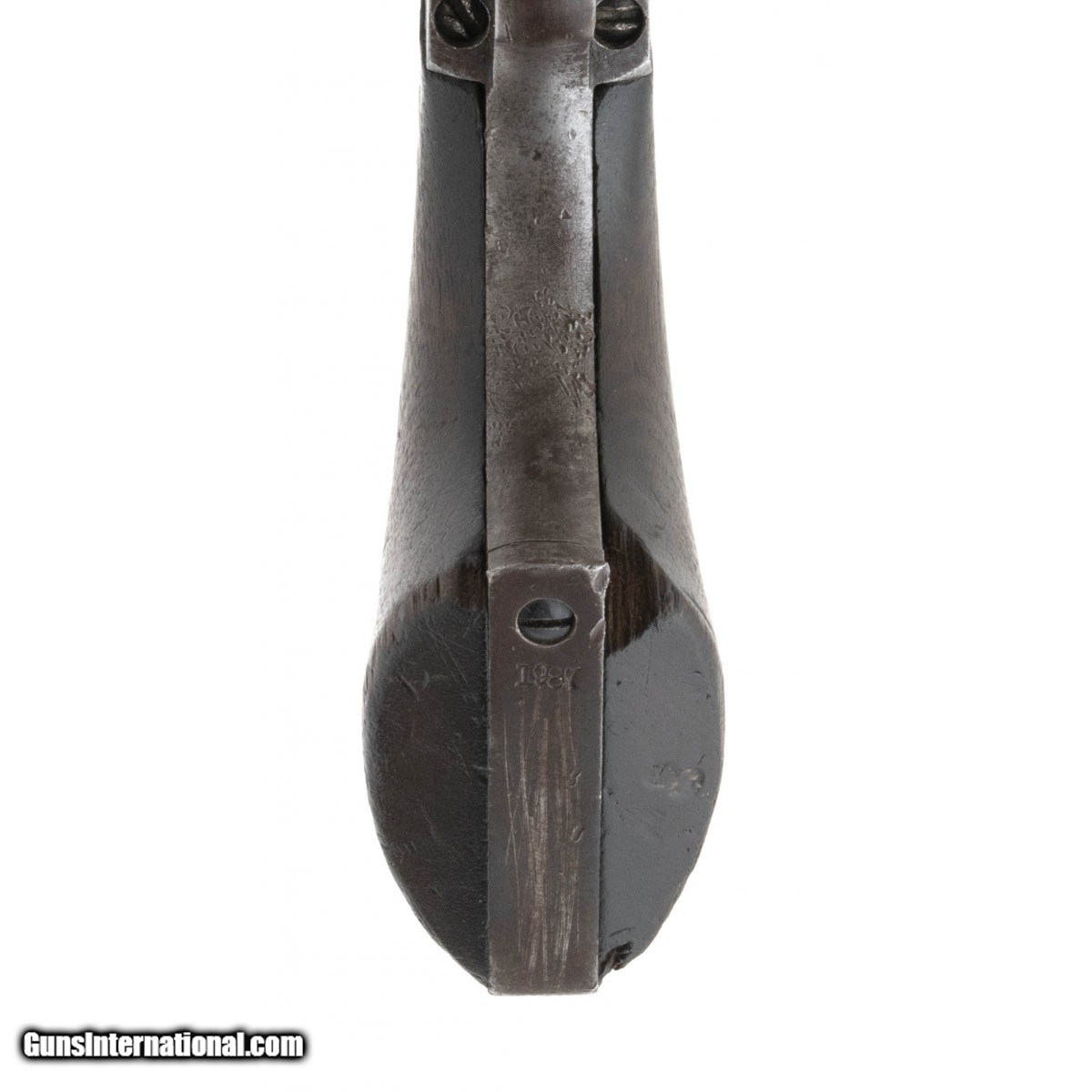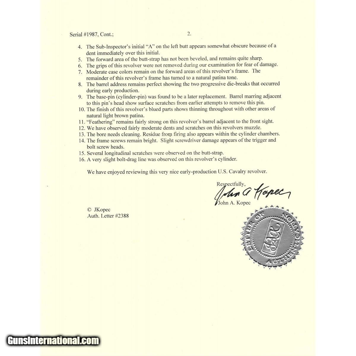 Description: "Serial number 1987. Made 1874. 45 LC with a 7 ½" barrel. Very fine gun with original finish. The barrel has a mixture of original blue and patina. The frame still has case colors. The hammer and the cylinder pin are replacements. This gun comes with a letter of authentication from expert John Kopec. Mr. Kopec finds this gun is completely authentic except for the two replacement small parts and awarded this gun a coveted silver seal that is reserved for only the finest guns he inspects. SOLD Antique: Yes |