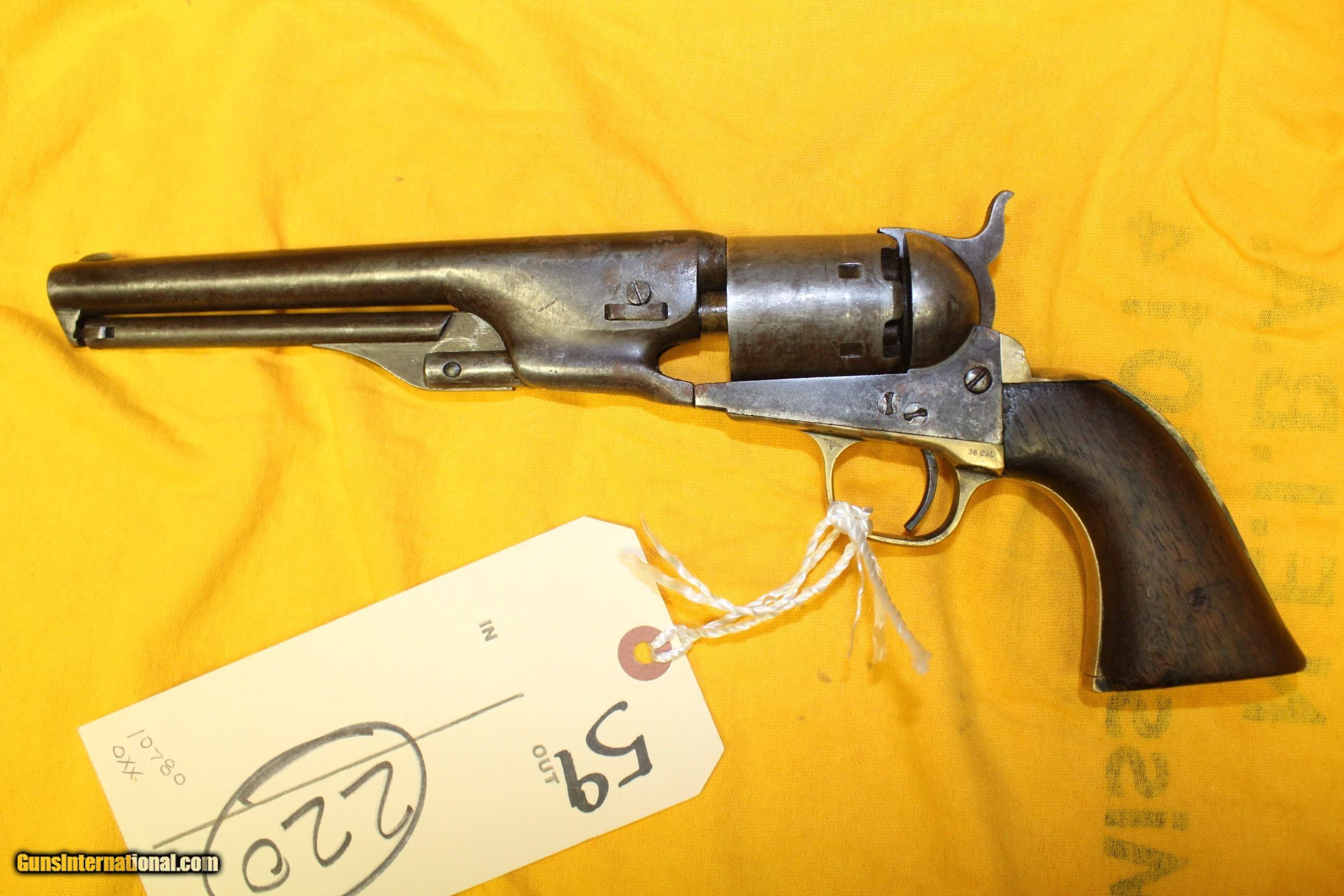 Description: Colt, 1861 Navy, matching numbers, 7 3/8" barrel with good rifling, blue finish 60%, brass frame good, walnut grips have one small chip on bottom, functions fine, some play at lockup, 100% satisfaction guarantee, you will receive gun pictured and described, others listed, we do combine shipping, thanks for looking. $15.00 shipping, no card fee. SOLD Manufacturer: Colt Model: 1861 Navy Serial Number: 19374 Barrel Length: 7 3/8 Condition: Very Good |