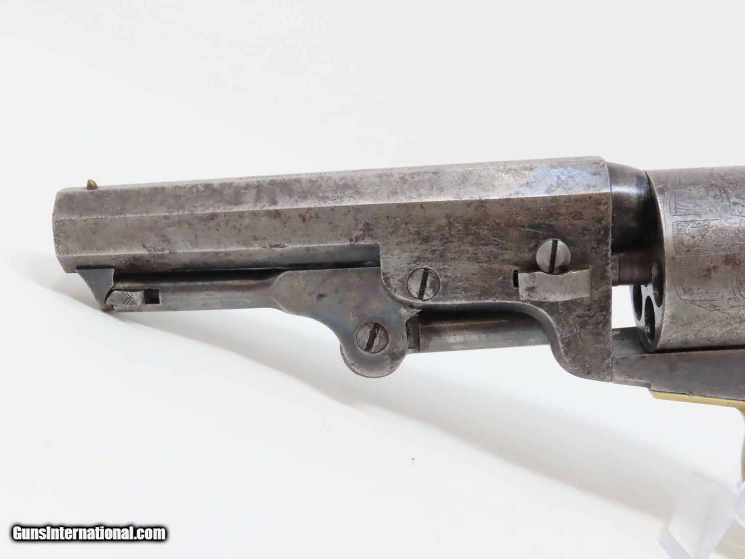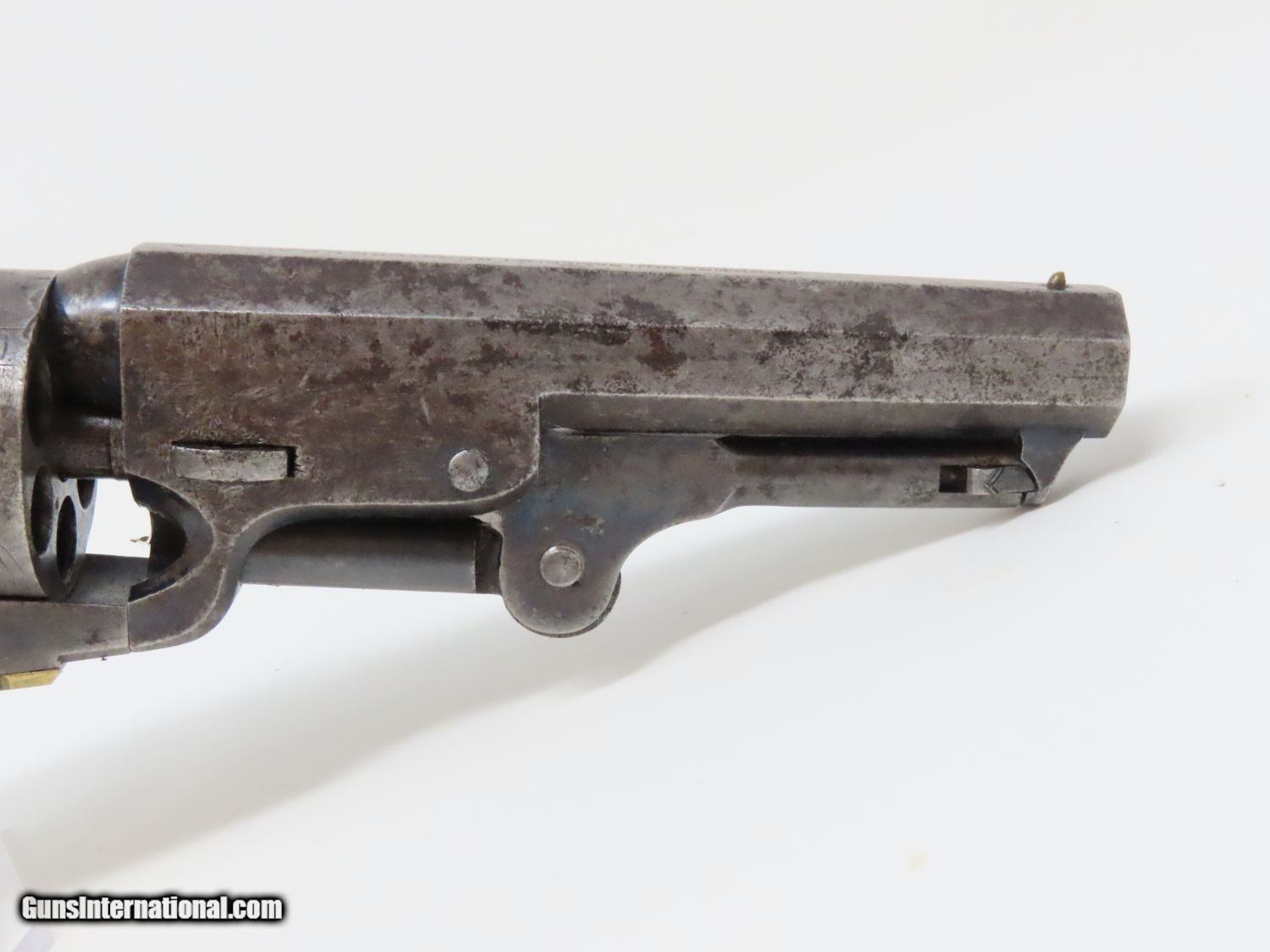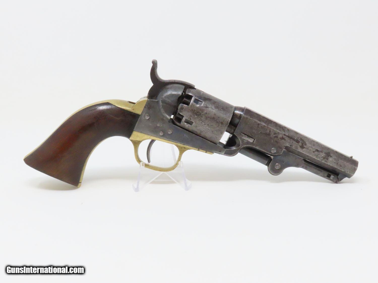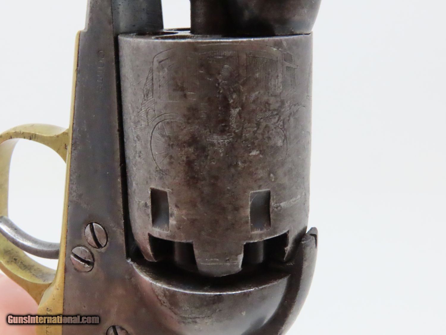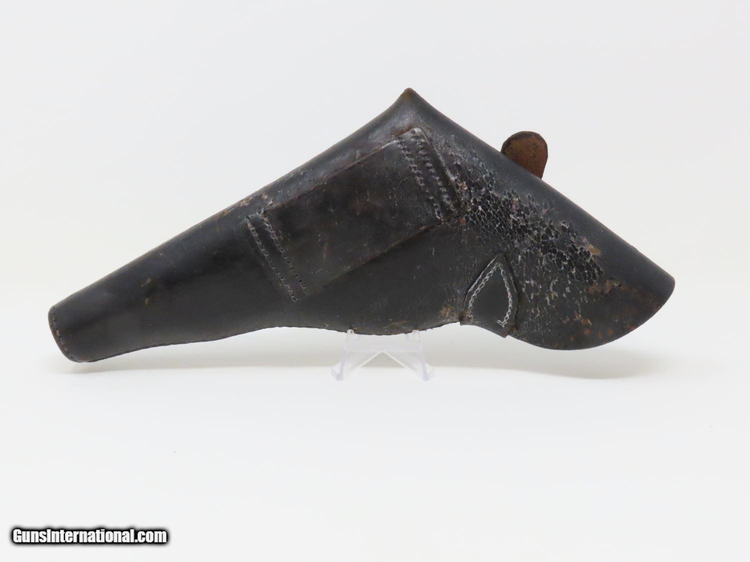 Description: 1865 Antique COLT 1849 POCKET .31 Revolver with Period Leather Flap Holster Made in 1865 in Hartford, Connecticut Here we present an antique percussion Colt 1849 Pocket Revolver, made in 1865 In Hartford, Connecticut. Over 280,000 of these were produced by Colt’s factory at Hartford by the end of the American Civil War in 1865. These were very popular and saw a lot of use on the battlefield, on the home front and in the West. These were some of the smallest, handiest pocket revolvers of the time. One of the most aesthetically pleasing aspects of this pistol is its cylinder scene. Cylinder scenes during this period were common, especially for Colt, not only for their visual appeal, but because it made a revolver more difficult to forge. The scene on the 1849 Pocket is that of a stagecoach robbery. The focal point is the stagecoach drawn by four horses. A woman in a dress is seen framed in the doorway of the side of the coach. The driver is standing alongside wielding his pistol against multiple assailants as the horses rear and struggle against their harnesses. Several of the bandits lay dying on the ground, one tries to control the horses, two are running away and one is in the process of falling dead after being shot. Not a bad way to show interested buyers what a pistol like this would be good for. It did a fine job as a self-defense handgun for the average citizen in 19th Century America. The overall condition is Very Good. The action is strong. The bore is sharp with some shine. All the numbers match and the cylinder scene is legible. Strong traces of original blue finish and nice case colors. A very solid revolver, just what you’d expect from Colt. Own the original! This is a legitimate antique and not a reproduction. Barrel is 3 3/4 inches. Caliber: .31 Overall condition as seen in photos. Very Fast. Very Safe. FREE SHIPPING WORLDWIDE. Delivered directly to your door by express mail! Guaranteed AUTHENTIC & Includes CERTIFICATE OF AUTHENTICITY. ancestryguns $1975 #191113 SOLD Antique: Yes |