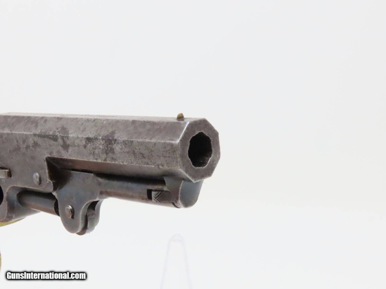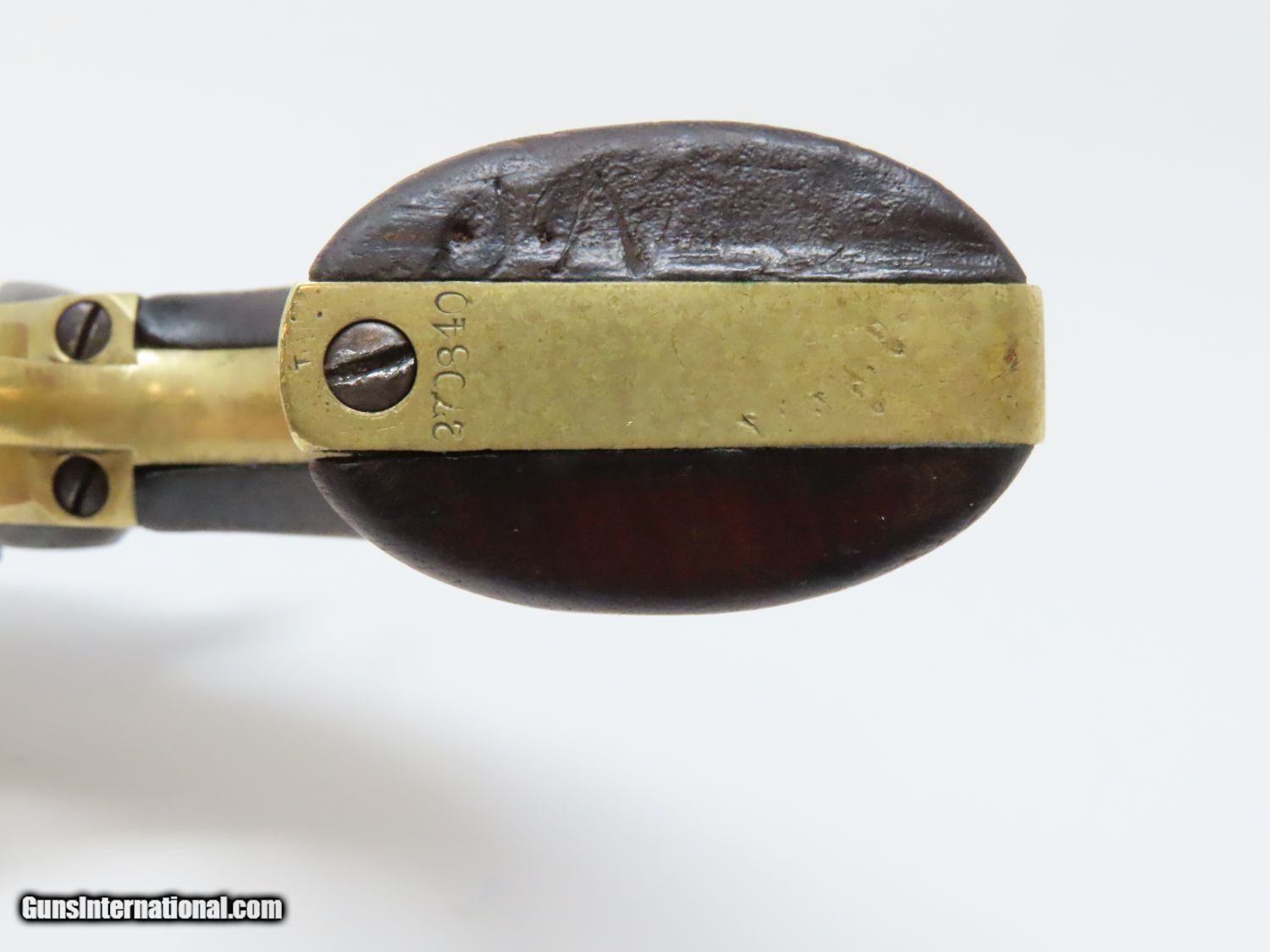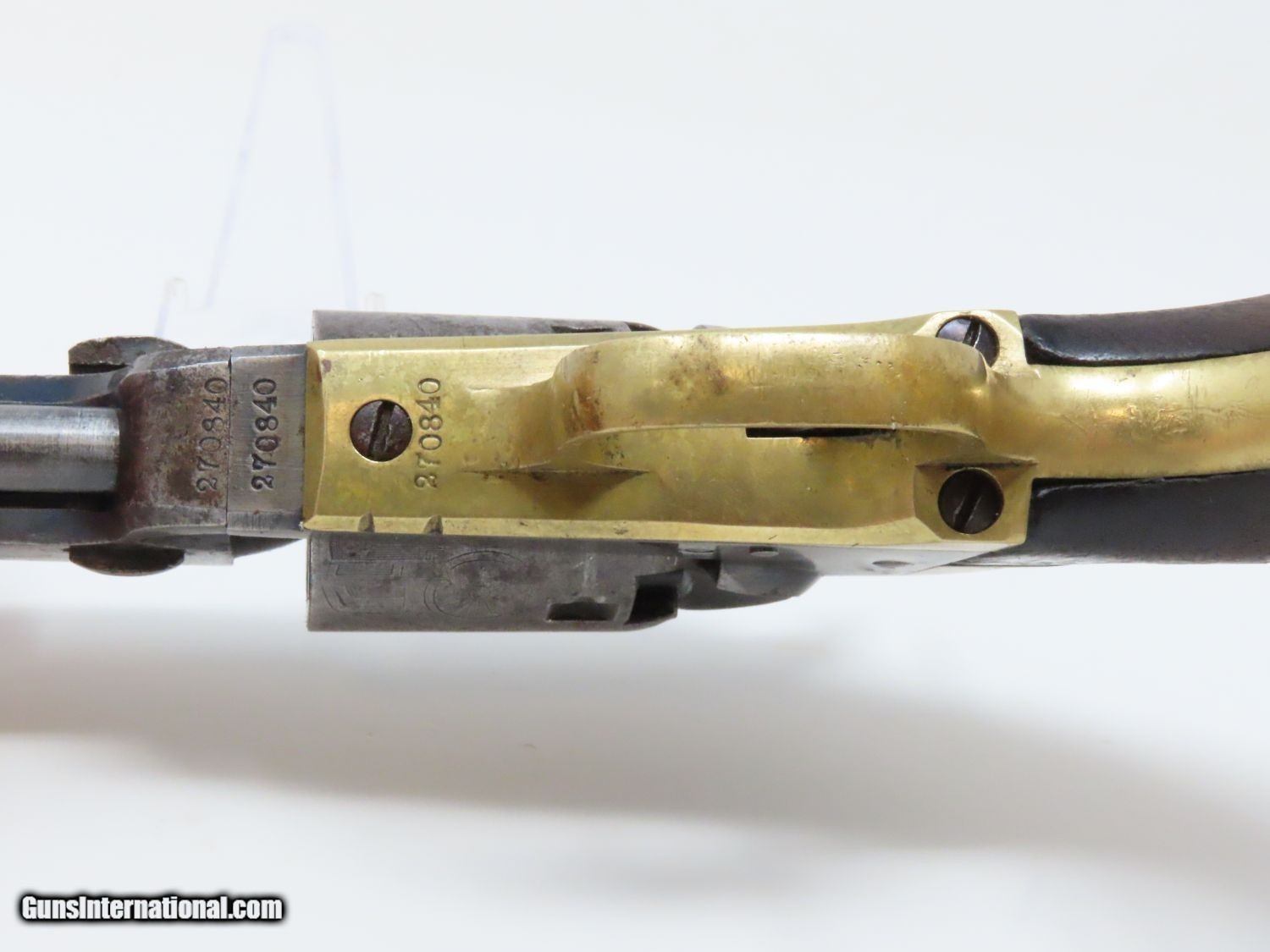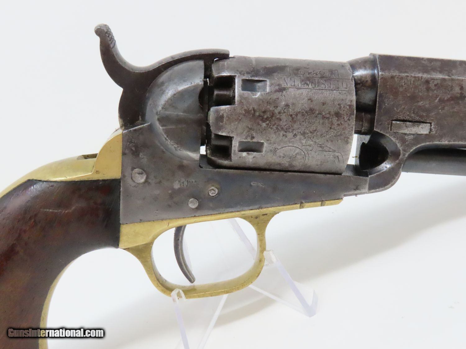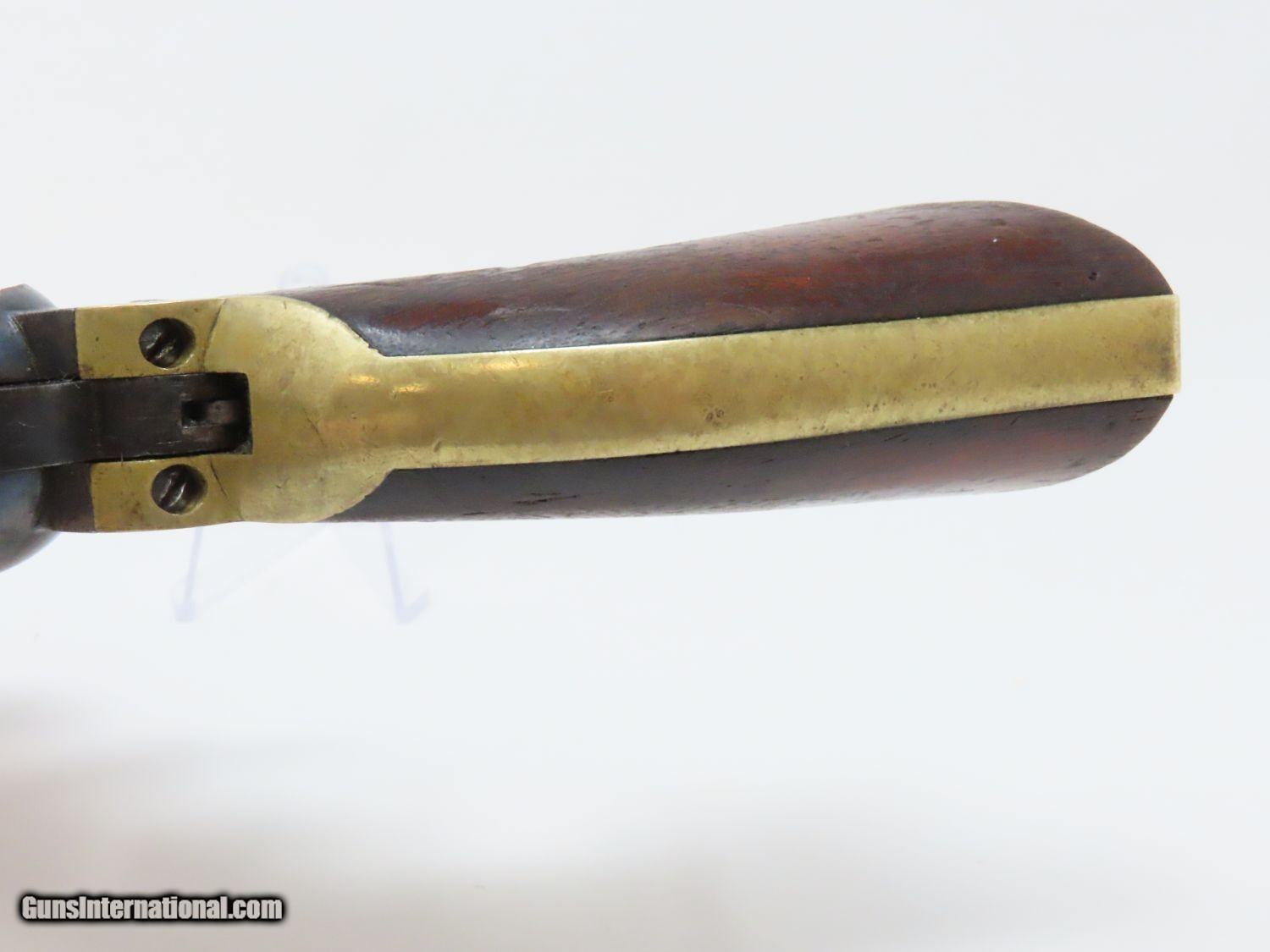 Description: 1865 Antique COLT 1849 POCKET .31 Revolver with Period Leather Flap Holster Made in 1865 in Hartford, Connecticut Here we present an antique percussion Colt 1849 Pocket Revolver, made in 1865 In Hartford, Connecticut. Over 280,000 of these were produced by Colt’s factory at Hartford by the end of the American Civil War in 1865. These were very popular and saw a lot of use on the battlefield, on the home front and in the West. These were some of the smallest, handiest pocket revolvers of the time. One of the most aesthetically pleasing aspects of this pistol is its cylinder scene. Cylinder scenes during this period were common, especially for Colt, not only for their visual appeal, but because it made a revolver more difficult to forge. The scene on the 1849 Pocket is that of a stagecoach robbery. The focal point is the stagecoach drawn by four horses. A woman in a dress is seen framed in the doorway of the side of the coach. The driver is standing alongside wielding his pistol against multiple assailants as the horses rear and struggle against their harnesses. Several of the bandits lay dying on the ground, one tries to control the horses, two are running away and one is in the process of falling dead after being shot. Not a bad way to show interested buyers what a pistol like this would be good for. It did a fine job as a self-defense handgun for the average citizen in 19th Century America. The overall condition is Very Good. The action is strong. The bore is sharp with some shine. All the numbers match and the cylinder scene is legible. Strong traces of original blue finish and nice case colors. A very solid revolver, just what you’d expect from Colt. Own the original! This is a legitimate antique and not a reproduction. Barrel is 3 3/4 inches. Caliber: .31 Overall condition as seen in photos. Very Fast. Very Safe. FREE SHIPPING WORLDWIDE. Delivered directly to your door by express mail! Guaranteed AUTHENTIC & Includes CERTIFICATE OF AUTHENTICITY. ancestryguns $1975 #191113 SOLD Antique: Yes |