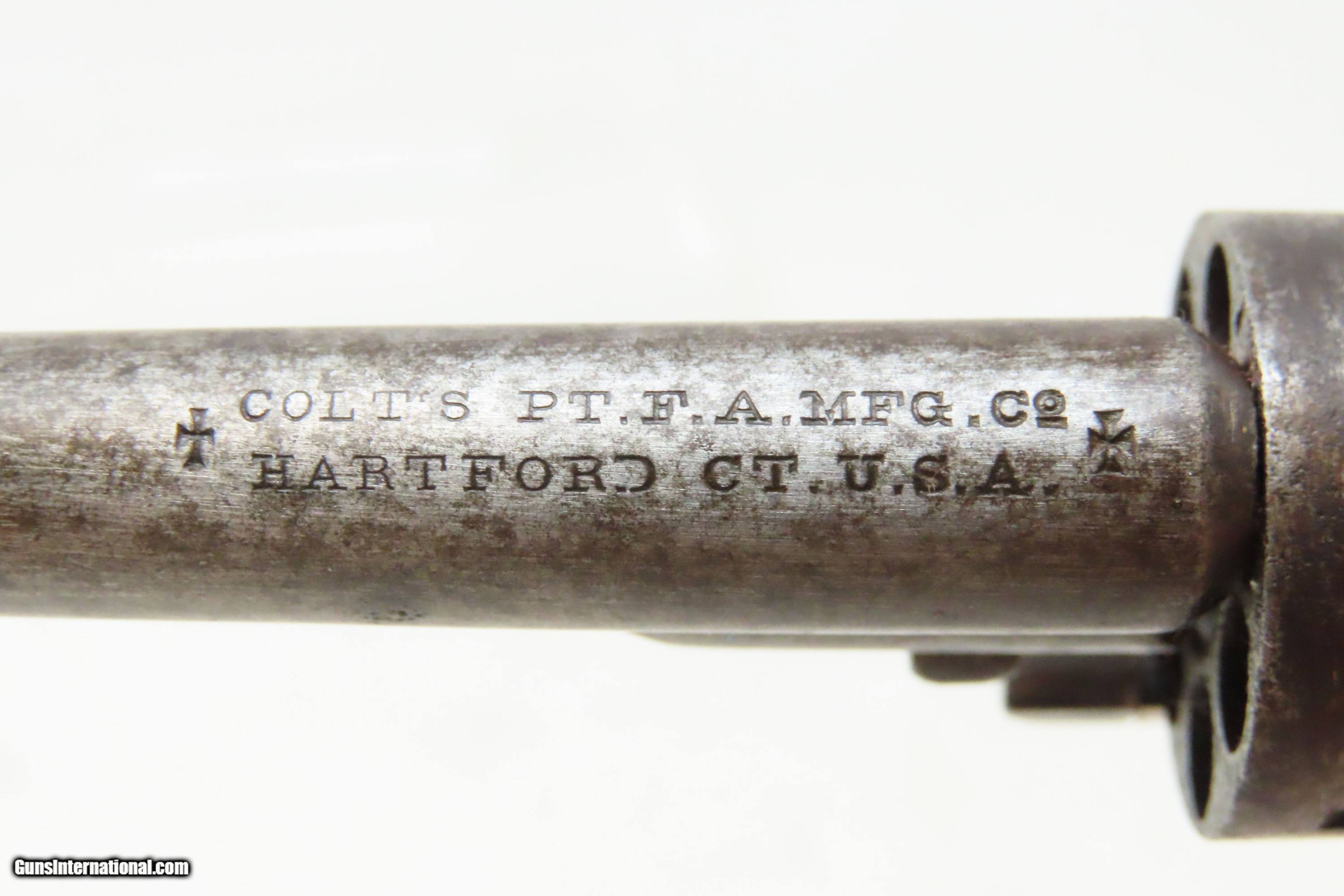 Description: 1874 mfg. Antique COLT “Open Top” .22 RF Self Defense SA POCKET Revolver Colt’s Answer to Smith & Wesson’s No. 1 Revolver Here we present an antique Colt Open Top .22 Rimfire Single Action Spur Trigger Pocket Revolver, made in 1874 in Hartford, Connecticut, with a production run from 1871 through 1877. These revolvers were made for self-defense. They were introduced in 1871, shortly after the Smith & Wesson held Rollin White Patent expired, opening the floodgates to a hungry market that had been dying to fully implement metallic cartridge firearms loaded into a totally bored through cylinder. From 1857 to 1869 Smith & Wesson had exclusivity with these concepts and rightfully dominated the marketplace. The idea was to provide the commercial market with a very small and concealable firearm. Not everyone was a cowboy and carried Colt’s Single Action Army in the Wild West days. Many civilians may not have carried if not for something that they could stick in their pocket, purse or muff, much like today. The Open Top was relatively successful for a time, with 7 shots of .22 rimfire, but production ceased by about 1877 due to very stiff competition from a plethora of companies making similar but cheaper versions known today as “Suicide Specials”. The overall condition is good. Strong action. The bore is in good shape for its age with visible rifling. Both grips are in good shape with an average amount of handling wear. Legible markings. Numbers match. Own the original! This is a legitimate antique and not a reproduction. Barrel is 2-3/8 inches. Caliber: .22 Rimfire Overall condition as seen in photos. Very Fast. Very Safe. FREE SHIPPING WORLDWIDE. Delivered directly to your door by express mail! Guaranteed AUTHENTIC & Includes CERTIFICATE OF AUTHENTICITY. ancestryguns $1150 #240823 SOLD Antique: Yes |