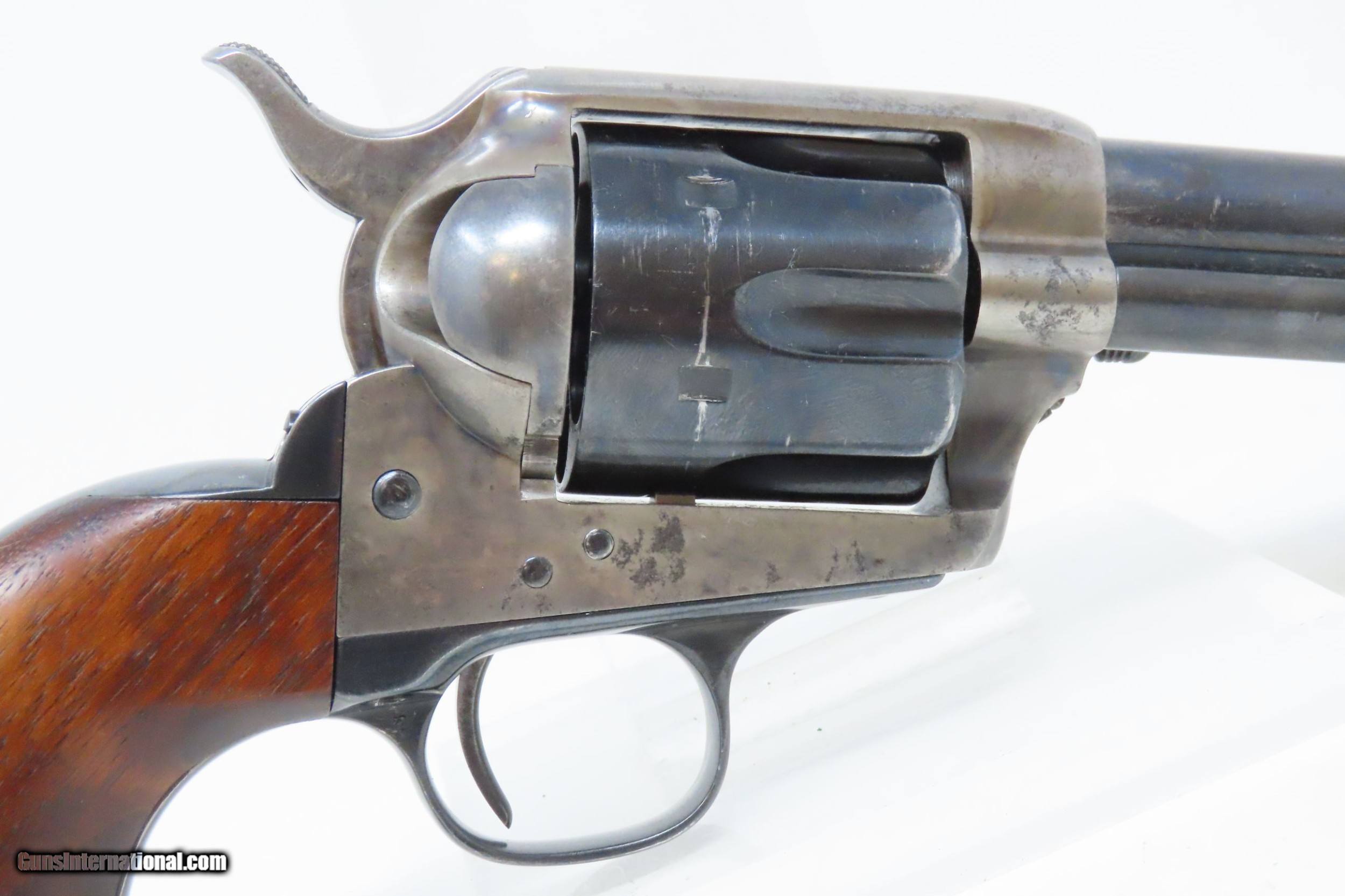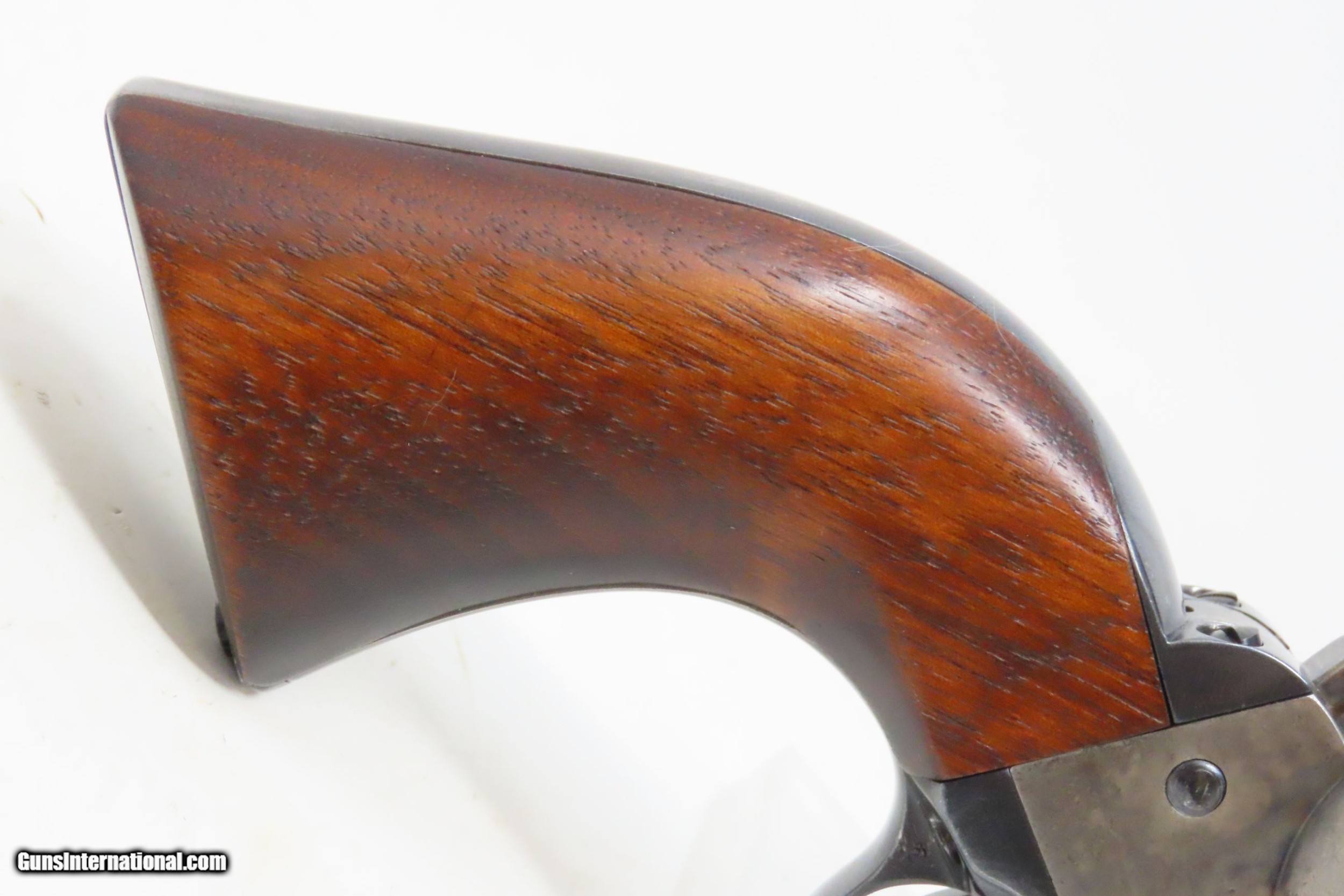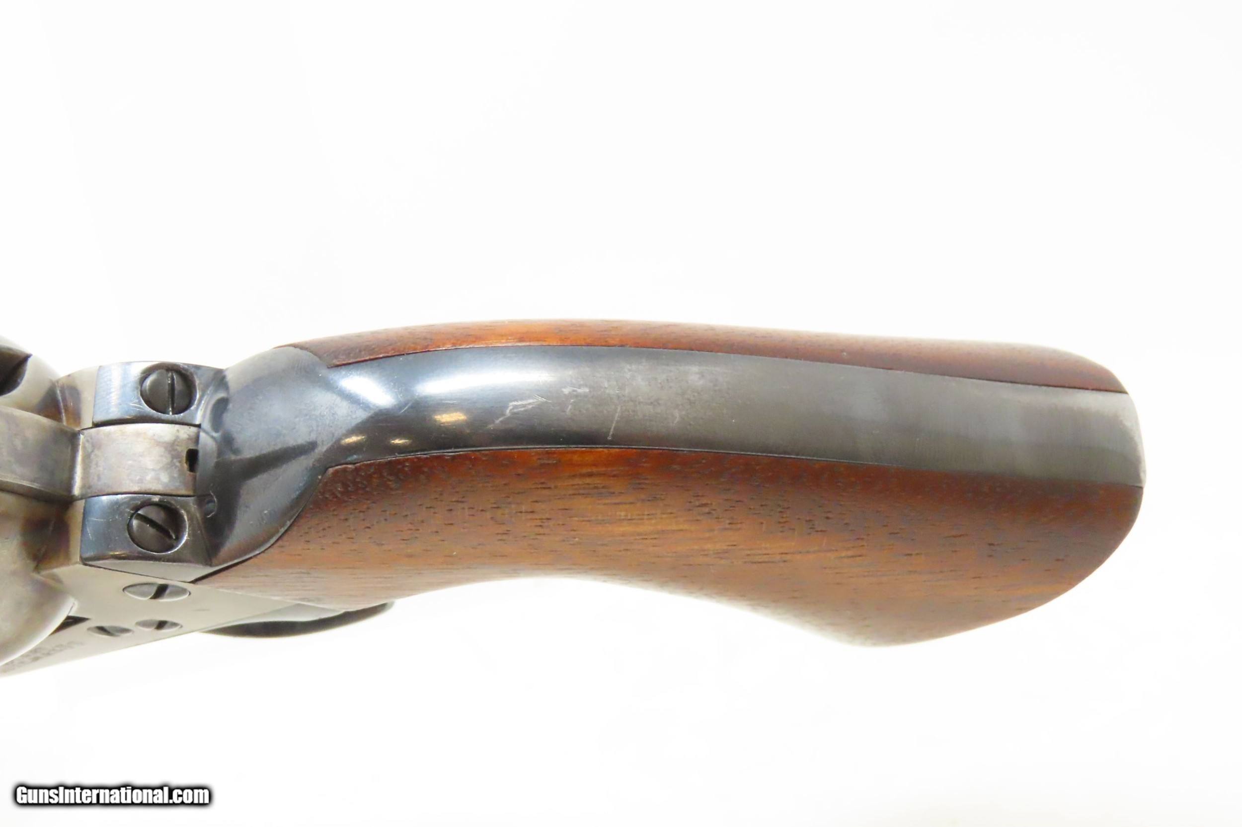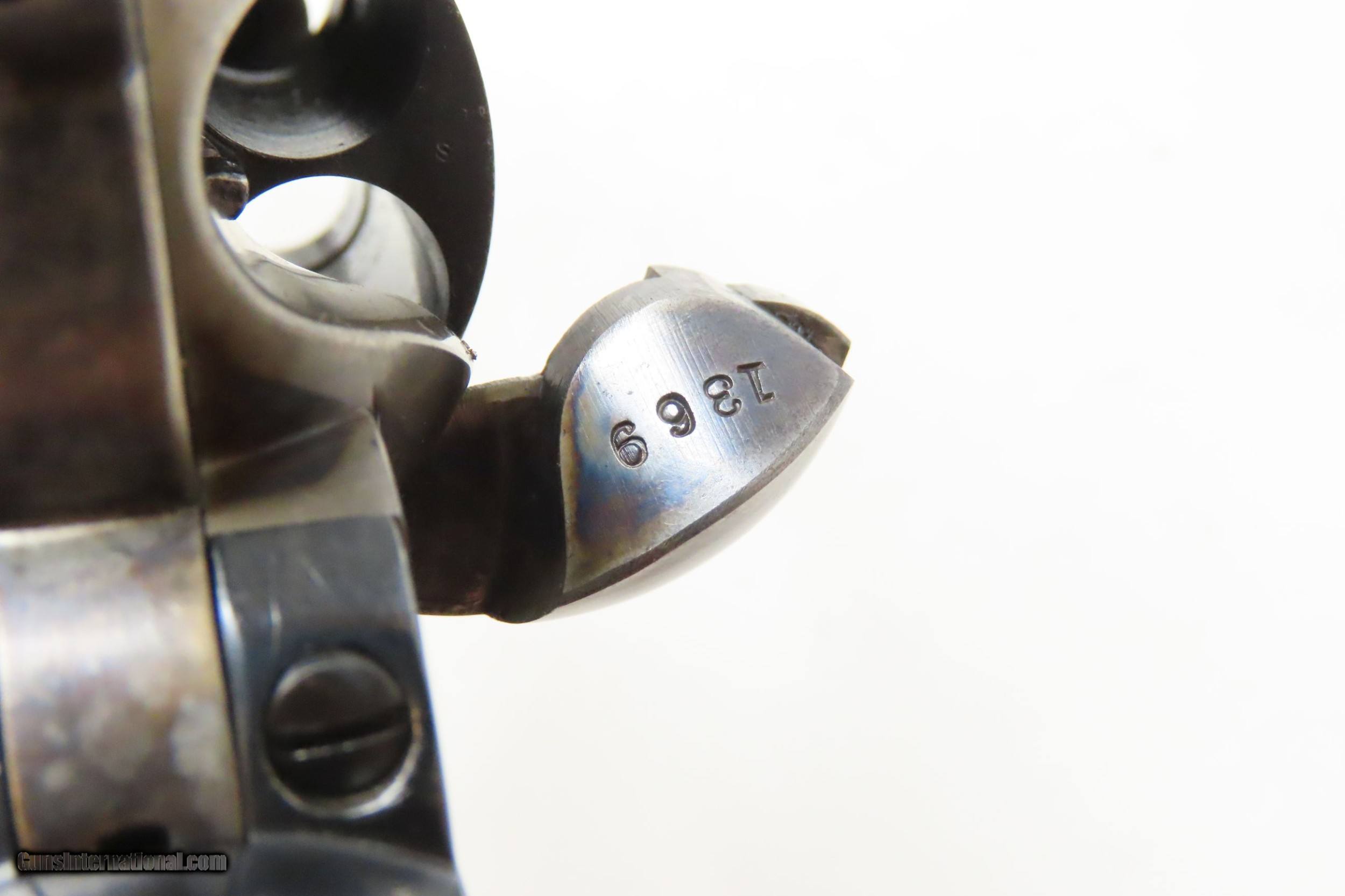 Description: 1891 Antique U.S. COLT ARTILLERY Model .45 Single Action Army Revolver SAA Sidearm from the Spanish-American/Philippine War Period Here we present an antique Colt Single Action Army Revolver Artillery Model, with the frame made in 1891. The Colt Single Action Army, or SAA, is a classic “six-shooter” that is a worldwide icon of the United States of America and the Western Frontier. Wielded by both the worst of men and the best, the famous Single Action Army is also well-known as the Peacemaker. Introduced in 1873, the basic design remained, with a few interruptions, in production and is still manufactured today by Colt and other companies. The Artillery or Springfield Armory Model of the SAA is a period (1895-1903) armory or factory refinished gun to extend U.S. military service. Only about 17,000 of these refurbished guns were completed. In all but the rarest variant of the already rare Artillery Model, the serial numbers will be mixed. U.S. military purchased SAAs are among the most sought after historic sidearms of the era, having been used in action in the Spanish-American War and the Philippine-American War by the U.S. Army. They were originally issued with 7½" barrels in .45 Colt. Most of these guns, as this one is, had the barrels shortened to 5½". The frame is inspector marked “R.A.C” for Rinaldo A. Carr, the hammer is marked “H.N.” for Henry Nettleton, the barrel is numbered “5295” (partial serial) and is P proofed and “D.F.C.” inspected by David. F. Clark. There is a faint P proof on the outside diameter of the cylinder and a “K” on the rear. The grip frame and trigger guard numbers match. The overall condition is very good. Original/armory refinish. The barrel, grip frame, and cylinder still bear a nice blue finish while the frame and hammer have still-visible, silvered case colors. The action is excellent, holding the safety notch and the half-cock and full-cock notches. The bore is shiny bright with sharp rifling. The grips are solid walnut and are nice replacements. This is a legitimate antique and not a reproduction. Barrel is 5-1/2 inch. Caliber: .45 Colt Overall condition as seen in photos. Very Fast. Very Safe. FREE SHIPPING WORLDWIDE. Delivered directly to your door by express mail! Guaranteed AUTHENTIC & Includes CERTIFICATE OF AUTHENTICITY. ancestryguns $4895 #227186 SOLD Antique: Yes |