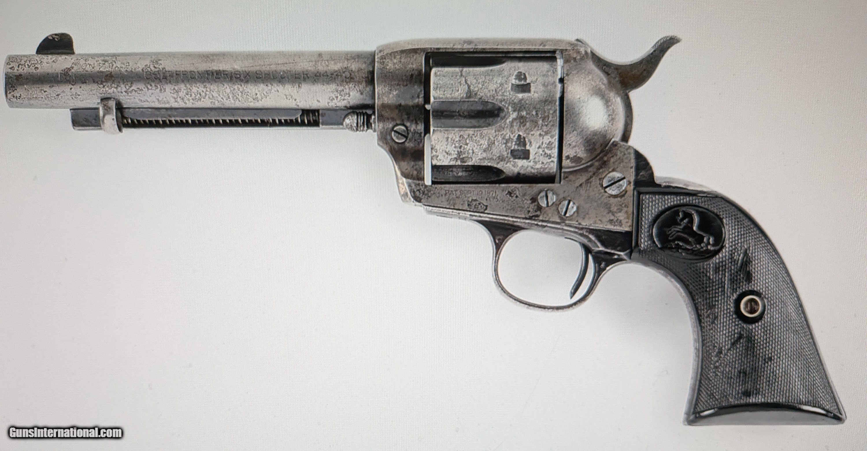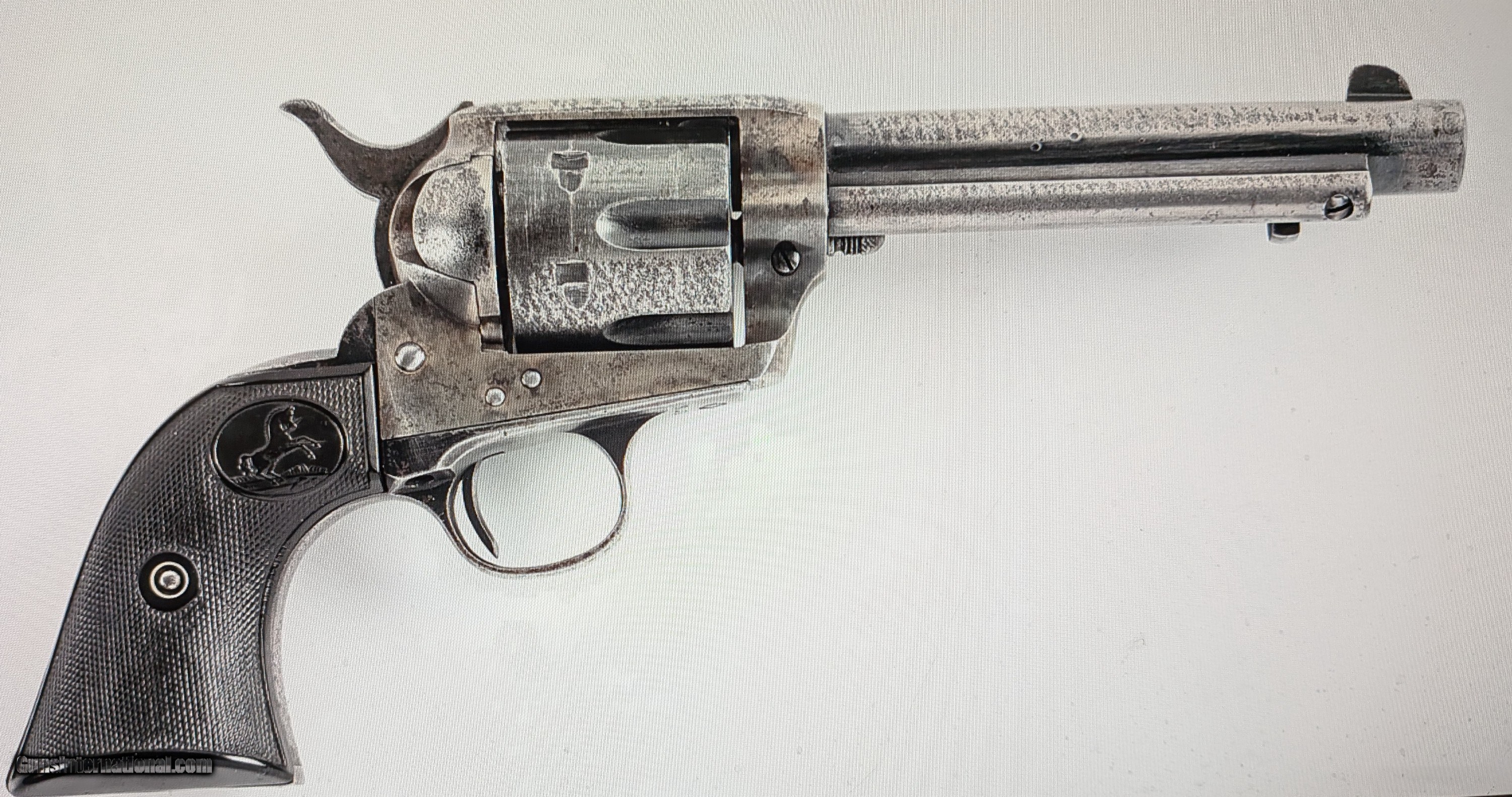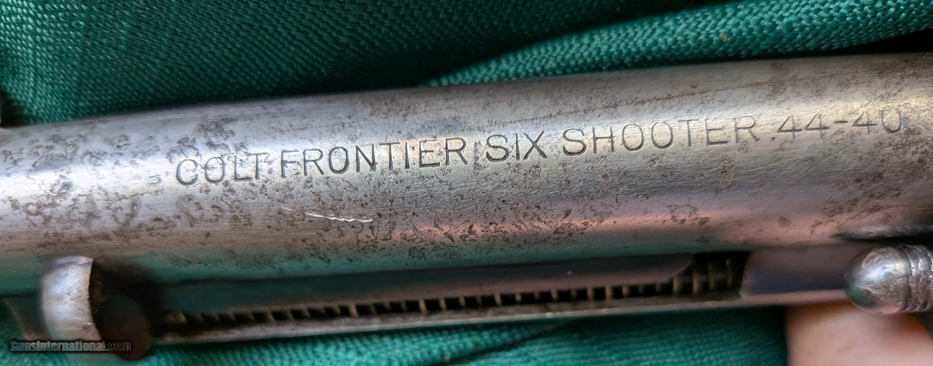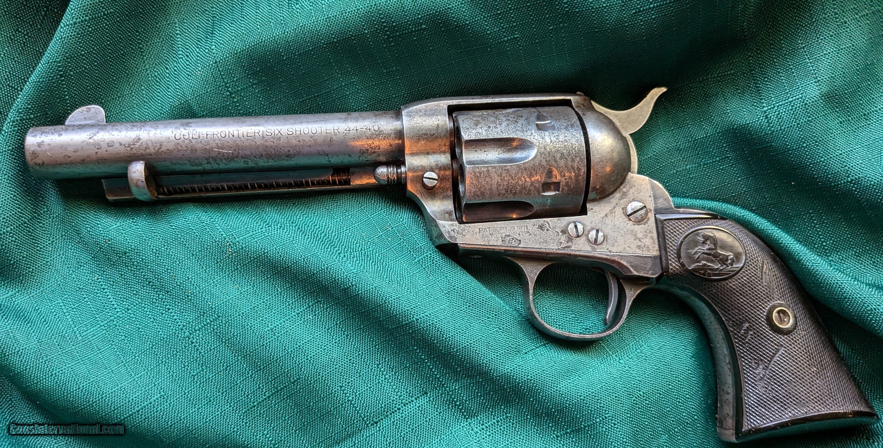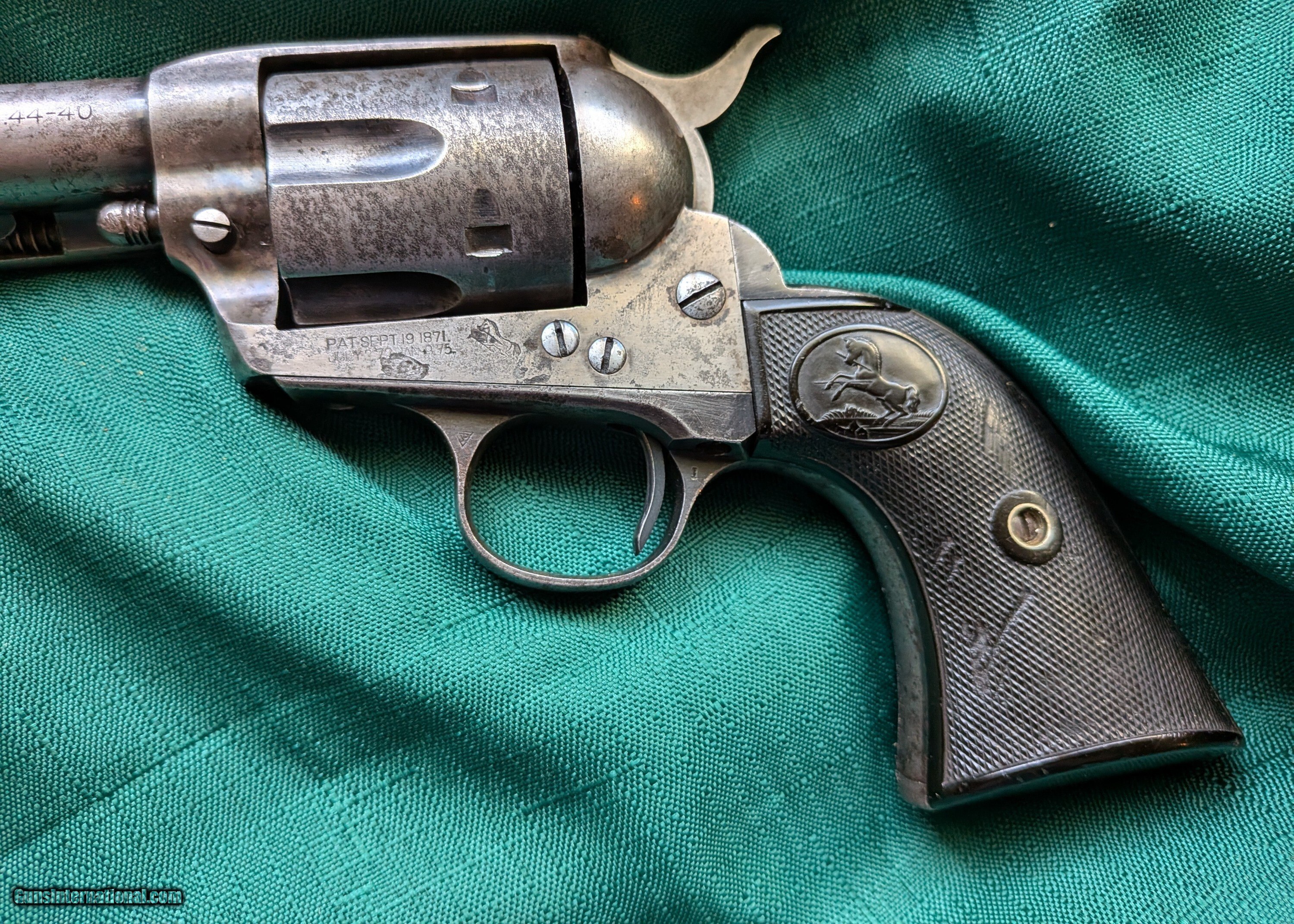 SN327930 Dates to 1913.CCR or FFL needed. Standard blue and case color finish with Colt gutta percha grips. Proper one line barrel address and the two line patent legend with circled pony on left side of frame. The barrel has the later "COLT FRONTIER SIX SHOOTER 44-40" legend. The Colt gutta percha grips both have the matching etched serial number. CONDITION:Very NICE 4 click action. Good to very good. All case color has patterned out. Cylinder is patina with flashes of blue in flutes. Barrel is basically patina with flash of protected blue. Grips are excellent. Mechanically sound with strong half cock Bore is clean and bold. Good sound Colt.