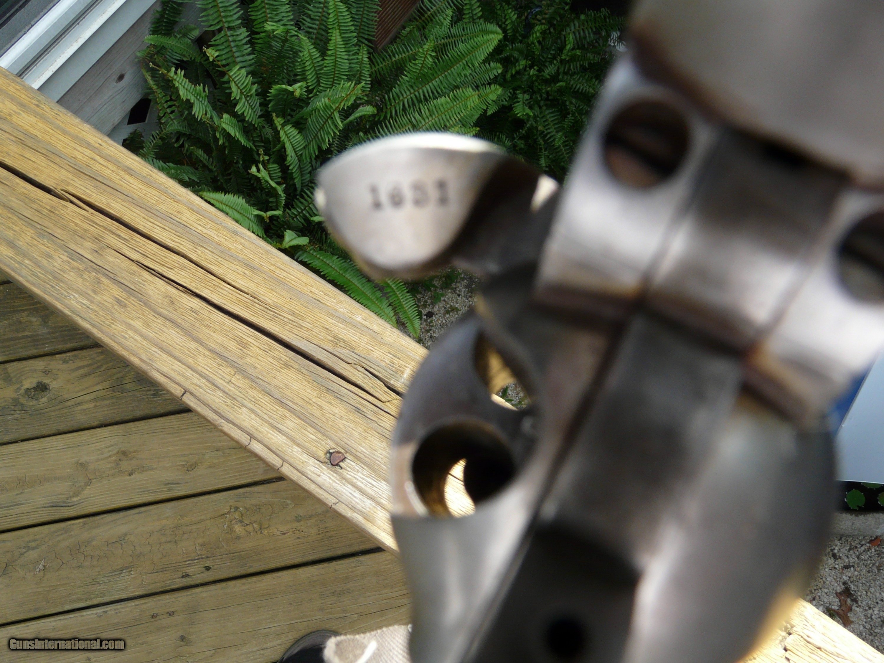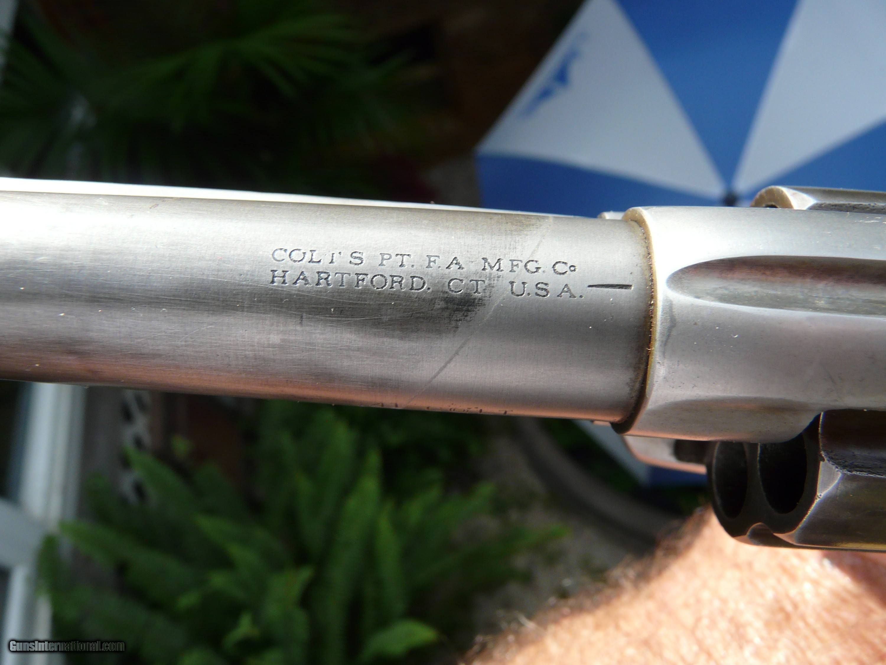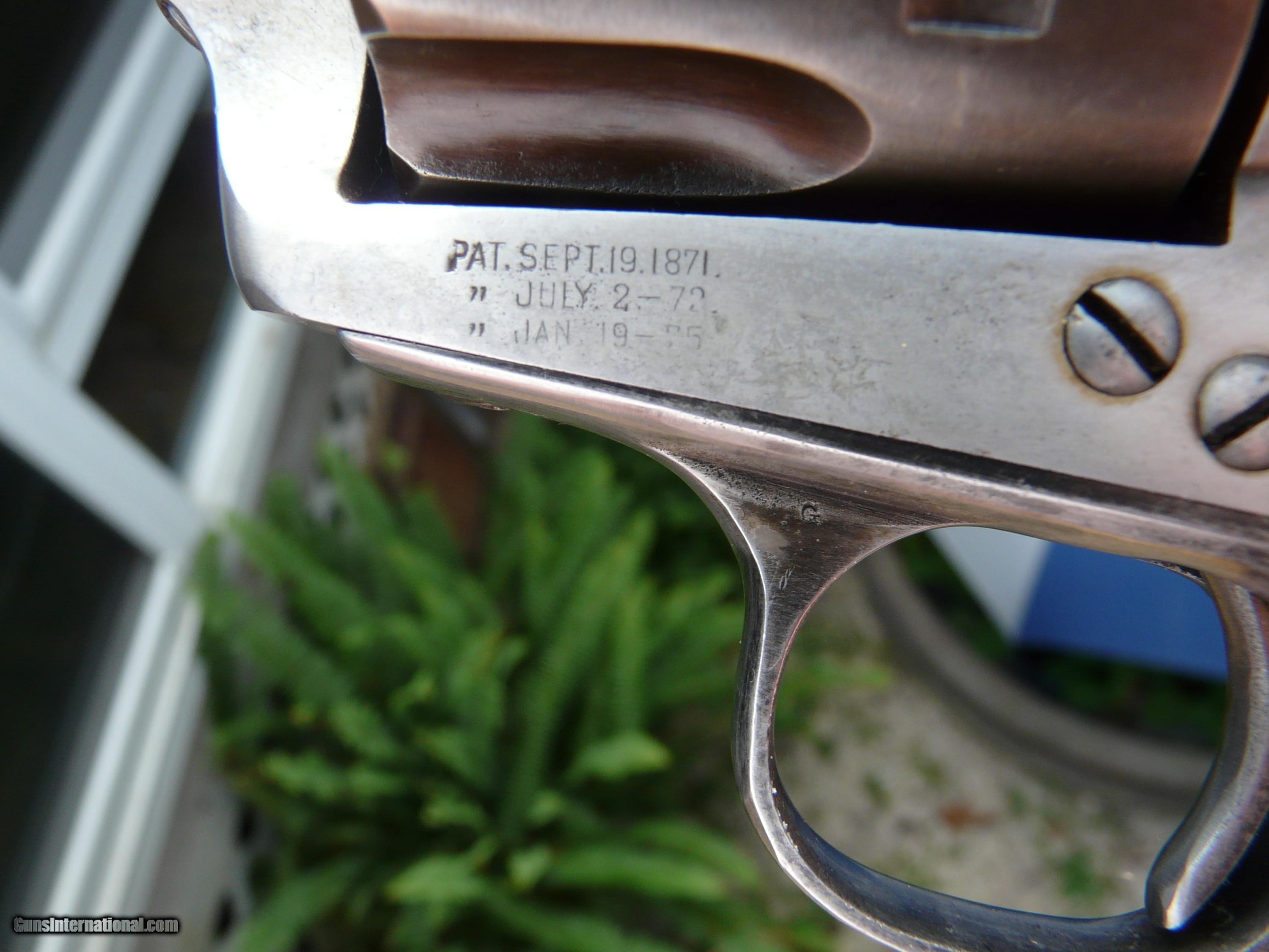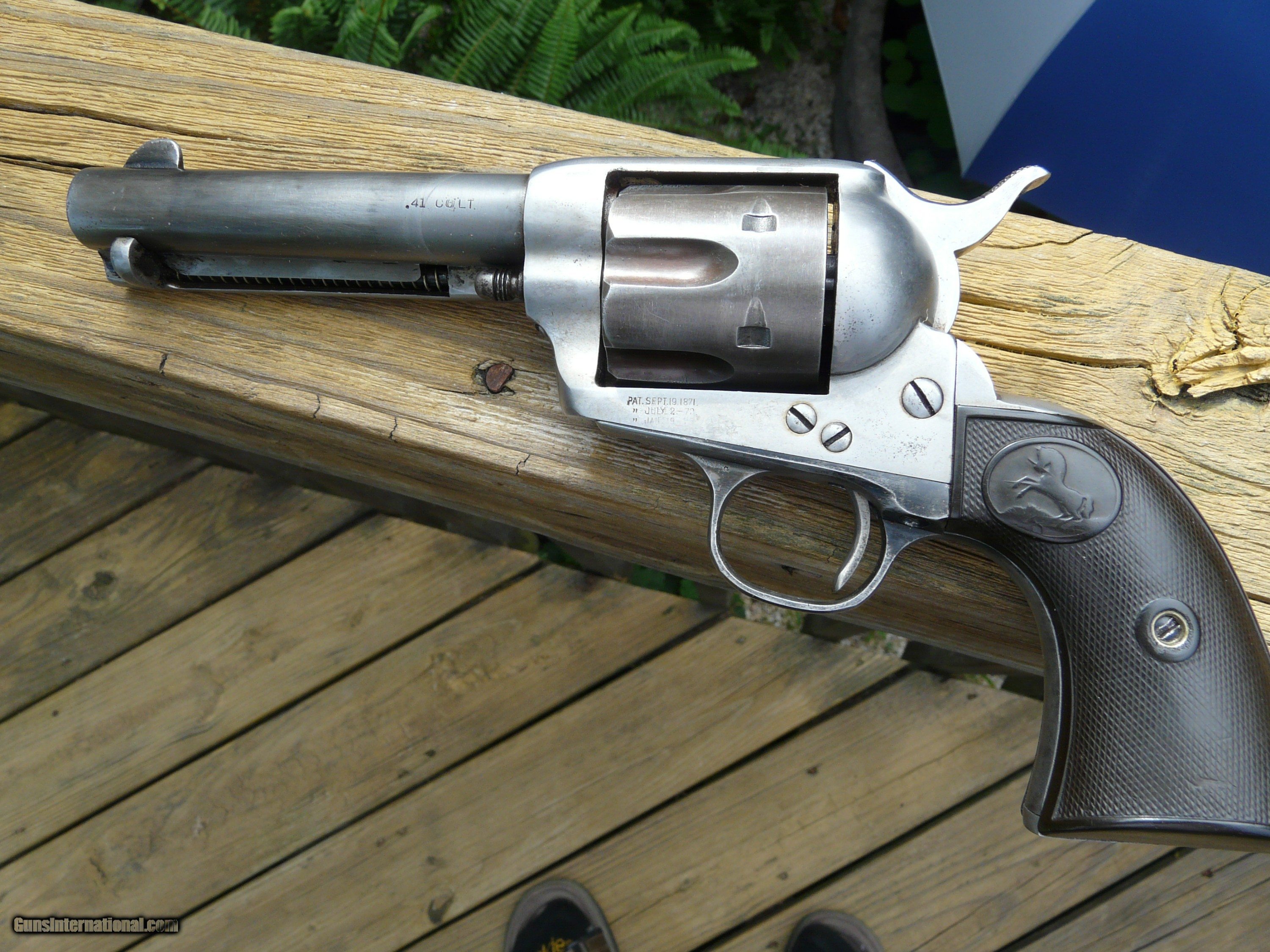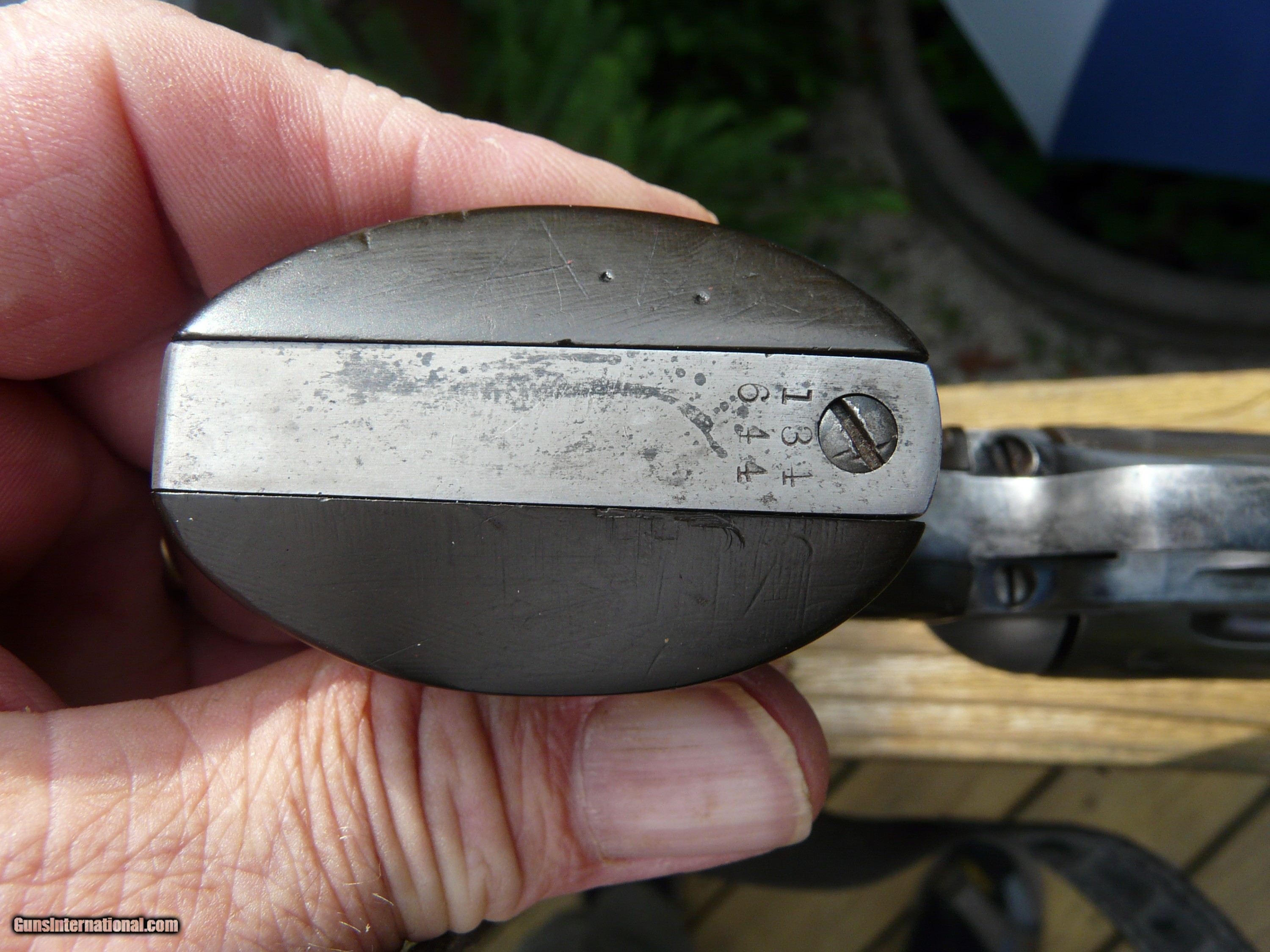Description: 1890 Colt SAA, 41 Cal, 4 3/4 barrel, 2 line address, good lettering on barrel, matching serial numbers , faint 3rd line pantent. Grips fit proper, action works very good. 4 strong clicks. Barrel has good rifling & usual pits for old black powder gun. Revolver has metal that has been cleaned. Some pitting is by front of ejector housing on barrel. Very smal see photos. Not to many short barrels in 1890. Price is $2650. plus $50. Shipping. No FFL required. Ships direct. Call 336 859-8307, text 530 263-1991, email nevadacalgmail. Please no calls ,to the 530 , just text. Thanks SOLD Handgun Caliber: .41 Long Colt (.41 Colt, .41 LC) |