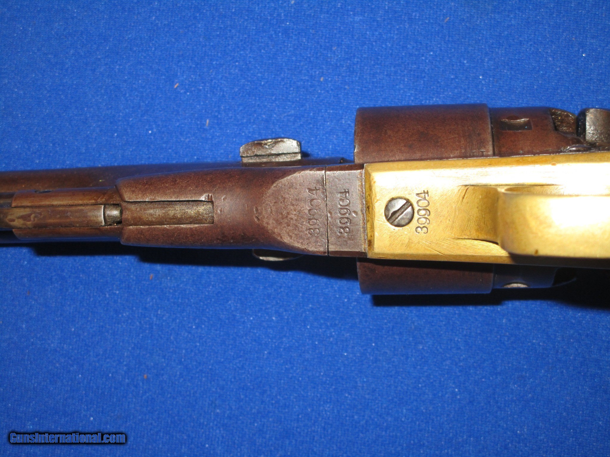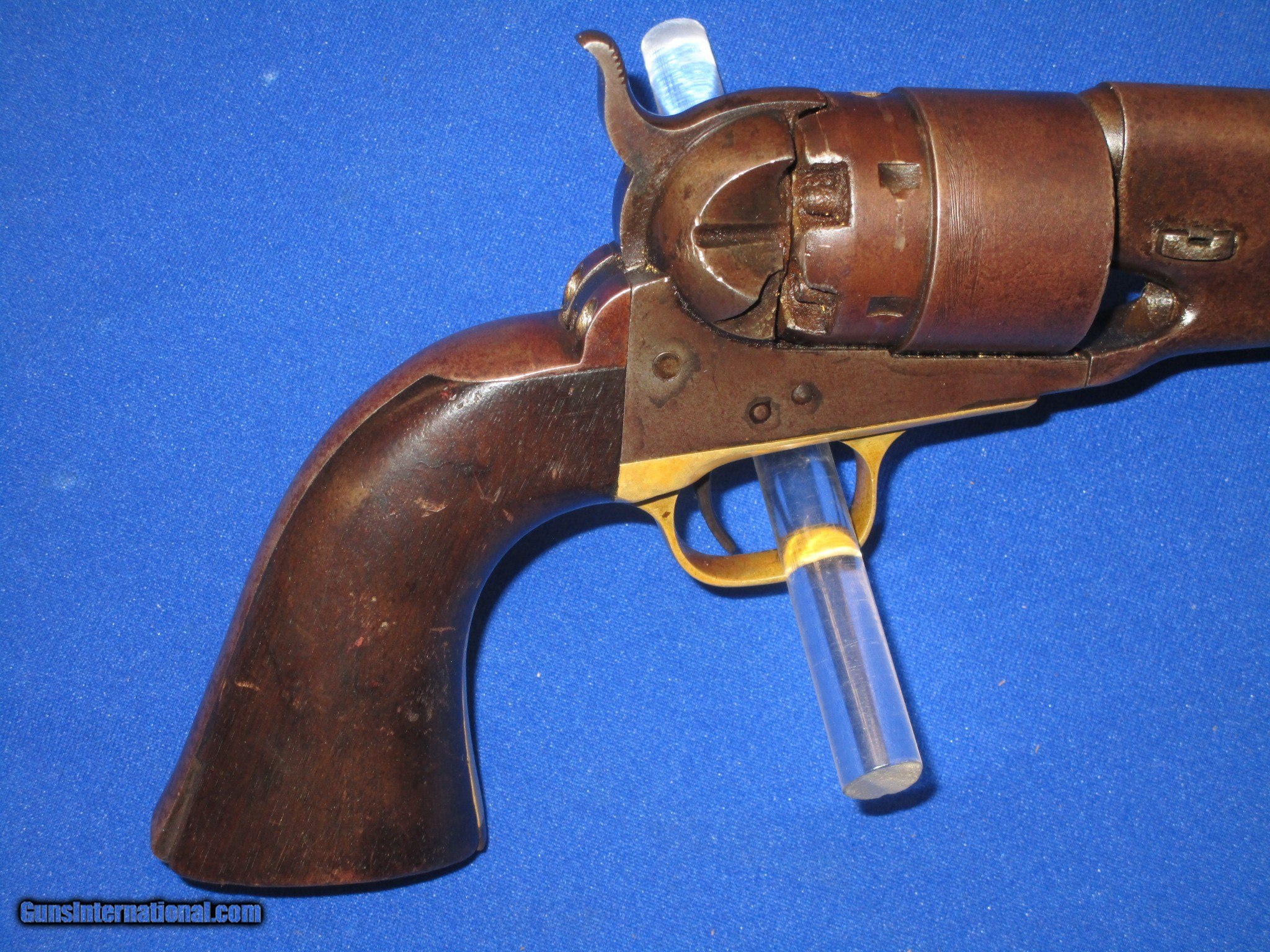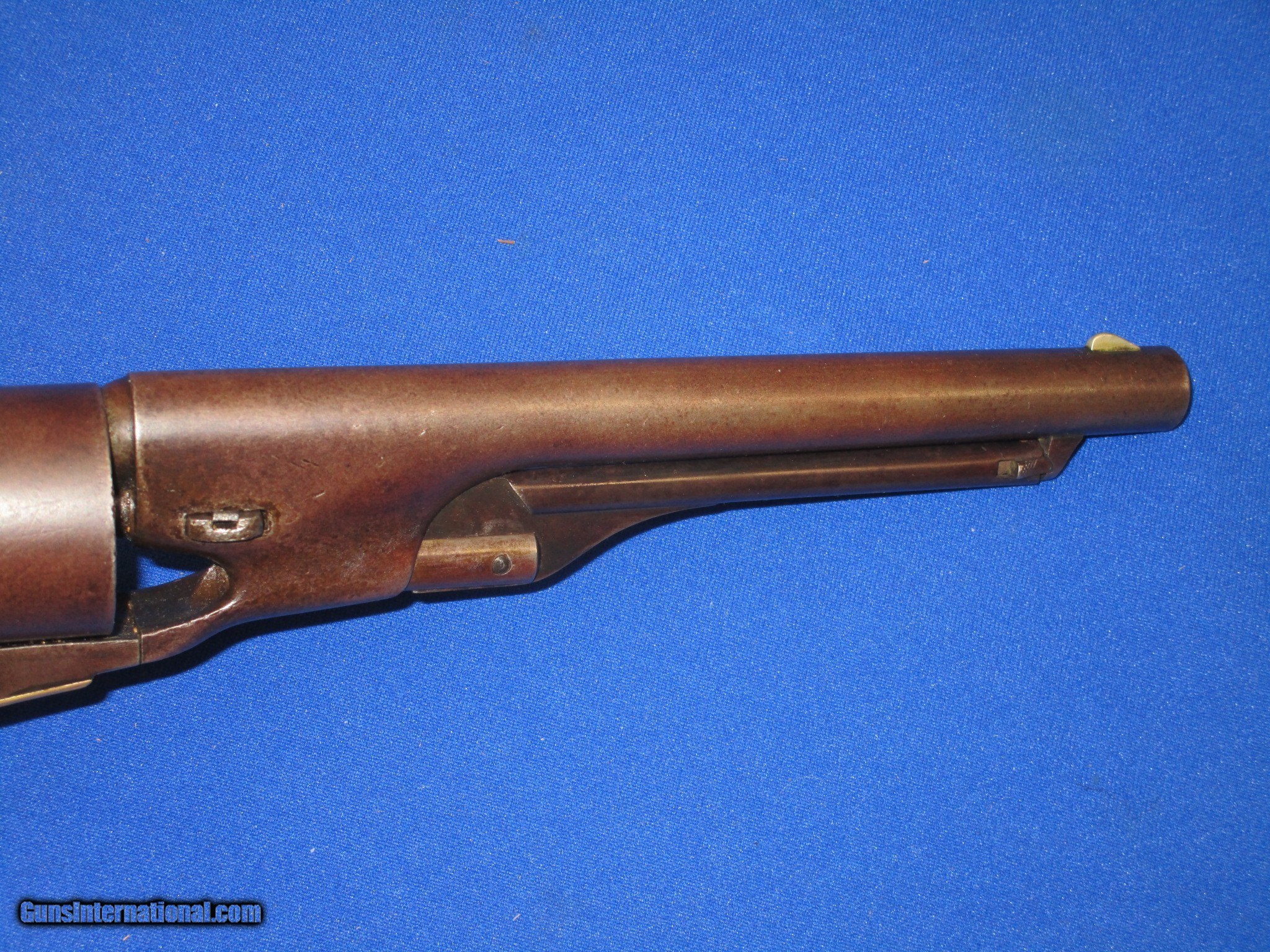Description: AN EARLY U.S. CIVIL WAR MILITARY ISSUED COLT MODEL 1860 PERCUSSION ARMY REVOLVER IN VERY NICE UNTOUCHED CONDITION. SERIAL #39,904 WITH ALL MATCHING NUMBERS. MADE IN 1862, ALL ORIGINAL AND COMPLETE. THE ARMY REVOLVER HAS FINE METAL, MARKINGS, AND EDGES. IT HAS A NICE CYLINDER SCENE WHICH SHOWS LIGHT THINNING IN SPOTS. IT IS FULLY U.S. SUB INSPECTED. ALL OF THE METAL ON THE GUN HAS AN UNTOUCHED AND NATURAL CHOCOLATE BROWN PATINA ON IT. THE BRASS TRIGGER GUARD IS ALSO UNTOUCHED. IT HAS FINE & FULL ORIGINAL GRIPS WITH A VERY CLEAR U.S. MILITARY INSPECTORS CARTOUCHE ON THE LEFT SIDE. IT HAS A FINE ACTION & VERY NICE BORE. THIS IS A VERY UNTOUCHED & EARLY EXAMPLE OF A FINE U.S. MILITARY ISSUED CIVIL WAR COLT MODEL 1860 ARMY REVOLVER! SOLD Antique: Yes Manufacturer: COLT Model: U.S. 1860 ARMY REVOLVER Serial Number: 39,904 Caliber Info: .44 Condition: NICE & UNTOUCHED Metal Condition: VERY NICE Wood Condition: FINE Bore Condition: VERY GOOD PLUS |