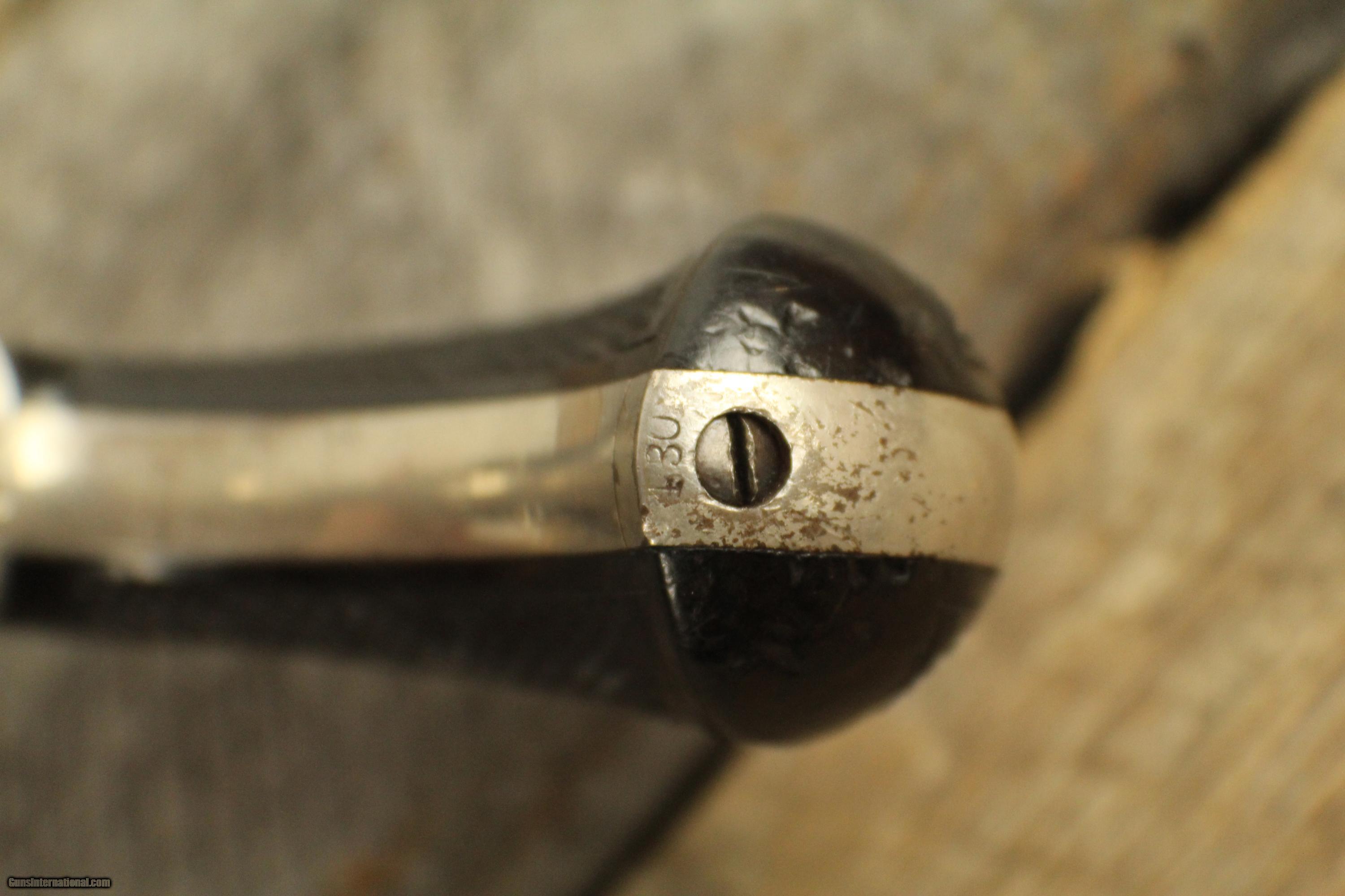 Description: Antique Cased Colt 1877 Lightning Sheriff’s Model Revolver First Year Serial Number! Instant Display! Here is a Colt 1877 Lightning double action revolver in .38 Colt. This model pistol was made from 1877-1909. This pistol’s serial number is only 430, a first year production! The Lightning was a well-loved pistol on the American Western Frontier and carried by such historical figures such as Billy the Kid on the night he was shot by Pat Garrett. There is a lot of history here. It includes this very nice felt-lined wooden case, with accoutrements and key. This antique firearm would be a fantastic showpiece for your home or office. Own the original! This is a legitimate antique and not a reproduction. Barrel is 3.5 inches in length. Serial: 430 Caliber: .38 Colt Bore is rifled and in good condition. The firearm is mechanically functional. Overall condition as seen in photos. Very Fast. Very Safe. FREE SHIPPING WORLDWIDE. Delivered directly to your door by express mail! Guaranteed AUTHENTIC & Includes CERTIFICATE OF AUTHENTICITY. ancestryguns #21238 SOLD Antique: Yes |