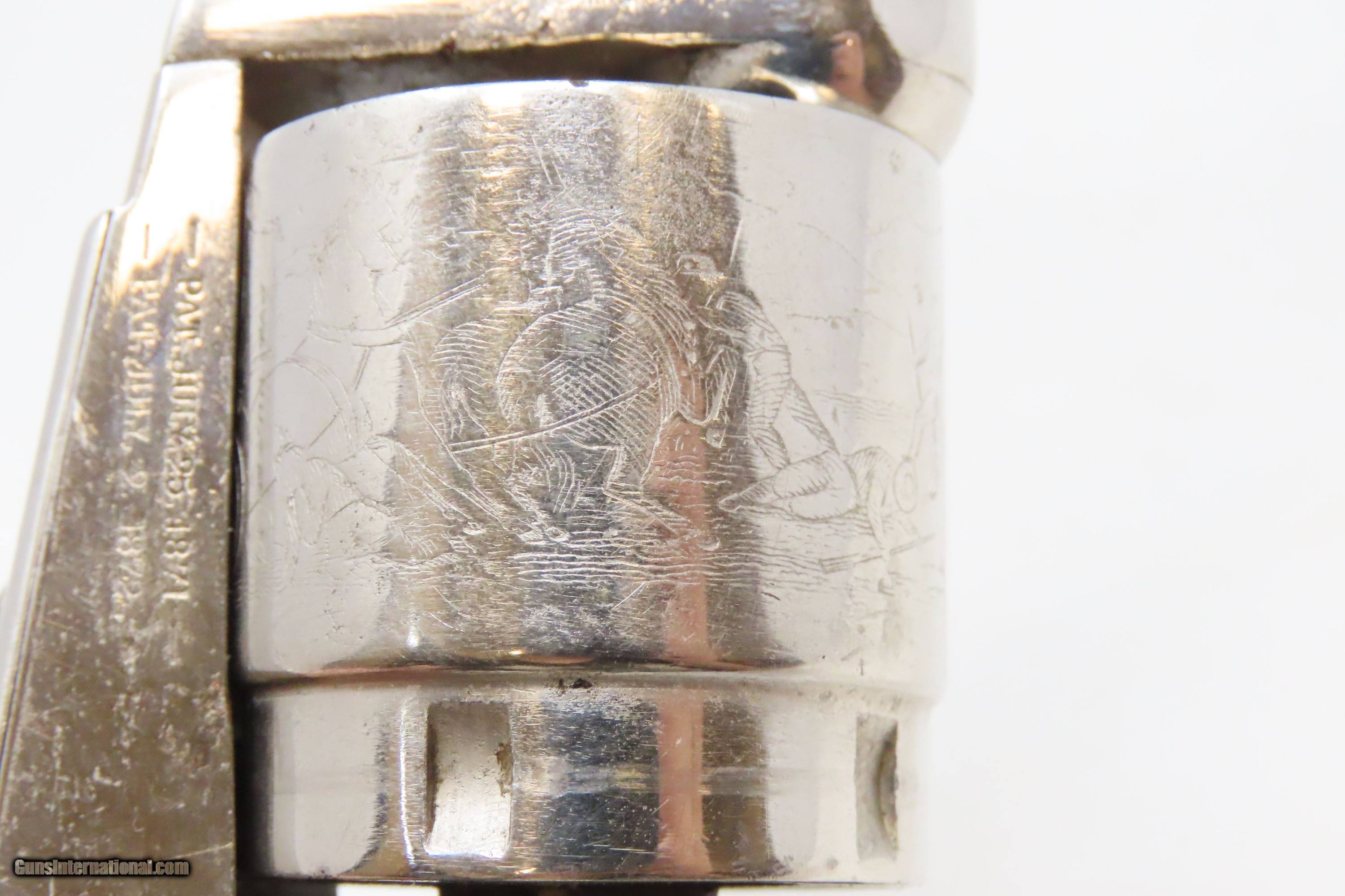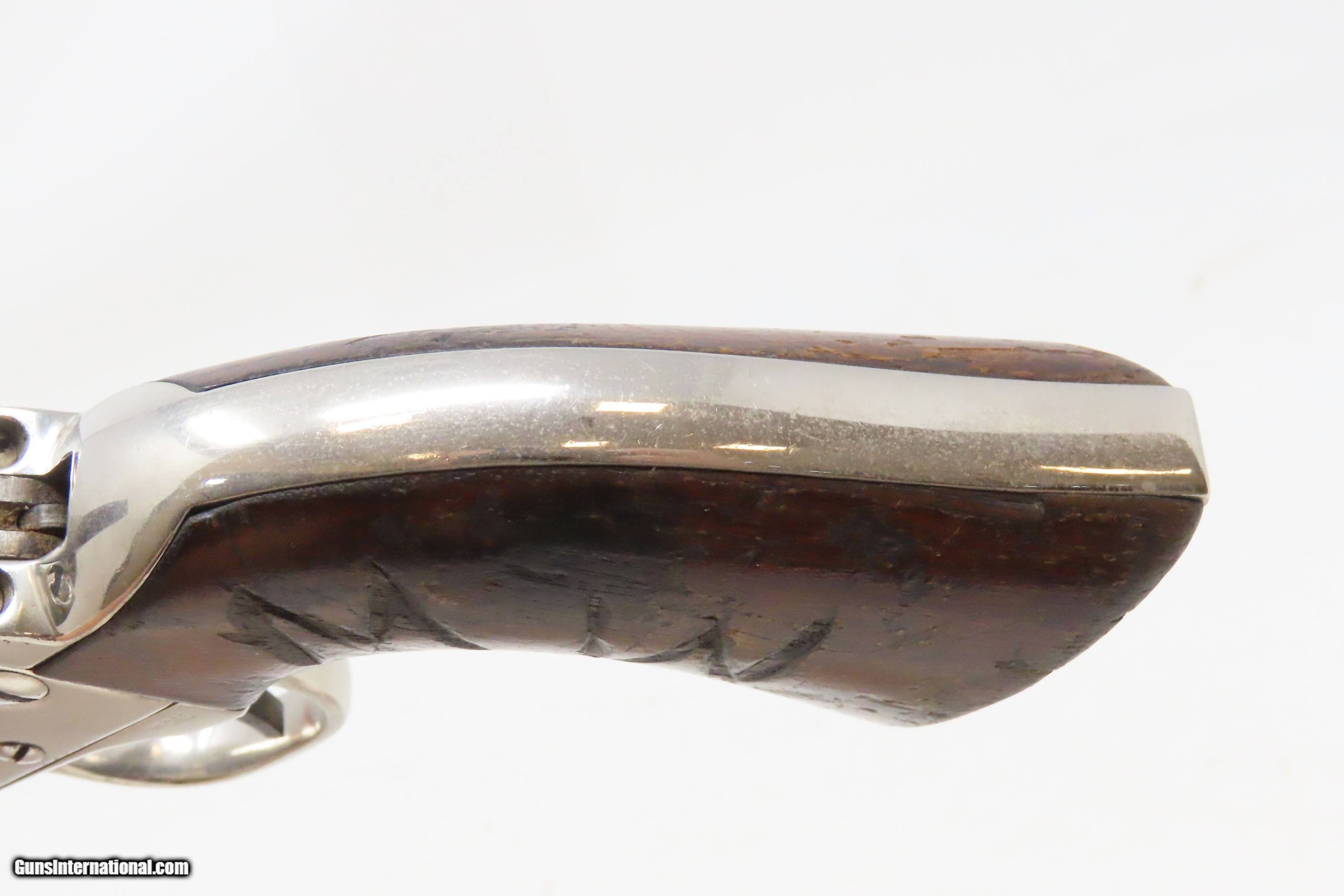 Description: Antique COLT 3-1/2 Inch ROUND BARREL Pocket Model CARTRIDGE .38 RF Revolver NICE 1 of 6500; Scarce CARTRIDGE CONVERSION Model Here we present a Colt Pocket Model Cartridge Revolver made circa 1873-1880 in Hartford, Connecticut. Reportedly 10,000 of these revolvers were manufactured between 1873 and 1880 using a mix of converted “on-hand” parts from the Model 1849 Pocket, the 1862 Police, and the Pocket Navy revolvers, along with newly manufactured components and sold into the 1880s. 6,500 of those were manufactured using converted percussion revolver parts and the rest were built using original cartridge components. It has standard markings and features and still sports the classic cylinder scene of the 1849 Pockets! One of the most aesthetically pleasing aspects of this pistol is its cylinder scene. Cylinder scenes during this period were common, especially for Colt, not only for their visual appeal, but because it made a revolver more difficult to forge. The scene on the 1849 Pocket is that of a stagecoach robbery. The focal point is the stagecoach drawn by four horses. A woman in a dress is seen framed in the doorway of the side of the coach. The driver is standing alongside wielding his pistol against multiple assailants as the horses rear and struggle against their harnesses. Several of the bandits lay dying on the ground, one tries to control the horses, two are running away and one is in the process of falling dead after being shot. Not a bad way to show interested buyers what a pistol like this would be good for. It did a fine job as a self-defense handgun for the average citizen in 19th Century America. The overall condition is near fine. Nicely finished in nickel some time ago. The action is excellent. The bore is very good with sharp rifling. The grips are solid with large initials “MW” in the left side. Own the original! This is a legitimate antique and not a reproduction. Barrel is 3-1/2 inches. Caliber: .38 Rimfire Overall condition as seen in photos. Very Fast. Very Safe. FREE SHIPPING WORLDWIDE. Delivered directly to your door by express mail! Guaranteed AUTHENTIC & Includes CERTIFICATE OF AUTHENTICITY. ancestryguns $1750 #233134 SOLD Antique: Yes |