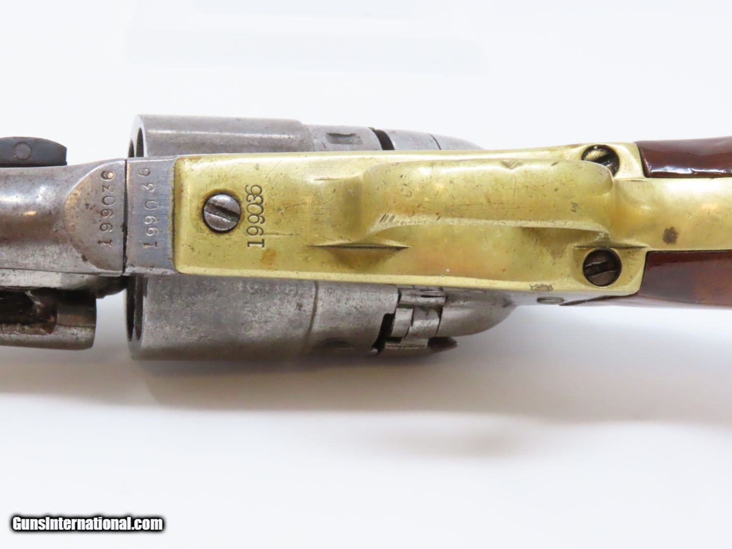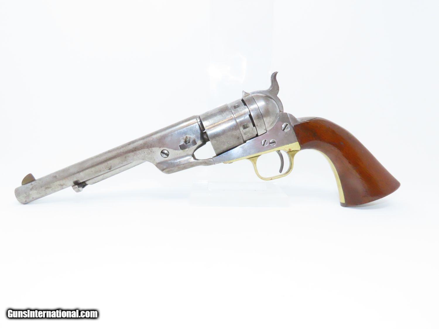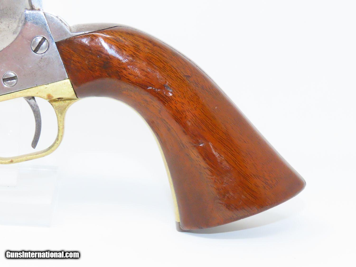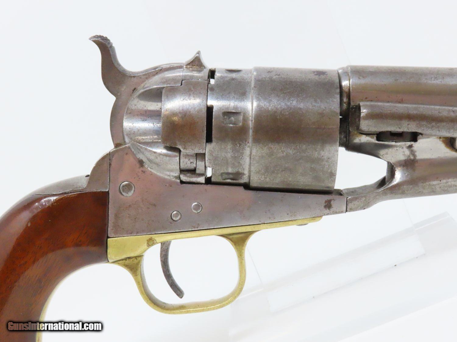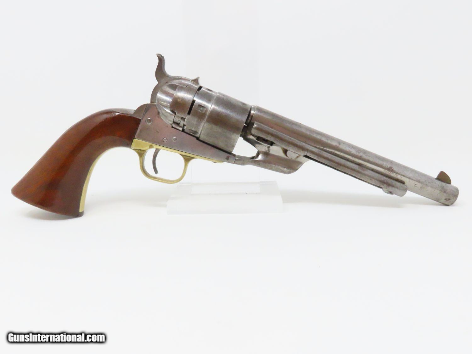 Description: Antique COLT M1860 ARMY RICHARDS Conversion .44 Caliber Centerfire REVOLVER SCARCE 1 of 9,000 Manufactured! Here we present an antique Colt Model 1860 Army Richards Conversion Revolver, manufactured circa 1871-78. Charles B. Richards was an engineer who worked for the Colt’s Patent Fire Arms Company and was awarded a patent for converting Colt percussion models to breech loading cartridge revolvers. After the onset of the American Civil War, Richards eventually became Superintendent of Engineering at the Colt factory in Hartford, Connecticut. Richards' first major post-Civil War design was Colt's second attempt at metallic cartridge conversion known as the "Richards Conversion". Colt's revolvers to this point had been black powder percussion pistols. However, the US Army wanted a revolver that held metallic cartridges, which Colt could not produce because the Rollin White patent was still held by rival Smith & Wesson. Colt's only solution would be to bore through the rear of their cylinders and devise a new method of ignition and case extraction. The Richards Conversion was performed on the Colt 1860 Army revolver. The caliber was .44 Colt and the loading lever was replaced by an ejector rod. This conversion added a breechplate with a firing pin and a rear sight mounted on the breechplate. Colt manufactured 9,000 of these revolvers between 1873 and 1878. In 1873 Colt performed the same conversion on the M1851 and M1861 revolvers for the US Navy in .38 rimfire. The Richards conversion was an instant success, all being done concurrently with the iconic Colt Single Action Army, which Richards was responsible for the development of! The 1860 Army was the single most used pistol of the American Civil War. Over 200,000 were made from 1860 to 1873, and 156,000 of those were made by the end of the war in 1865. The overall condition is very good. The action is strong. The bore is semi-bright in good condition. The grips are in great shape and the finish still shines. All the numbers match. Here is a fantastic example of the Richards Conversion to collect and display! Own the original! This is a legitimate antique and not a reproduction. Barrel is 6-3/4 inches. Caliber: .44 Centerfire Overall condition as seen in photos. Very Fast. Very Safe. FREE SHIPPING WORLDWIDE. Delivered directly to your door by express mail! Guaranteed AUTHENTIC & Includes CERTIFICATE OF AUTHENTICITY. ancestryguns $3195 #20782 SOLD Antique: Yes |