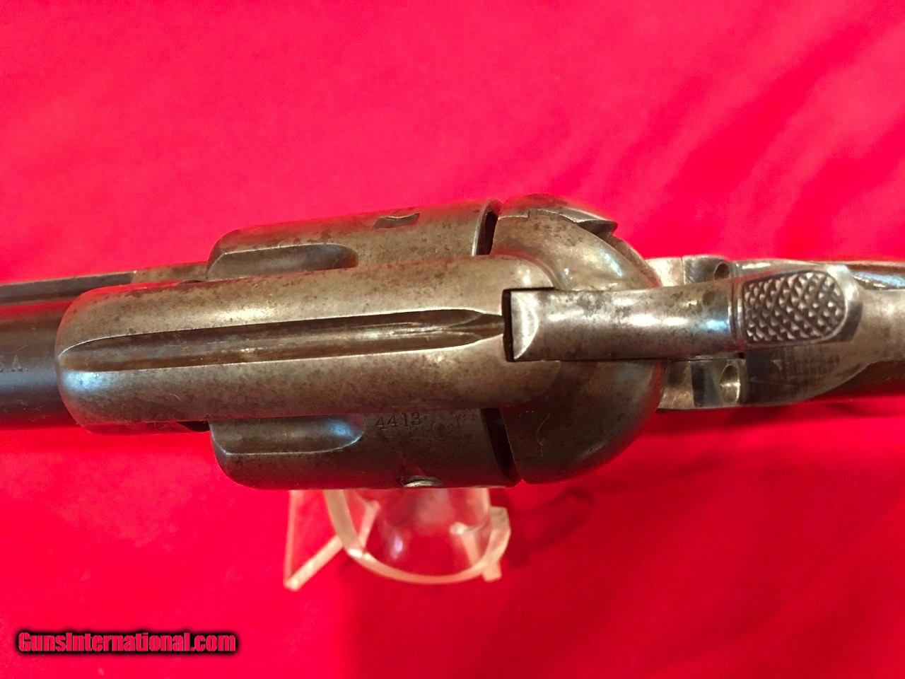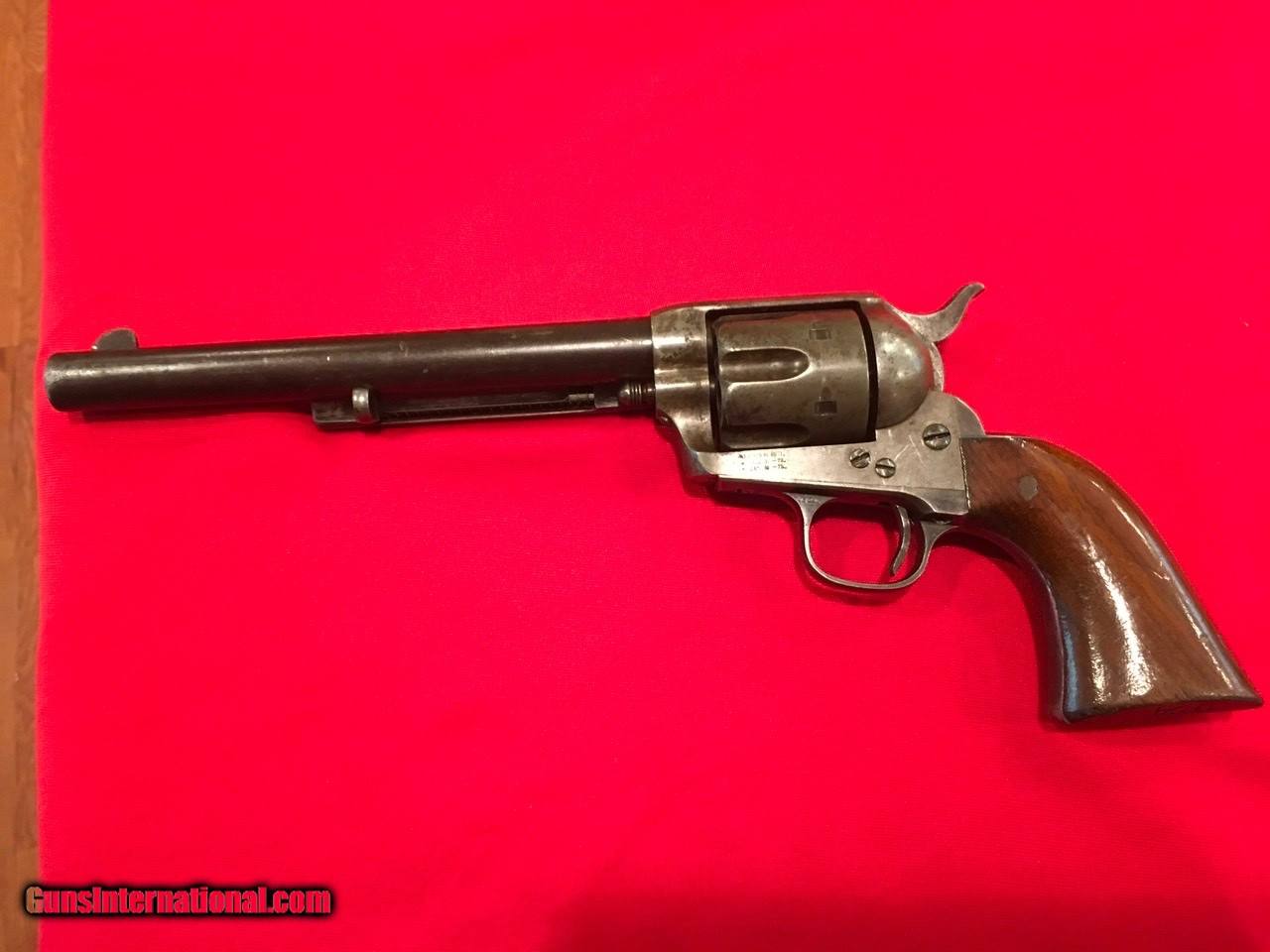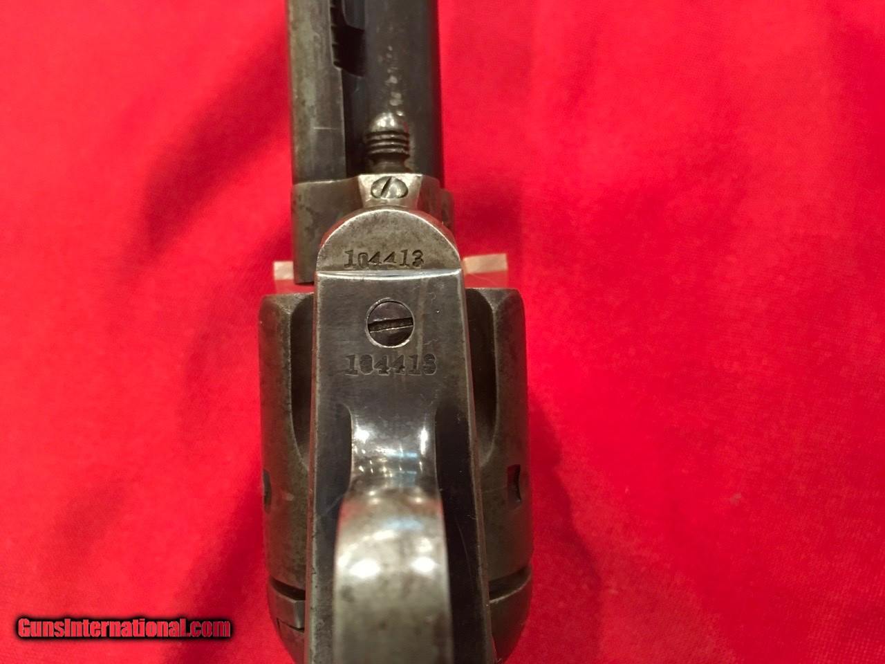 Description: Sale Pending Handsome, antique, Colt Single Action Army with archive record keeping error. Serial number 104413 matches on the frame, triggerguard and backstrap with the last four digits on the cylinder and on the barrel under the ejector housing. Comes with a Colt Archive letter that lists the features as .45/c caliber, 4 3/4" barrel, blue finish with stocks not listed. It was shipped to E.C. Meacham Arms Company in St. Louis, MO on December 22, 1883 in a shipment of 50 guns. This Colt is 100% original from the 7 1/2" barrel (correctly numbered, see photos) to the factory, wood grips with most of the original varnish. This type of error is not that unusual, I have seen several record keeping errors similar to this. The action functions flawlessly and the bore is good. The factory applied markings are all clear and crisp. There are nice areas of original factory blue throughout and traces of case colors in the protected areas. Price includes insurance and shipping to the continental United States where legal. A three day inspection is offered with full refund if returned unfired in the same condition. Buyer to pay return shipping. Please let me know if you have any questions or need additional photos. I would consider trades and all offers. SOLD Antique: Yes |