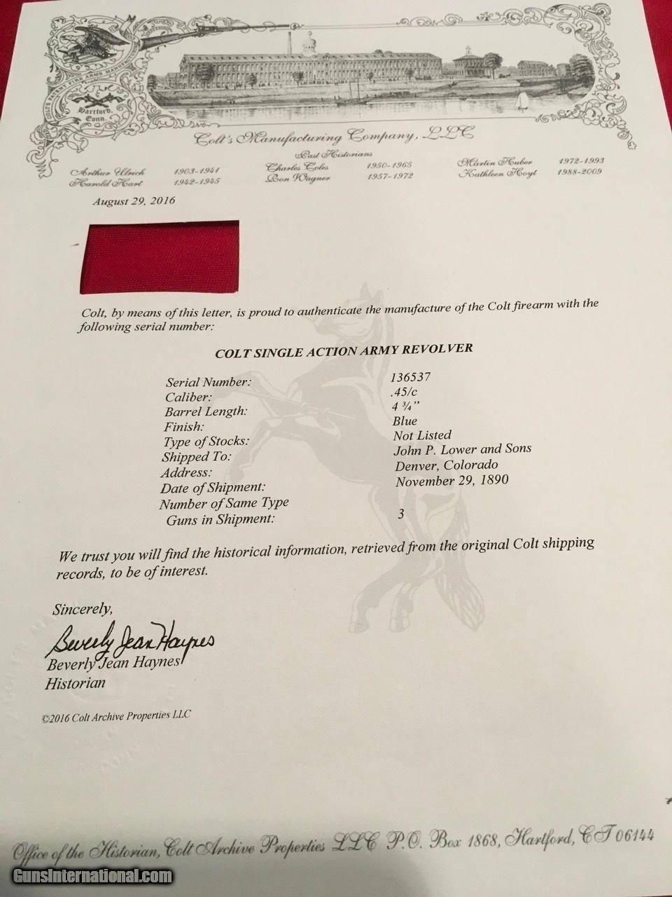ANTIQUE, COLT SAA .45 SHIPPED to J.P. LOWER, DENVER 1890
