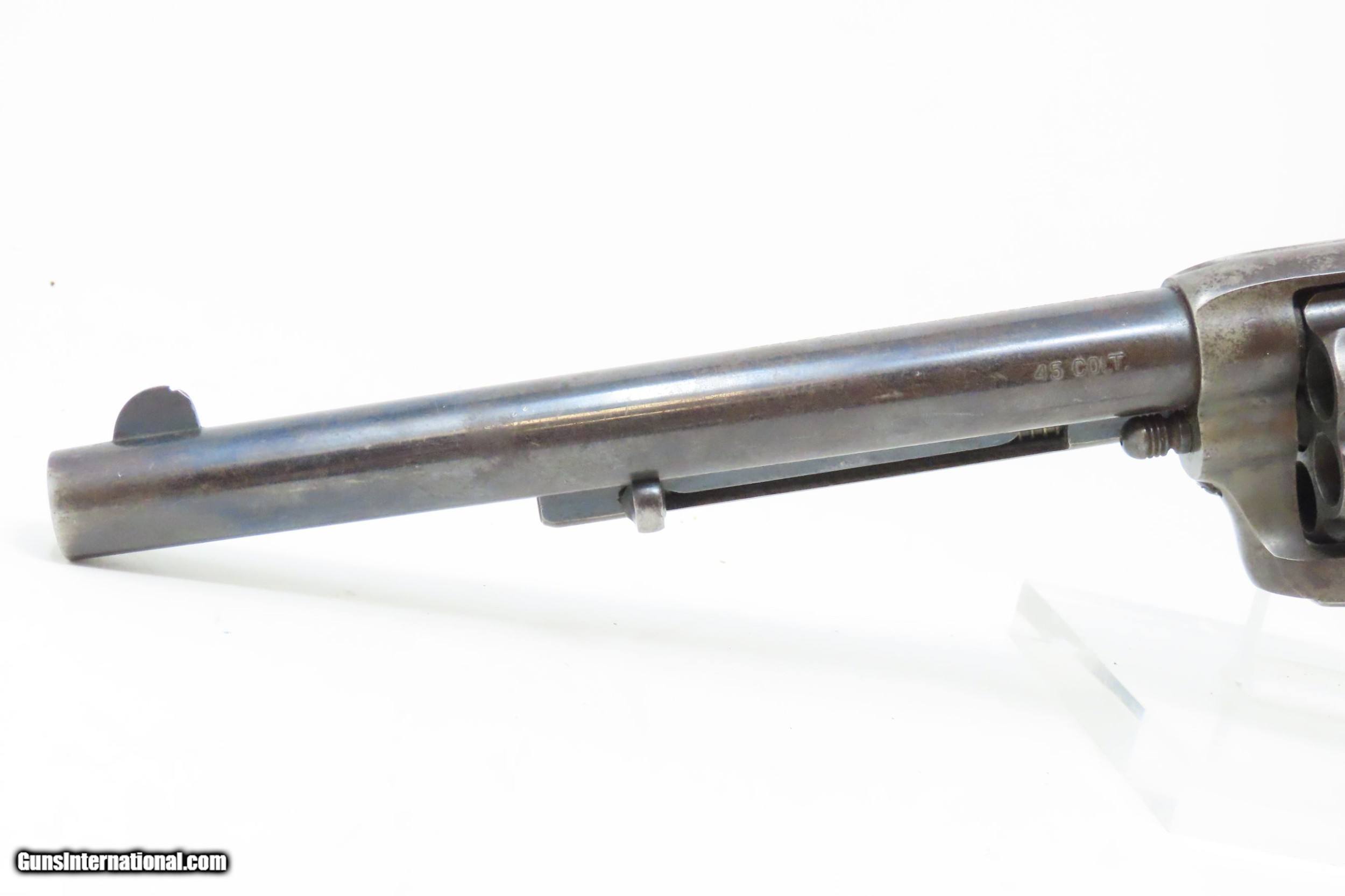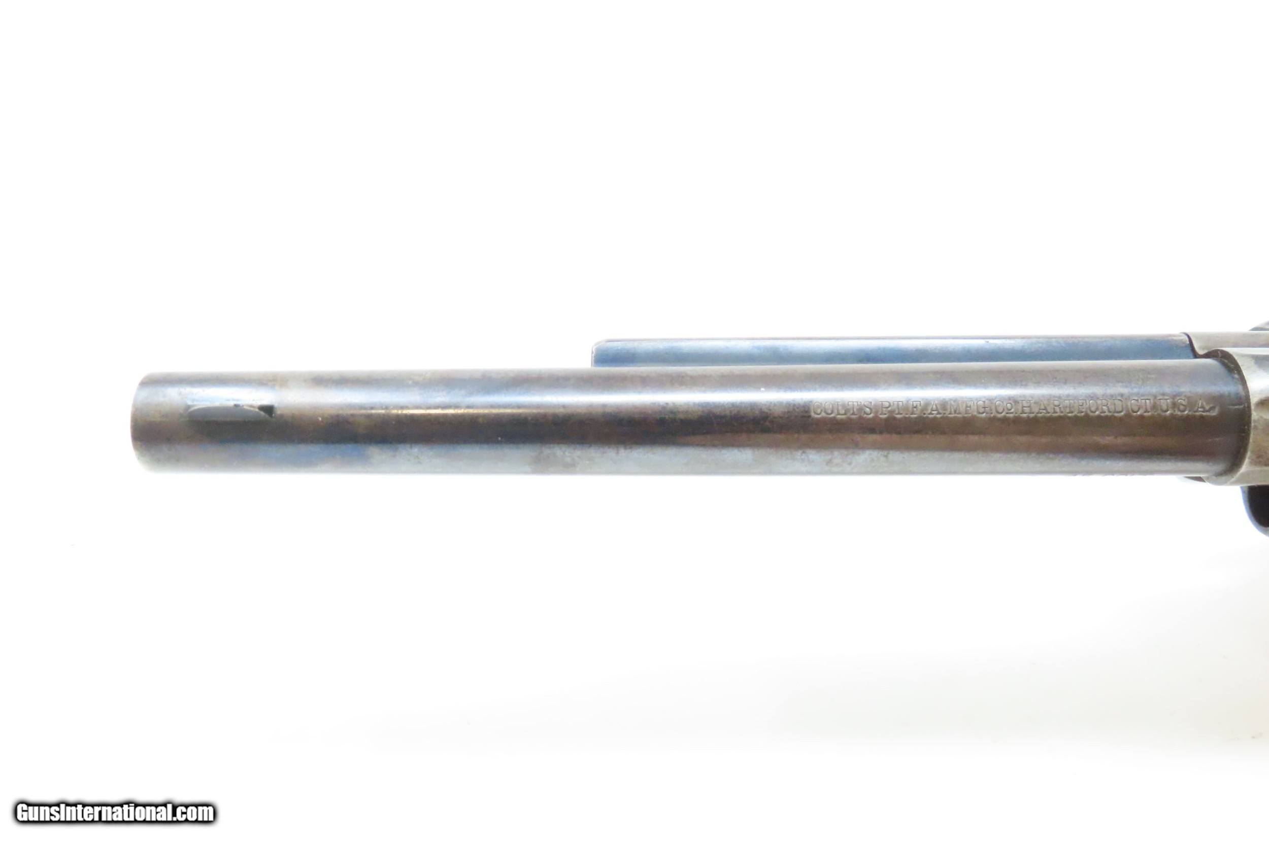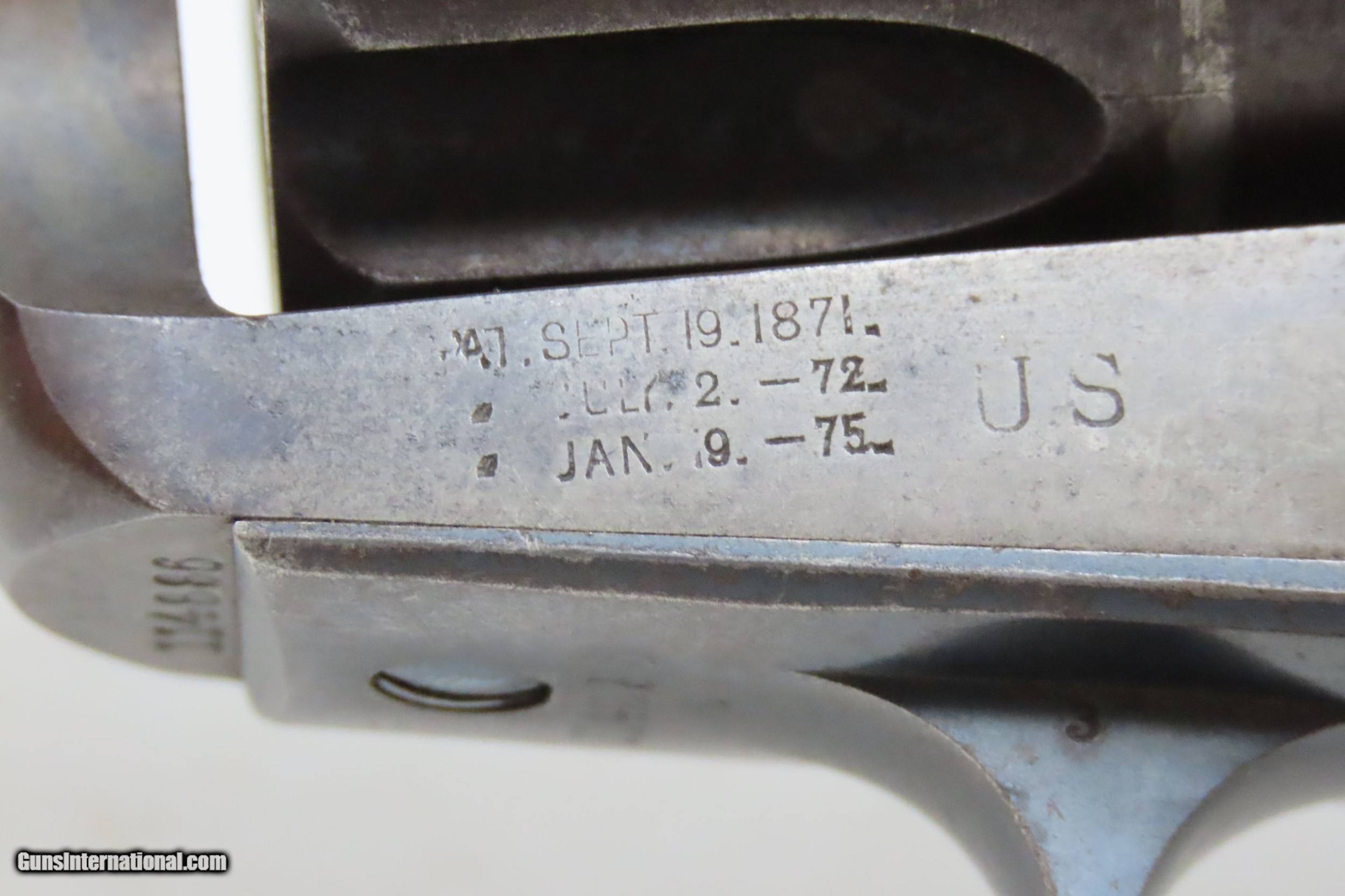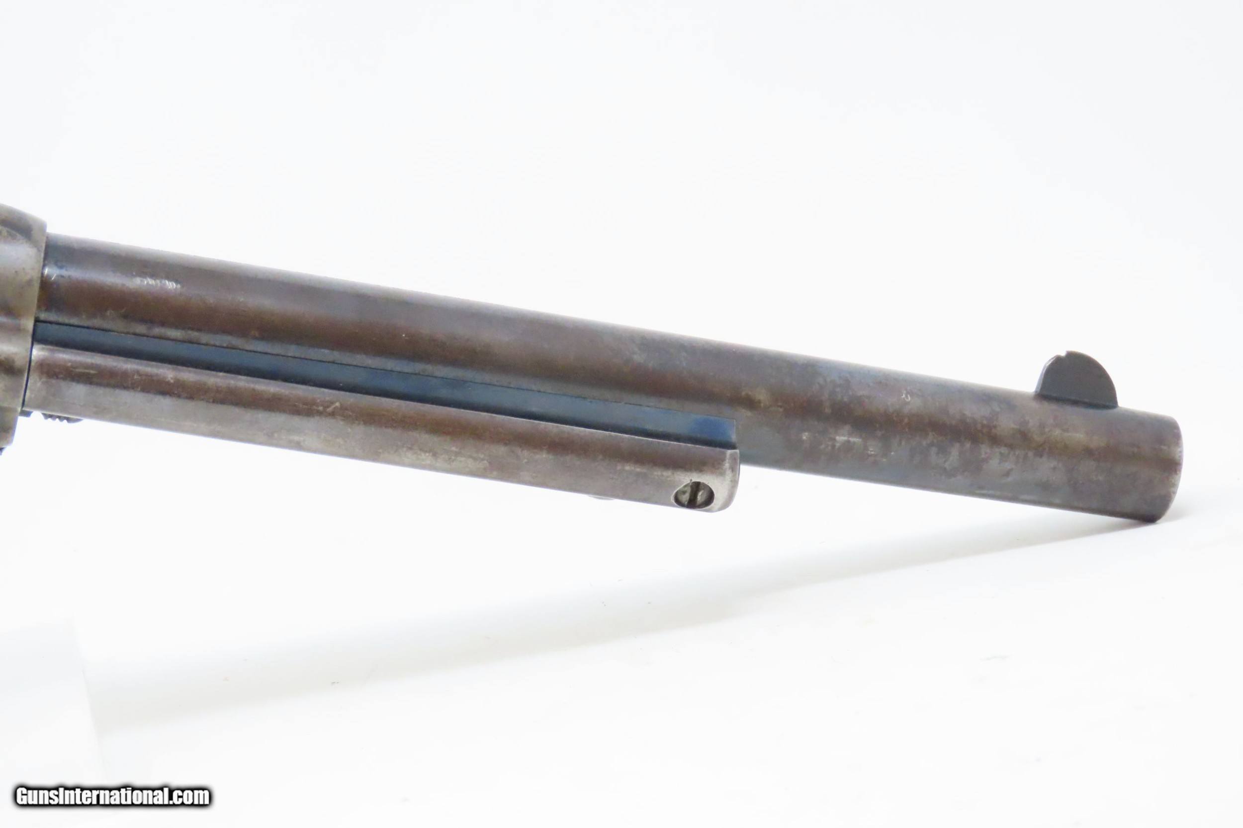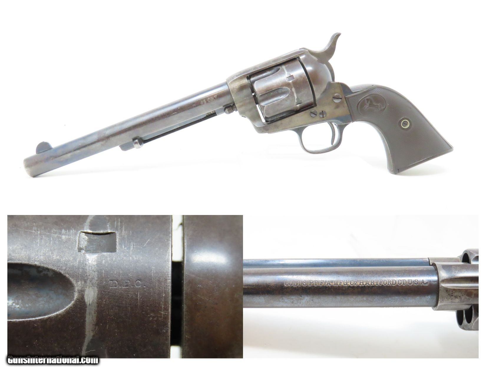 Description: Antique GOVT Contract US CAVALRY COLT SAA Revolver DAVID F. CLARK Inspected Iconic COLT .45 Made in 1885 Here we present an antique Colt Cavalry Model Single Action Army Revolver, manufactured in 1885 in Hartford, Connecticut. Though Colt enjoyed the largest contracts of any handgun maker during the American Civil War, it had to rely on its array of percussion fired revolvers, namely the 1860 Army until the Smith & Wesson owned Rollin White Patent expired in 1869. This enabled them to begin making revolvers with completely bored through cylinder chambers in order to utilize modern metallic cartridge ammunition in the most effective manner. In 1869, Colt’s began development of a suitable cartridge revolver in earnest, first coming out with a number of conversions for their percussion lines, until 1872 when they debuted what was to become the Colt Model 1873 Single Action Army in the 1872 U.S. Trials. Needless to say, it won, and became the Army’s revolver of choice. It also became the sidearm of choice for many others like cowboys, guards, lawmen, crooks, shopkeepers and all manner of civilians. This particular Colt Single Action Army Revolver is intriguing, to say the least. It features the 7-1/2 inch barrel of the cavalry model and it was inspected by David F. Clark. His initials may be observed on the bottom of the frame and on the cylinder. Single letter sub-inspector marks (“G”) are also found throughout. The left side of the frame was stamped “U.S.” as the final acceptance mark. The top of the barrel is marked “COLT’S PT.F.A. MFG. CO. HARTFORD, CT. U.S.A.” and is a later replacement that lacks the inspection markings and matching serial number. The rampant Colt trademarked hard rubber grips are also replacements. The left side of the frame is marked with patent dates in the years 1871, 1872 and 1875, along with the U.S. marking. It has a blade front and frame notch rear sights. The overall condition is near fine. Nice blue finish on the barrel and the trigger guard. Most likely armory refinished at some point. Good case colors on the frame. The action is excellent. The bore is bright and reflective with sharp rifling. The grips are in nice shape. Numbers match on the grip frame, trigger guard, frame, and cylinder. Own the original! This is a legitimate antique and not a reproduction. Barrel is 7-1/2 inches. Caliber: .45 Colt Overall condition as seen in photos. Very Fast. Very Safe. FREE SHIPPING WORLDWIDE. Delivered directly to your door by express mail! Guaranteed AUTHENTIC & Includes CERTIFICATE OF AUTHENTICITY. ancestryguns $8115 #217835 SOLD Antique: Yes |