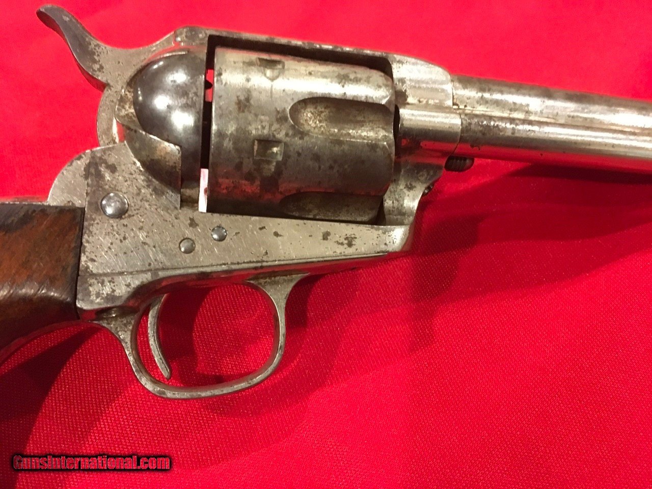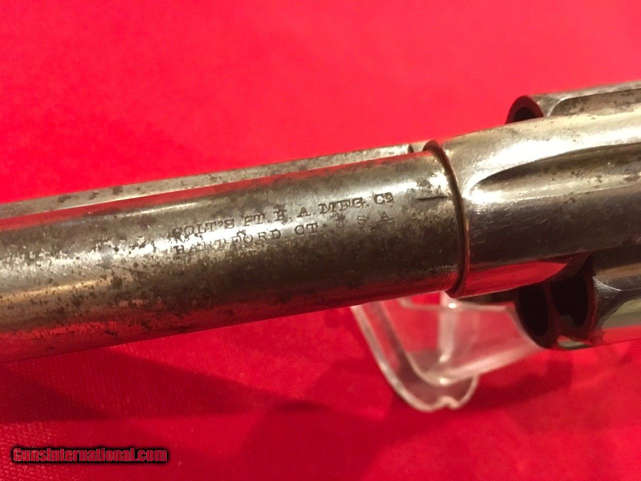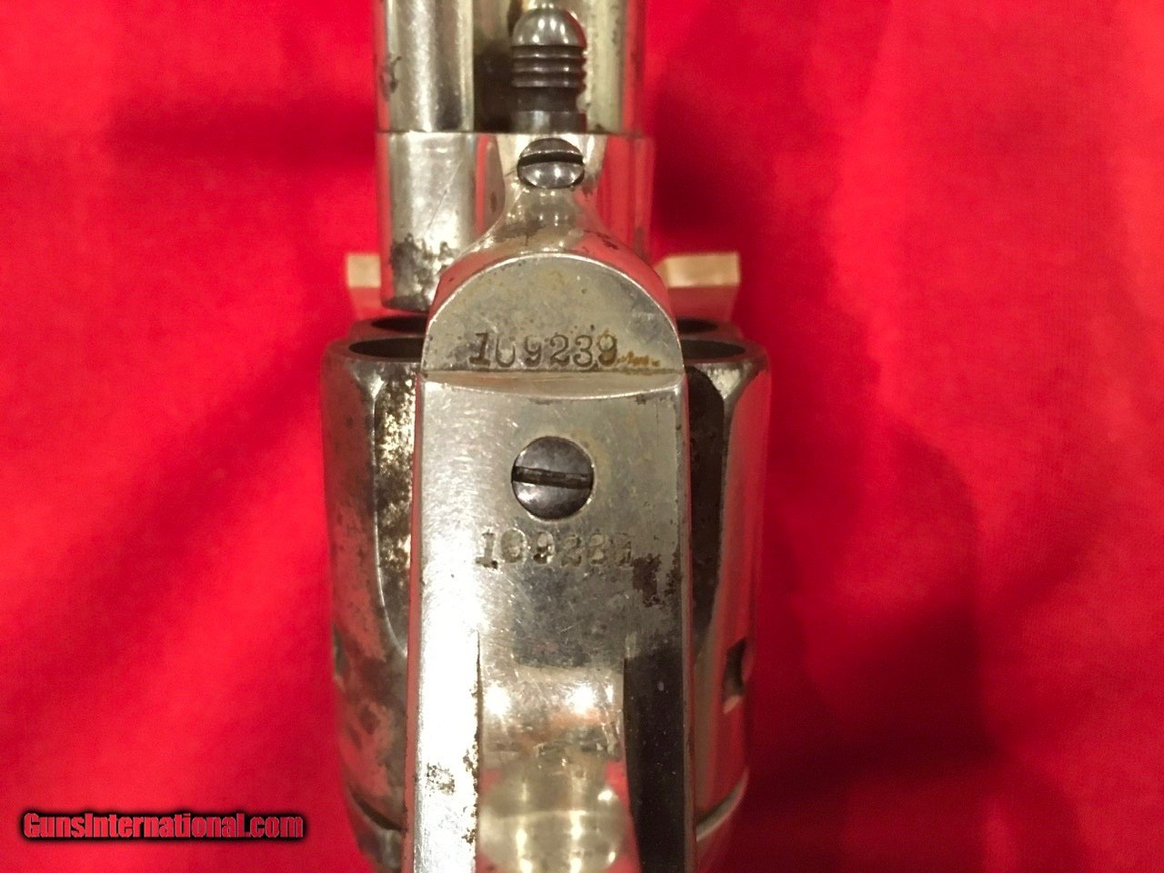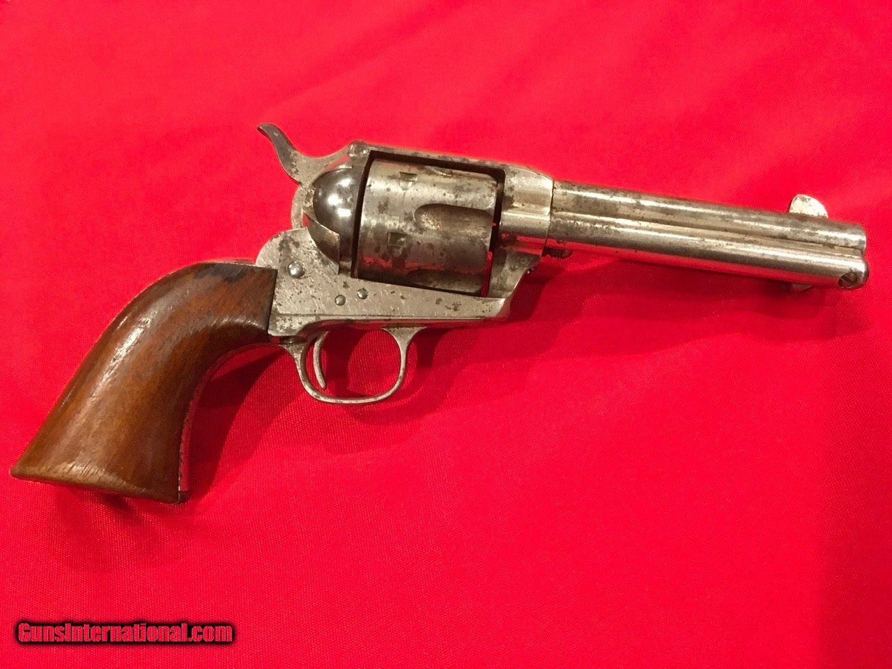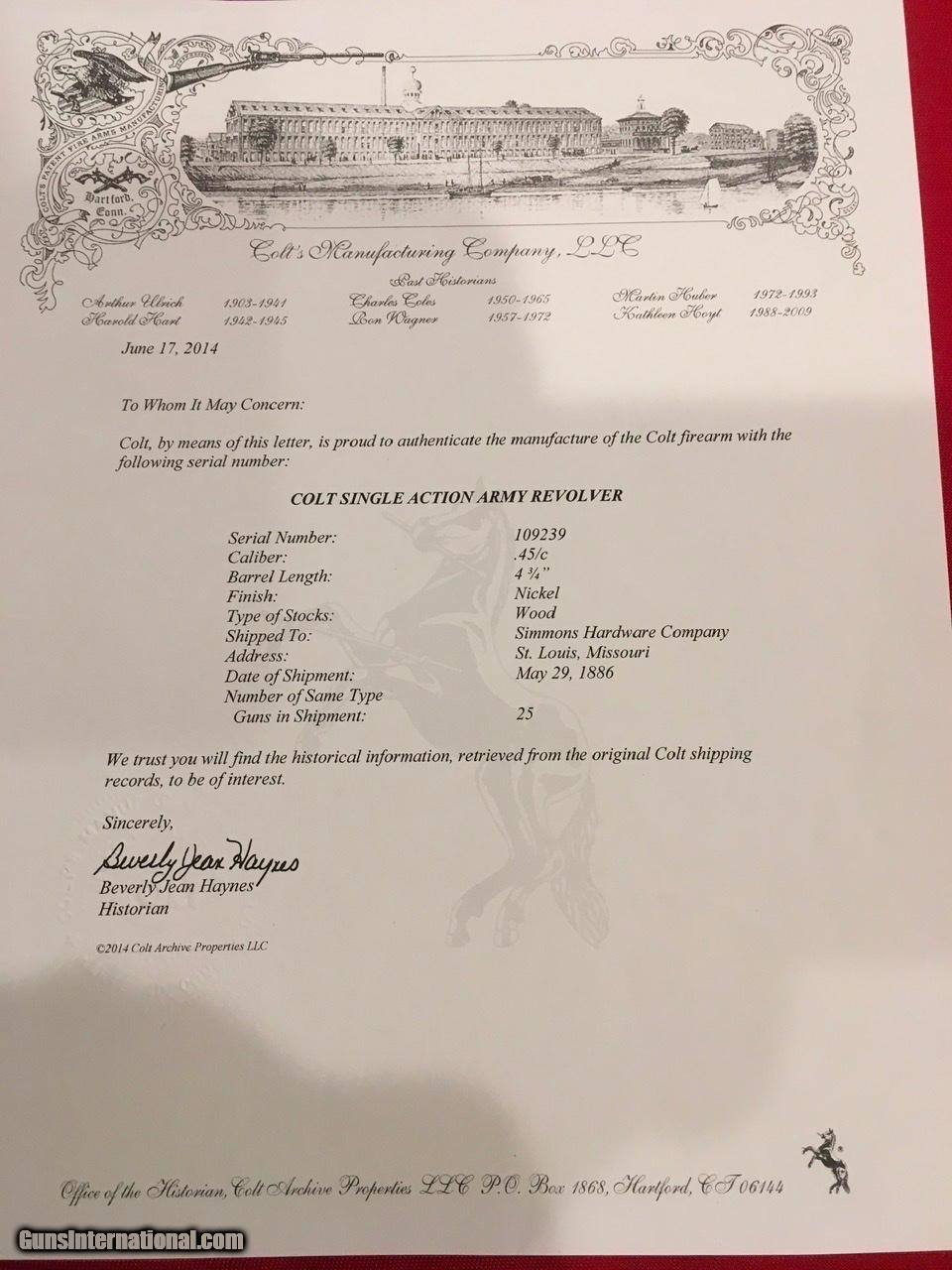 Description: Colt Single Action Army in scarce configuration of short barrel, nickel and original wood grips. Serial number 109239 matches on the frame, triggerguard and backstrap. Comes with a Colt Archive letter that confirms the features as .45/c caliber, 4 3/4" barrel, nickel finish with wood stocks that was shipped to Simmons Hardware Company of St. Louis, MO on May 29, 1886 in a shipment of 25 guns. The wood grips fit properly and have a significant amount of original varnish remaining. There is a high percentage of original nickel remaining that is mixed with dark patina and minor roughness. The factory applied markings are all clear and readable. The action functions properly and locks up solid. The bore is very good+. Price includes insurance and shipping to the continental United States where legal. A three day inspection is offered with full refund if returned unfired in the same condition. Buyer to pay return shipping. Please let me know if you have any questions or need additional photos. SOLD Antique: Yes |