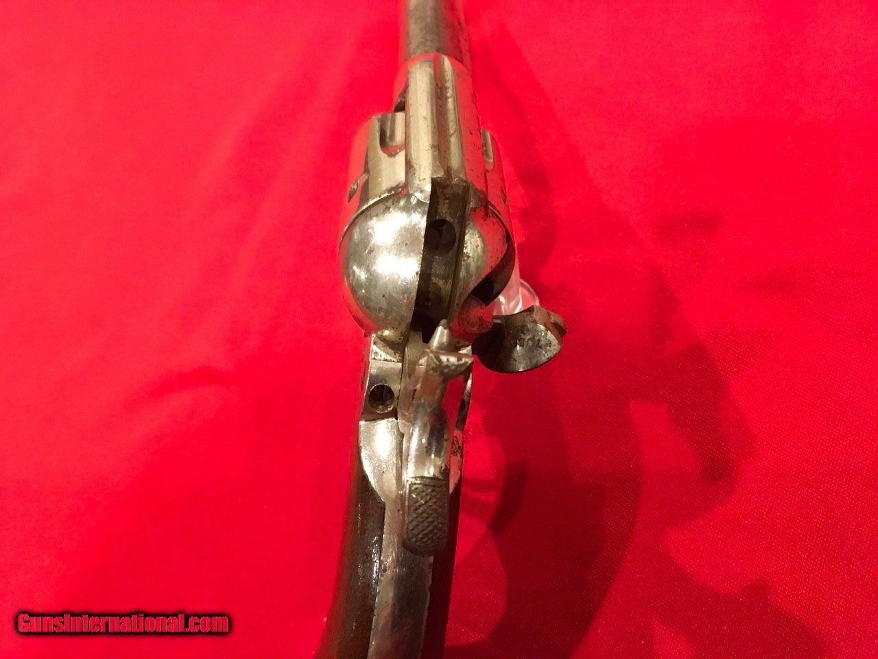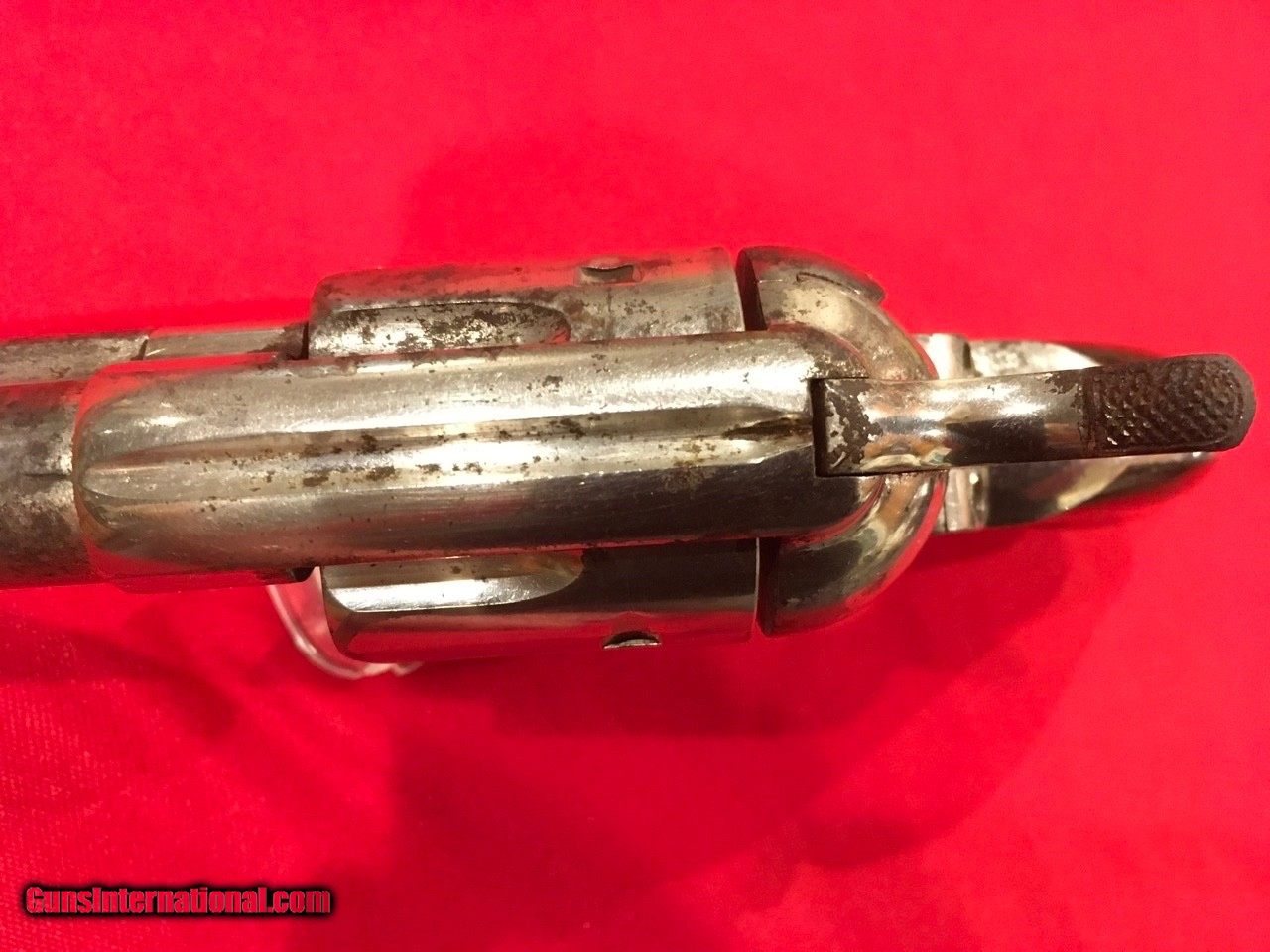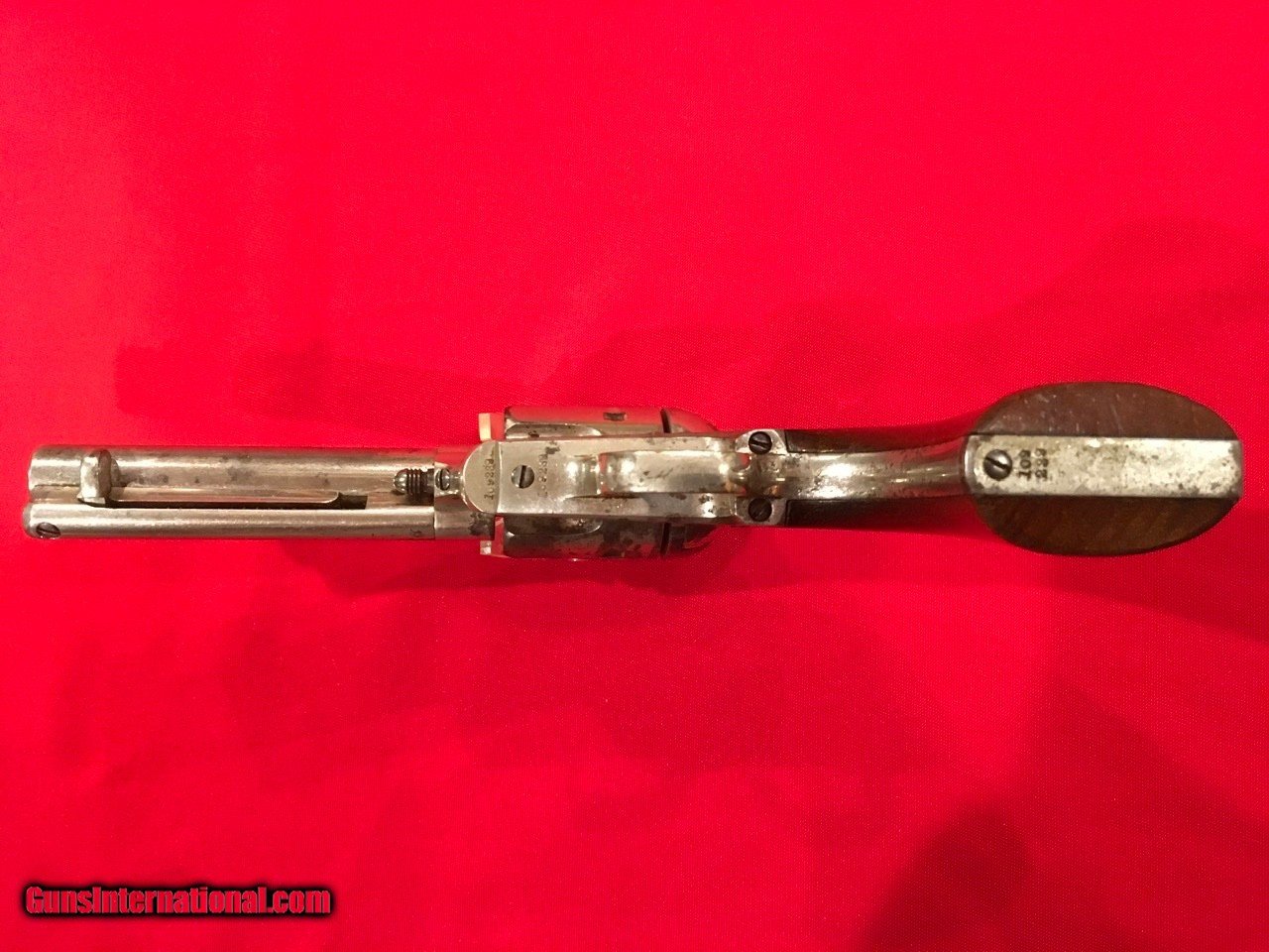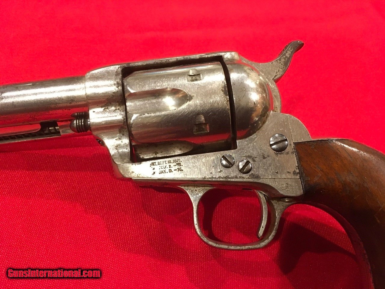 Description: Colt Single Action Army in scarce configuration of short barrel, nickel and original wood grips. Serial number 109239 matches on the frame, triggerguard and backstrap. Comes with a Colt Archive letter that confirms the features as .45/c caliber, 4 3/4" barrel, nickel finish with wood stocks that was shipped to Simmons Hardware Company of St. Louis, MO on May 29, 1886 in a shipment of 25 guns. The wood grips fit properly and have a significant amount of original varnish remaining. There is a high percentage of original nickel remaining that is mixed with dark patina and minor roughness. The factory applied markings are all clear and readable. The action functions properly and locks up solid. The bore is very good+. Price includes insurance and shipping to the continental United States where legal. A three day inspection is offered with full refund if returned unfired in the same condition. Buyer to pay return shipping. Please let me know if you have any questions or need additional photos. SOLD Antique: Yes |