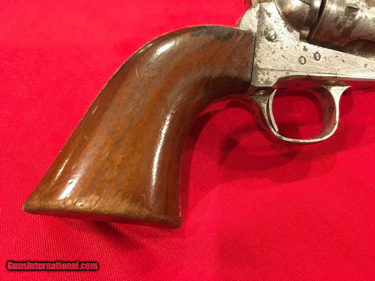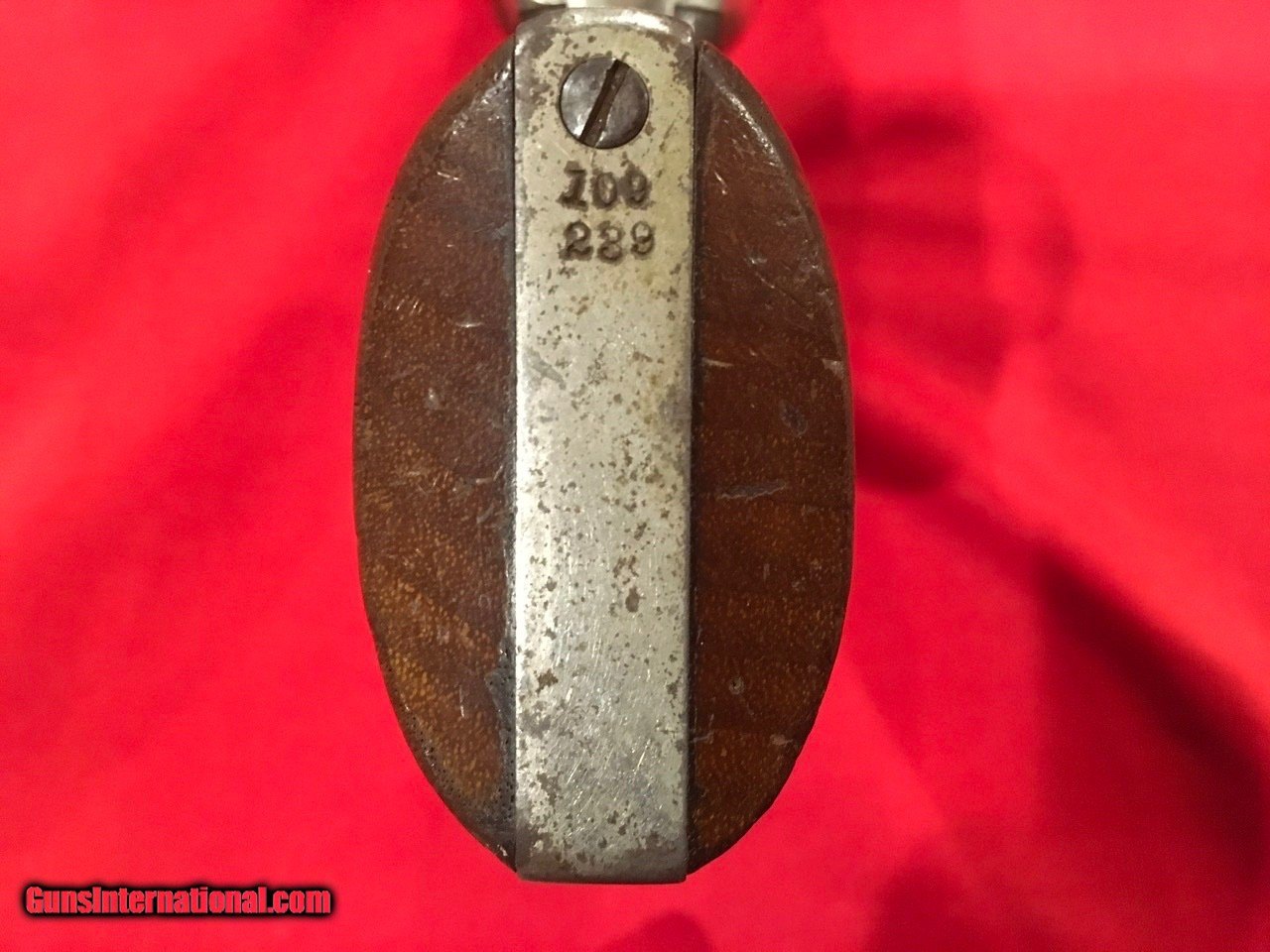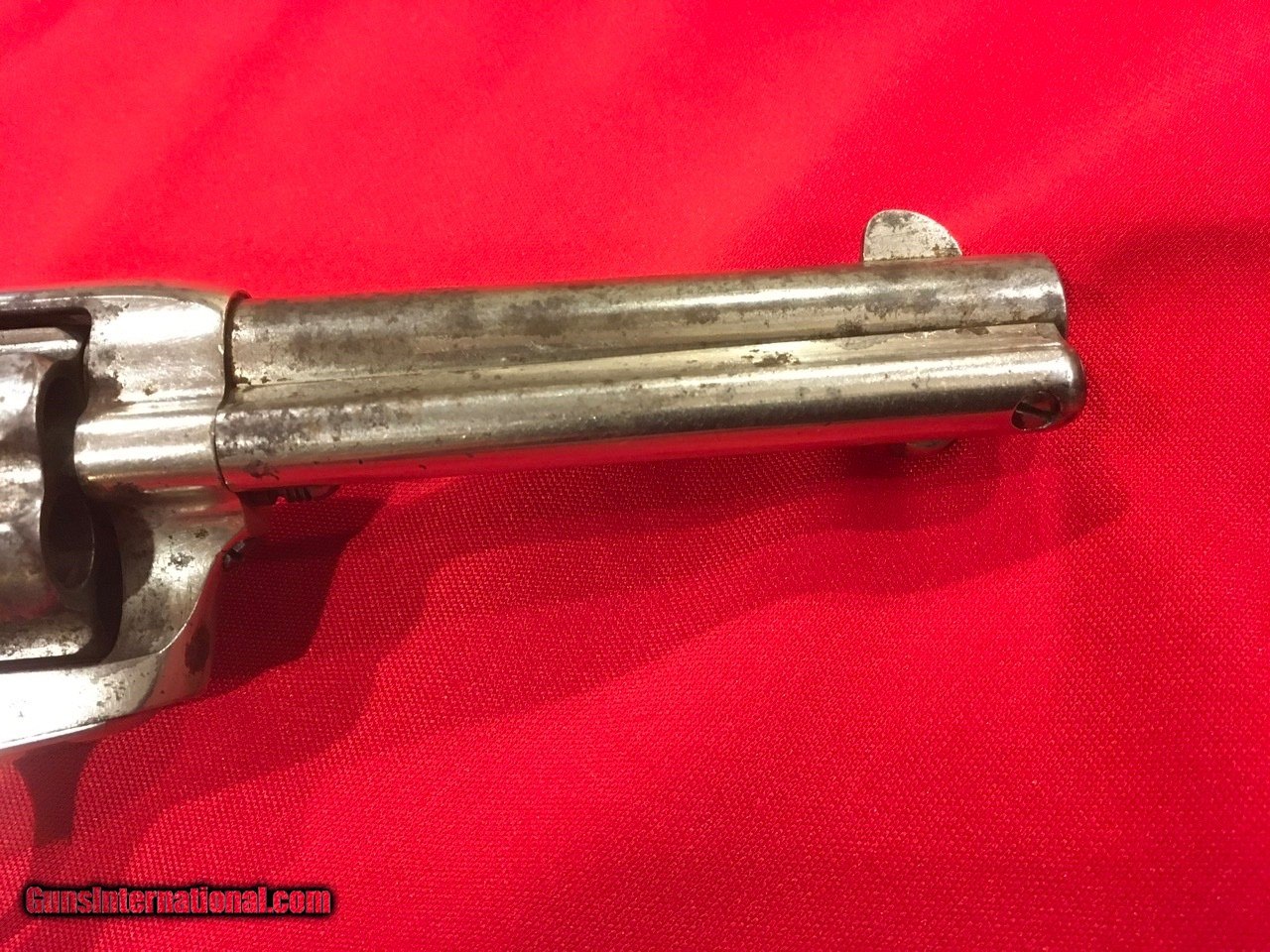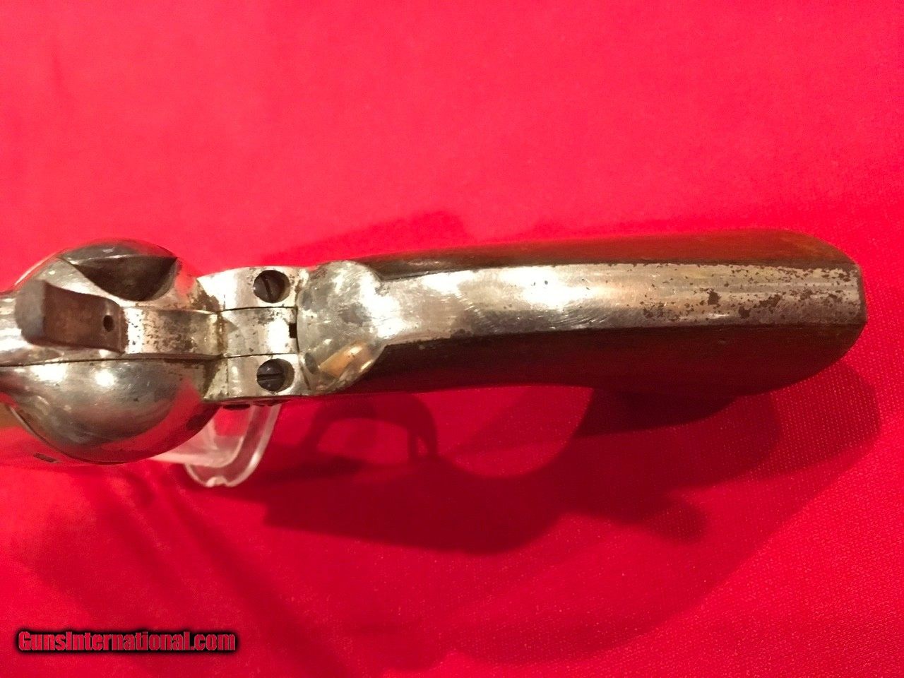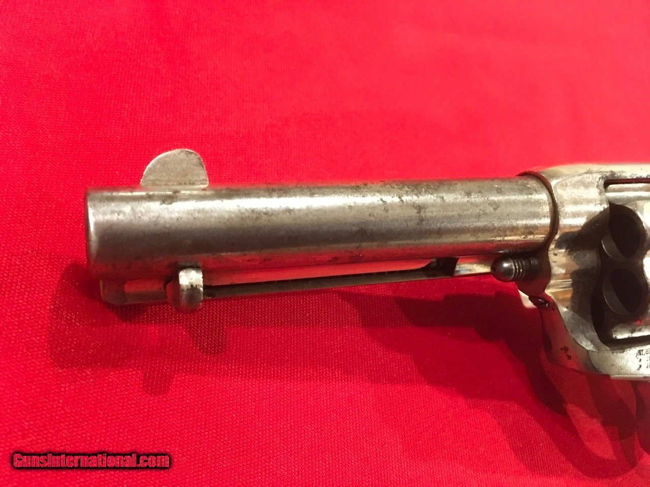 Description: Colt Single Action Army in scarce configuration of short barrel, nickel and original wood grips. Serial number 109239 matches on the frame, triggerguard and backstrap. Comes with a Colt Archive letter that confirms the features as .45/c caliber, 4 3/4" barrel, nickel finish with wood stocks that was shipped to Simmons Hardware Company of St. Louis, MO on May 29, 1886 in a shipment of 25 guns. The wood grips fit properly and have a significant amount of original varnish remaining. There is a high percentage of original nickel remaining that is mixed with dark patina and minor roughness. The factory applied markings are all clear and readable. The action functions properly and locks up solid. The bore is very good+. Price includes insurance and shipping to the continental United States where legal. A three day inspection is offered with full refund if returned unfired in the same condition. Buyer to pay return shipping. Please let me know if you have any questions or need additional photos. SOLD Antique: Yes |