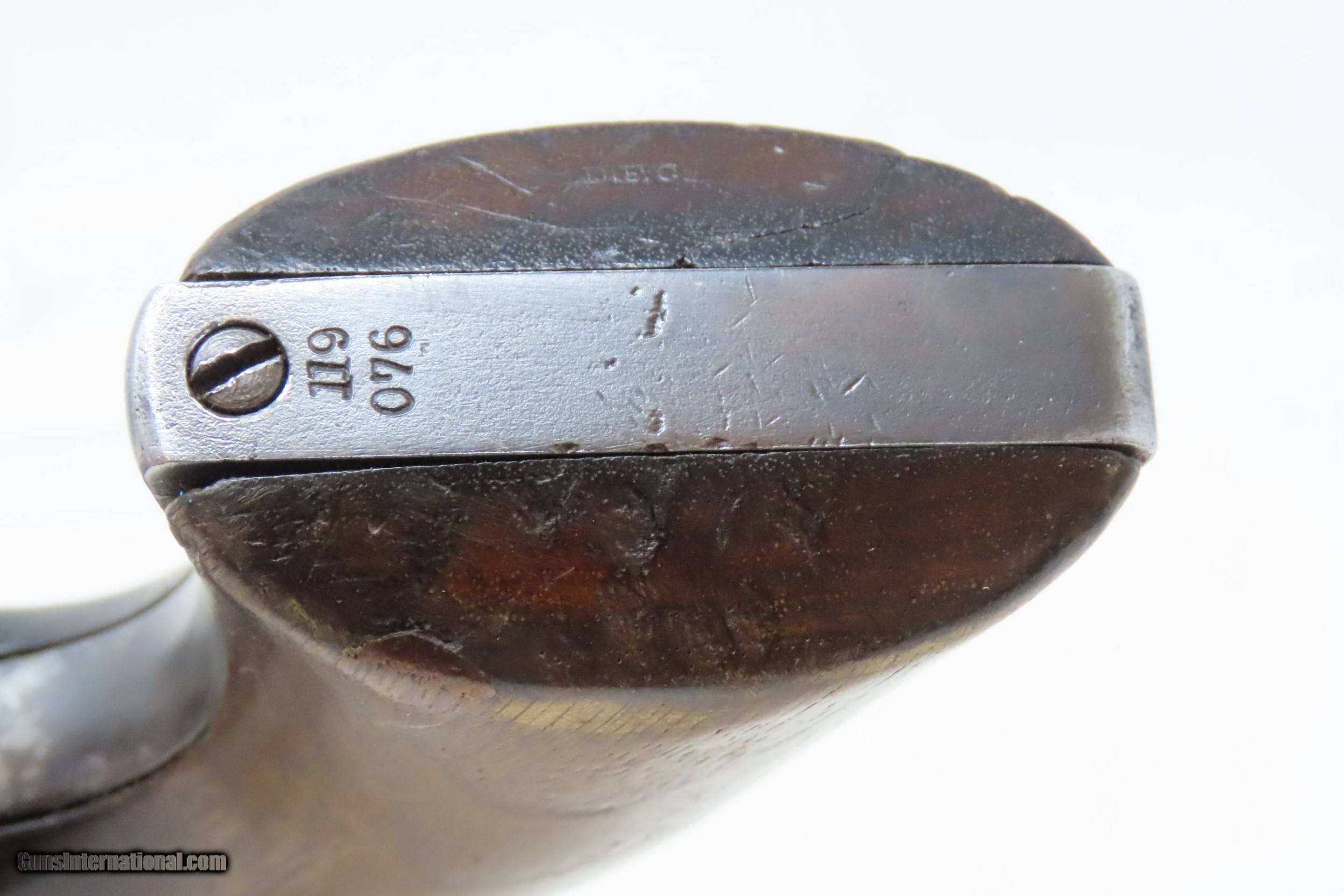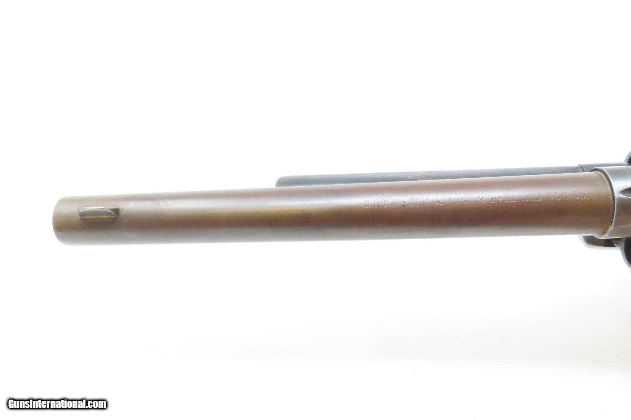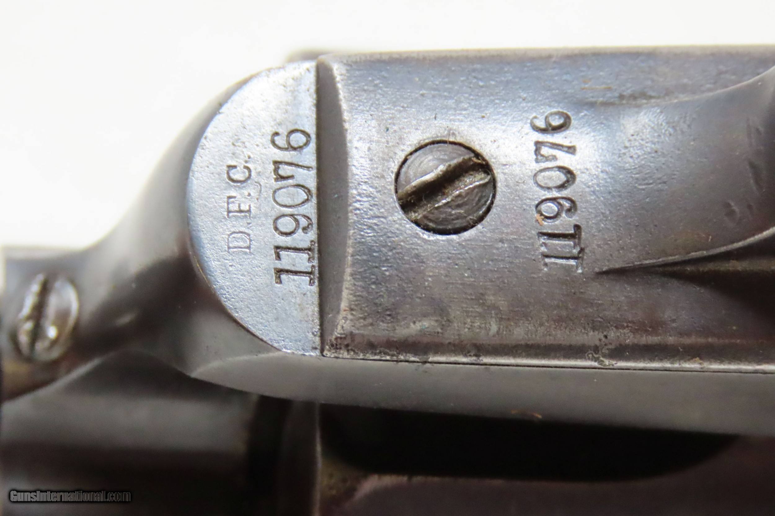 Description: Antique U.S. CAVALRY Model 1873 COLT SAA Revolver DAVID F. CLARK Inspected Iconic COLT .45 “PEACEMAKER” with U.S. HOLSTER RIG Here we present an antique Colt Cavalry Model Single Action Army Revolver, manufactured in 1887 in Hartford, Connecticut. Though Colt enjoyed the largest contracts of any handgun maker during the American Civil War, it had to rely on its array of percussion fired revolvers, namely the 1860 Army until the Smith & Wesson owned Rollin White Patent expired in 1869. This enabled them to begin making revolvers with completely bored through cylinder chambers in order to utilize modern metallic cartridge ammunition in the most effective manner. In 1869, Colt’s began development of a suitable cartridge revolver in earnest, first coming out with a number of conversions for their percussion lines, until 1872 when they debuted what was to become the Colt Model 1873 Single Action Army in the 1872 U.S. Trials. Needless to say, it won, and became the Army’s revolver of choice. It also became the sidearm of choice for many others like cowboys, guards, lawmen, crooks, shopkeepers and all manner of civilians. This Colt Single Action Army Revolver was inspected by David F. Clark. His initials may be observed in multiple locations on this revolver. Single letter sub-inspector marks are also found throughout. The left side of the frame was stamped “U.S.” as the final acceptance mark. The top of the barrel is marked “COLT’S PT.F.A. MFG. CO. HARTFORD, CT. U.S.A.” The left side of the frame is marked with patent dates in the years 1871, 1872 and 1875, along with the U.S. marking. It has a blade front and frame notch rear sights, fitted with a smooth one-piece walnut grip. “1887” dated cartouche on the left grip with DFC initials on the bottom. The belt and holster rig are original. The belt is maker marked though faint and difficult to read. The buckle features the federal eagle with “E PLURIBUS UNUM” in a banner clutched in the eagle’s beak. The holster was made by Lanz, Owen & Co. of Chicago, Illinois. They had a shop at 183 ½ - 189 Lake Street. Lanz was a German immigrant and Owen was a Welsh immigrant. Their work was top-notch and these remain in fantastic condition. These revolvers saw the end of the Indian Wars as well as the Spanish American & Philippine American Wars. There is a lot of history here. The overall condition is very good. This revolver has been moderately refinished and has been furnished with a new barrel which has been marked to match the rest of the gun both in number and with regard to inspection markings. Excellent action—all 4 clicks that hold firm in safety, half-cock, and full-cock notches. The cylinder indexes and locks up properly. The grip is in good shape with wear apparent and a short split along the grain. A cartouche remnant visible on the left side which is dated 1887 with the initials beneath a bit worn. The included holster rig is in near fine condition and very rare in its own right as leather tends to deteriorate long before the guns they were made to hold do. Own the original! This is a legitimate antique and not a reproduction. Barrel is 7-1/2 inches. Caliber: .45 Long Colt Overall condition as seen in photos. Very Fast. Very Safe. FREE SHIPPING WORLDWIDE. Delivered directly to your door by express mail! Guaranteed AUTHENTIC & Includes CERTIFICATE OF AUTHENTICITY. ancestryguns $9235 #217213 SOLD Antique: Yes |
